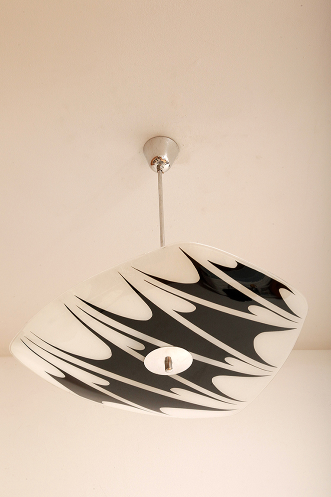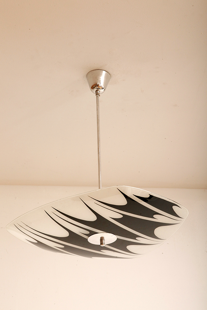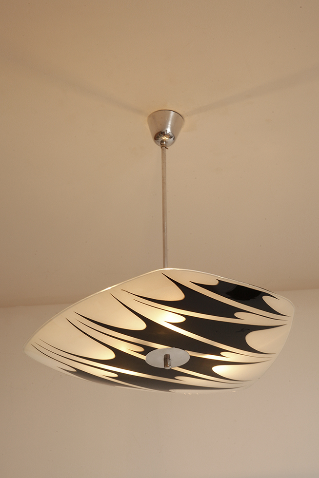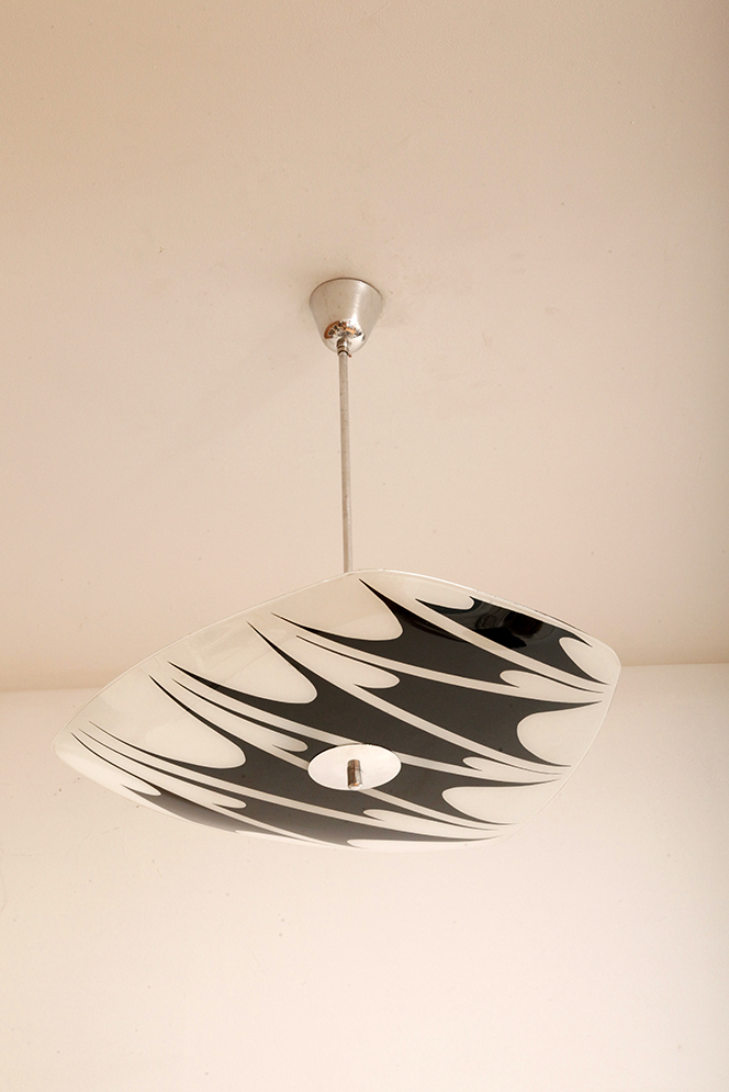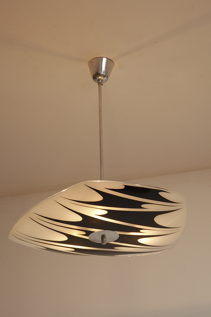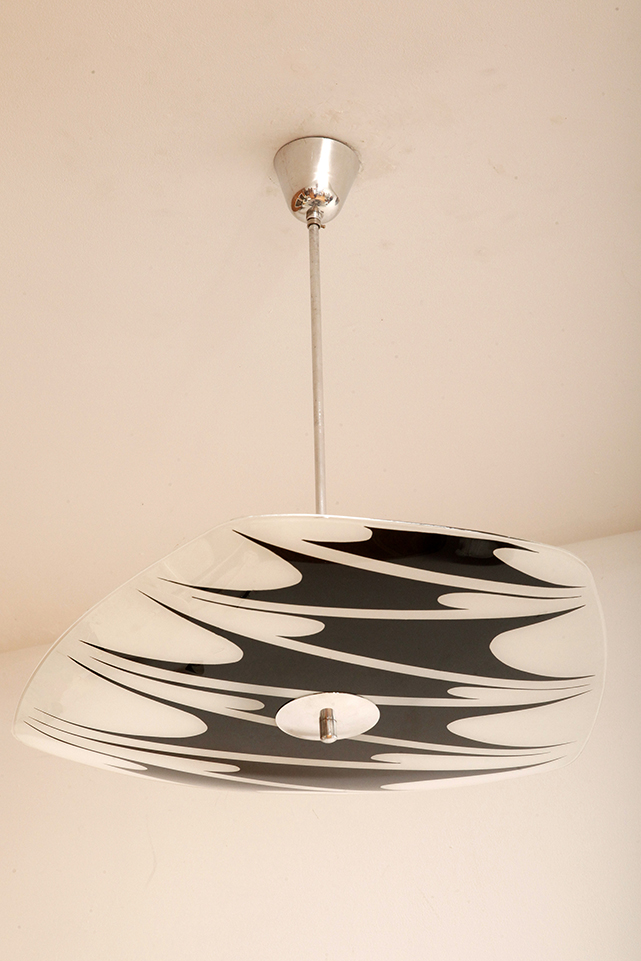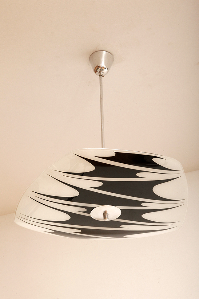 Lampa sufitowa pochodzi z czechosłowackiej wytwórni Kamenický Šenov (prawdopodobnie) z lat 50/60. Ranty szklanego klosza są dokładnie wyszlifowane i bezpieczne dla dłoni. Klosz ozdobiony geometrycznym wzorem w dwóch kolorach. Lampa jest w bardzo dobrym stanie.