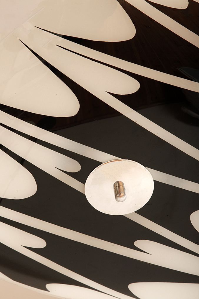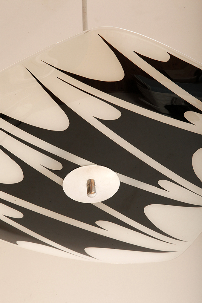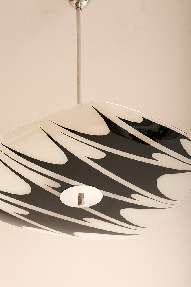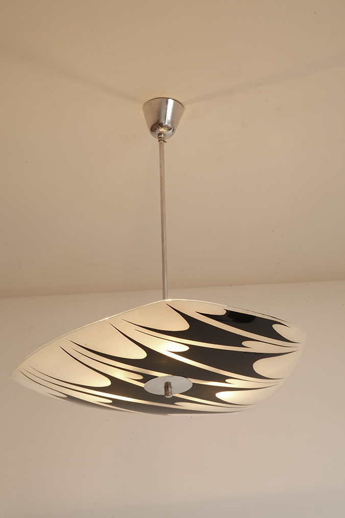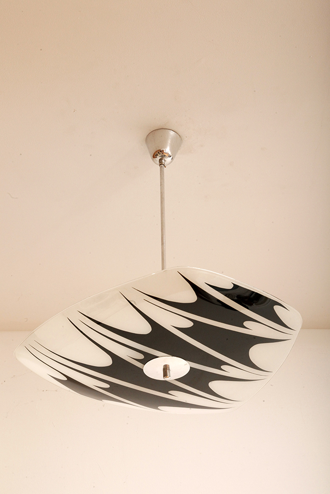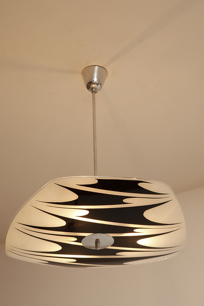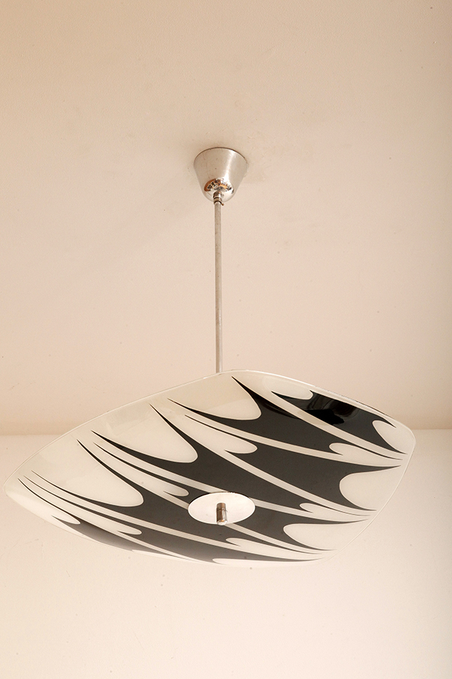 Lampa sufitowa pochodzi z czechosłowackiej wytwórni Kamenický Šenov (prawdopodobnie) z lat 50/60. Ranty szklanego klosza są dokładnie wyszlifowane i bezpieczne dla dłoni. Klosz ozdobiony geometrycznym wzorem w dwóch kolorach. Lampa jest w bardzo dobrym stanie.