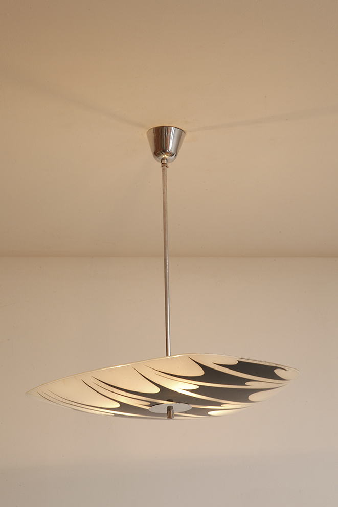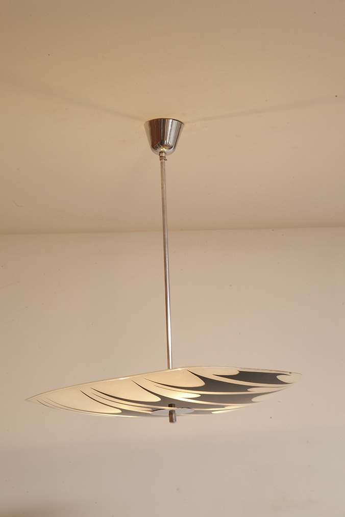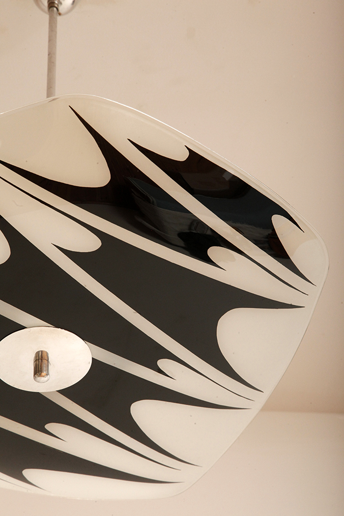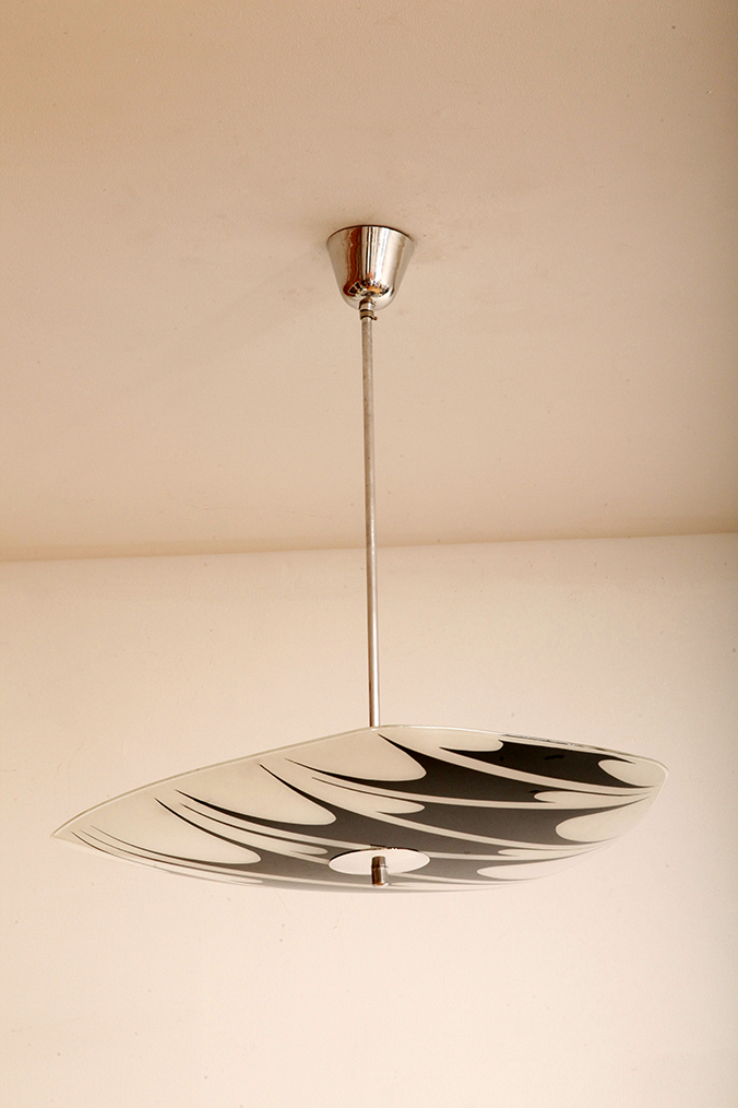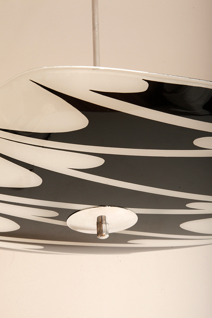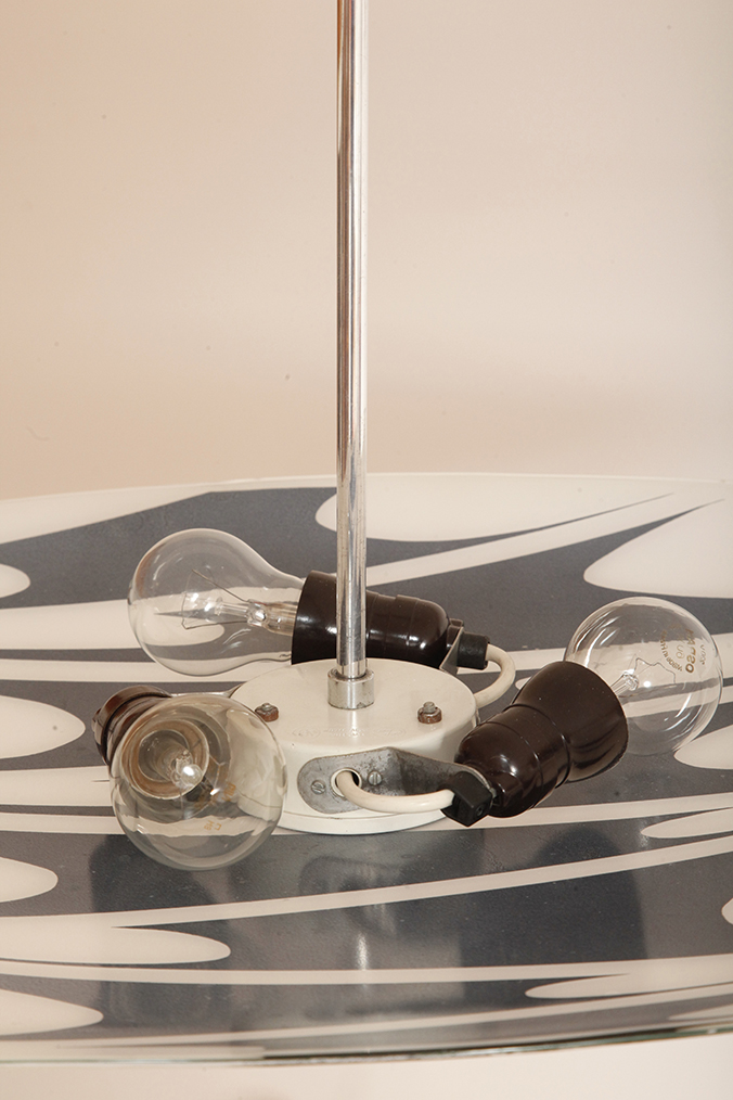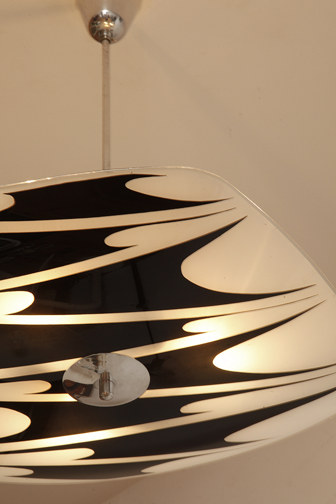 Lampa sufitowa pochodzi z czechosłowackiej wytwórni Kamenický Šenov (prawdopodobnie) z lat 50/60. Ranty szklanego klosza są dokładnie wyszlifowane i bezpieczne dla dłoni. Klosz ozdobiony geometrycznym wzorem w dwóch kolorach. Lampa jest w bardzo dobrym stanie.