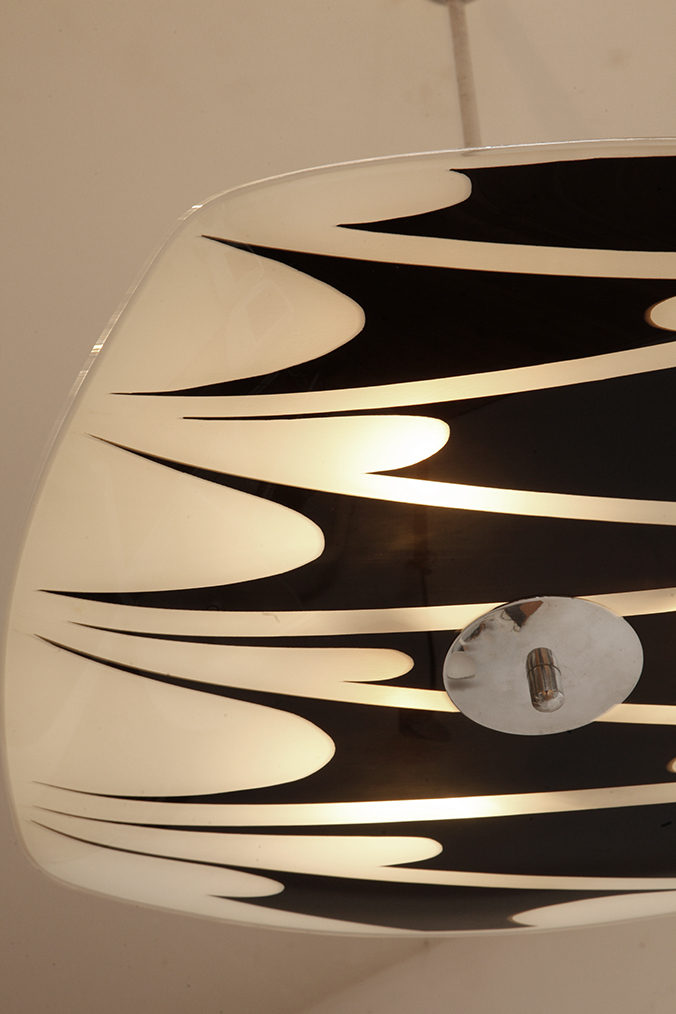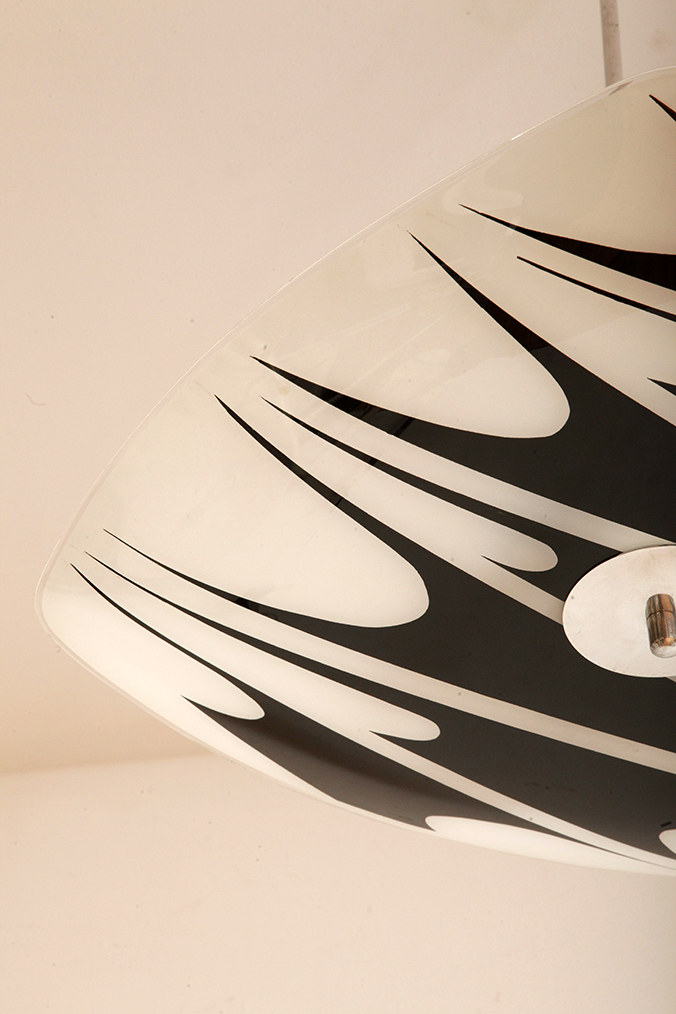 Całość grzeszy pewną elegancją niezaprzeczalną. Banalne połączenie białego koloru z czarnym jest przełamane niebanalnym geometrycznym wzorem włożonym w asymetryczną przestrzeń szklanego klosza, co daje zaskakująco ciekawy efekt. Nie jestem zagorzałym fanem zwisów zwanych popularnie „parasolkami”, a te z ty właśnie wzorem zawsze przykuwają moją uwagę.