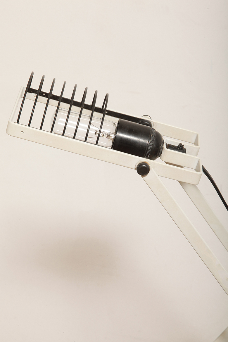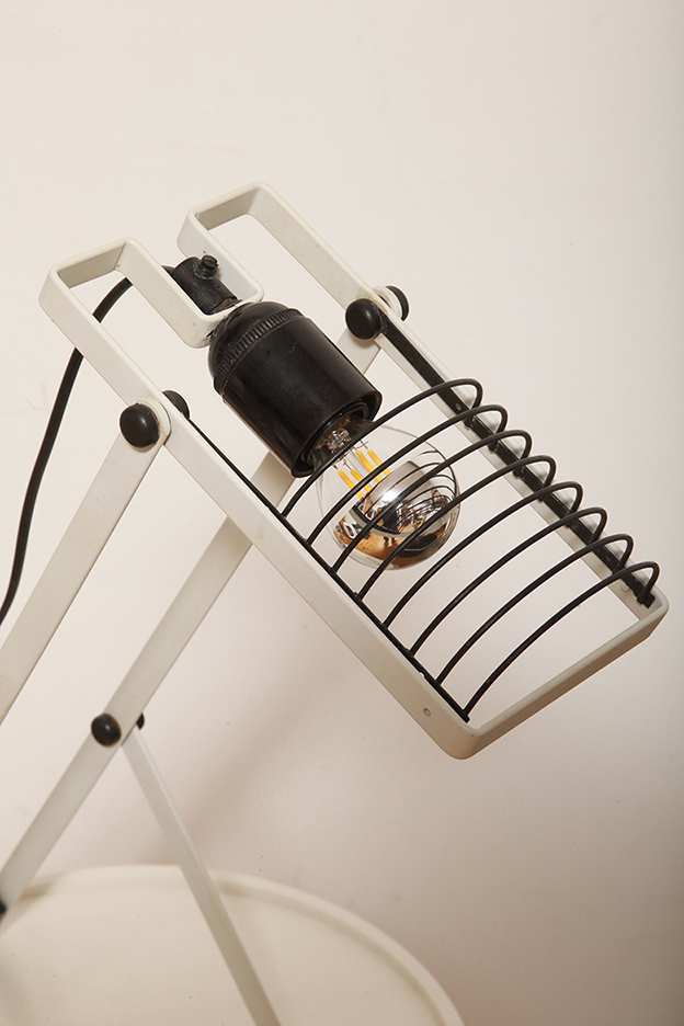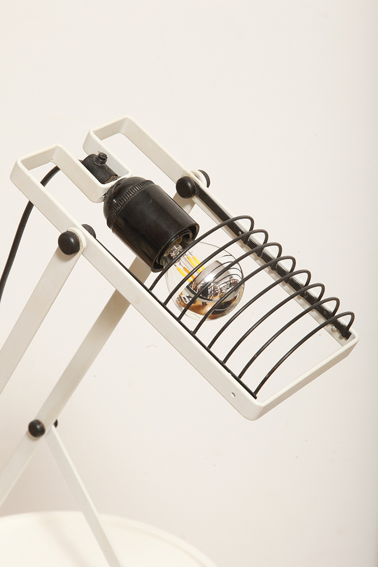 Biała z czarnymi elementami jednopunktowa metalowa lampa biurkowa z serii Syntesi z regulowaną wysokością, projekt Ernesto Gismondi dla Artemide, Włochy, wzór z 1975 roku