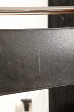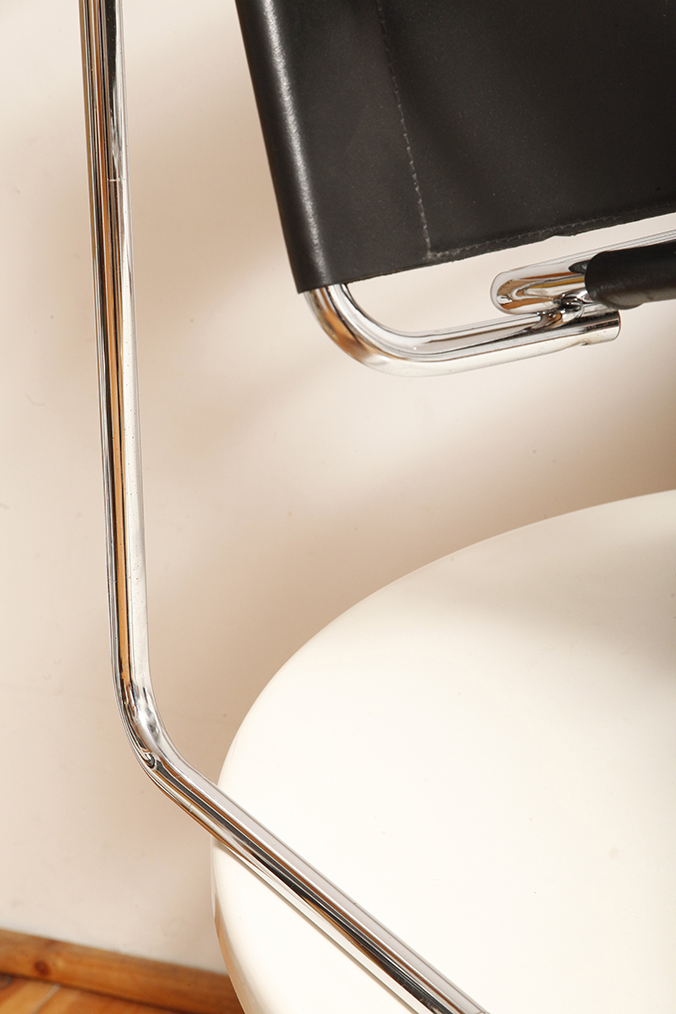Mino, że z lat 80. zachowany w świetnym stanie z nikłymi oznakami wieku. Mam na myśli zarówno stan czarnej skóry naturalnej (kilka drobnych mini punktowych mało widocznych przetarć) jak i chromowanej metalowej rurowej konstrukcji. Powiedziałabym że w wyśmienitej kondycji vintage. Skóra nie jest wysuszona, ani porysowana, naprężona gotowa do użytku (zdjęcia).