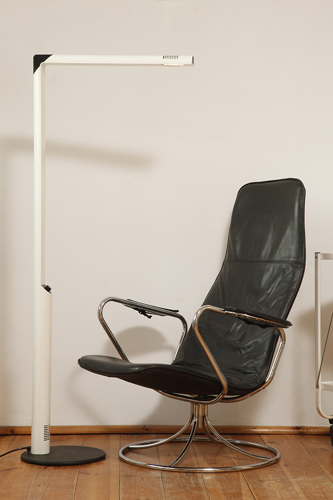 Czarny obrotowy niski fotel wypoczynkowy „Exen” obity w skórę naturalną osadzony na chromowanej konstrukcji, projekt Tord Bjorklund dla IKEA, Szwecja, projekt z 1989 roku