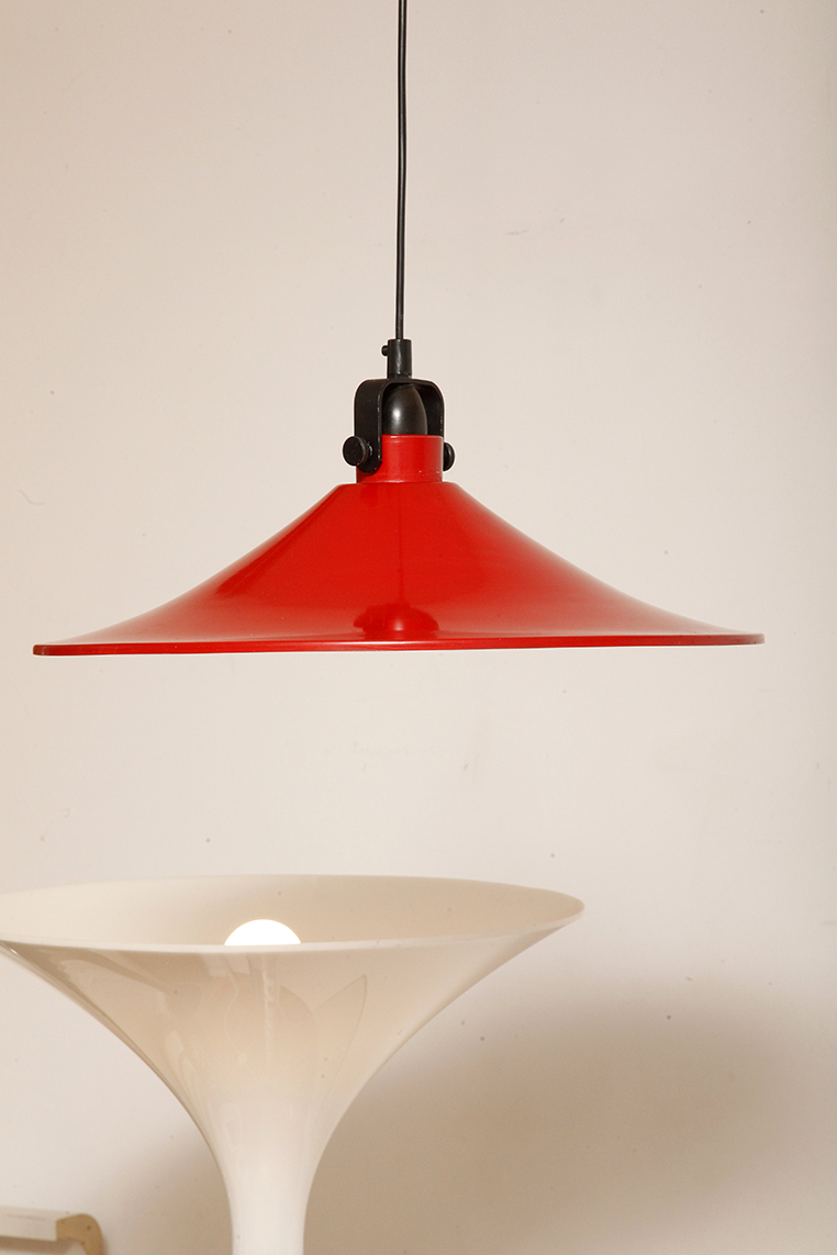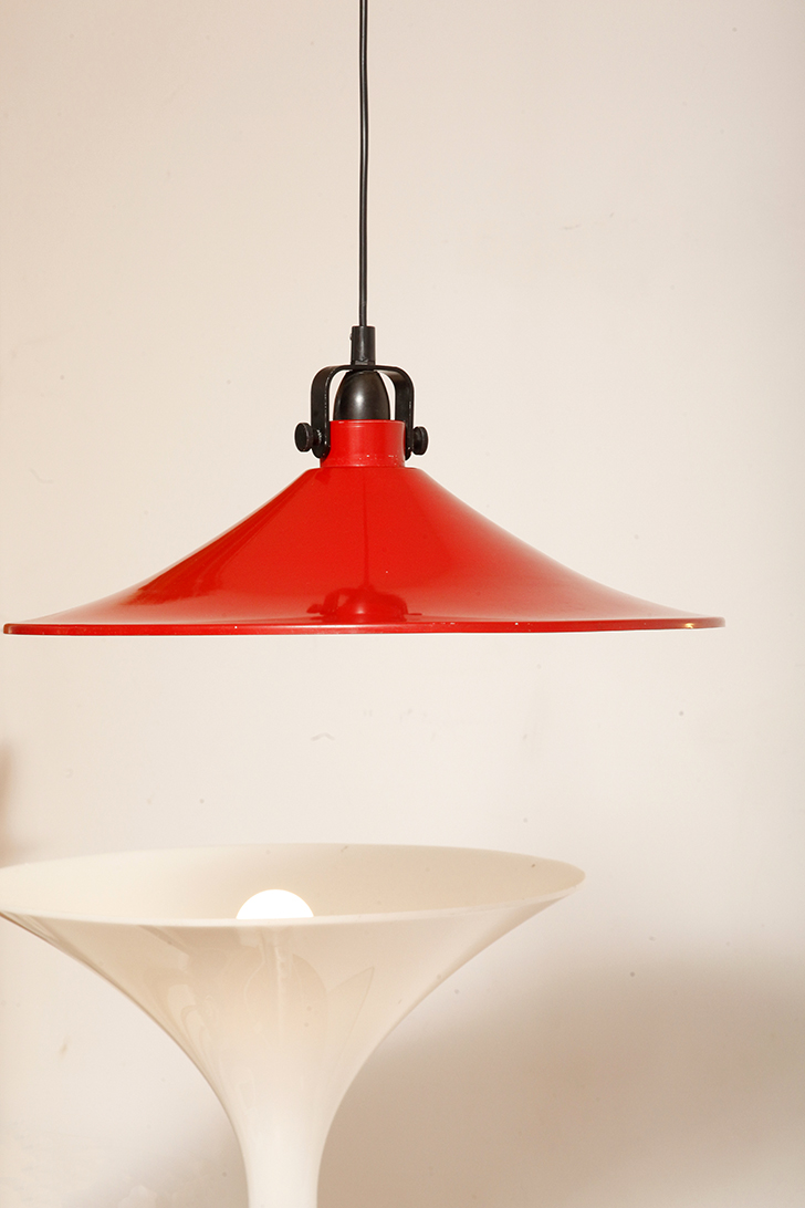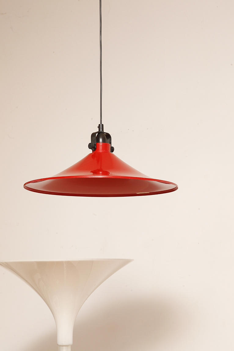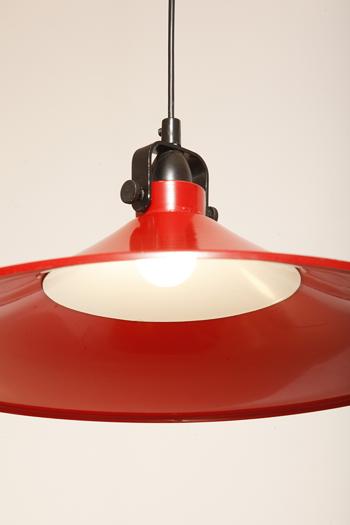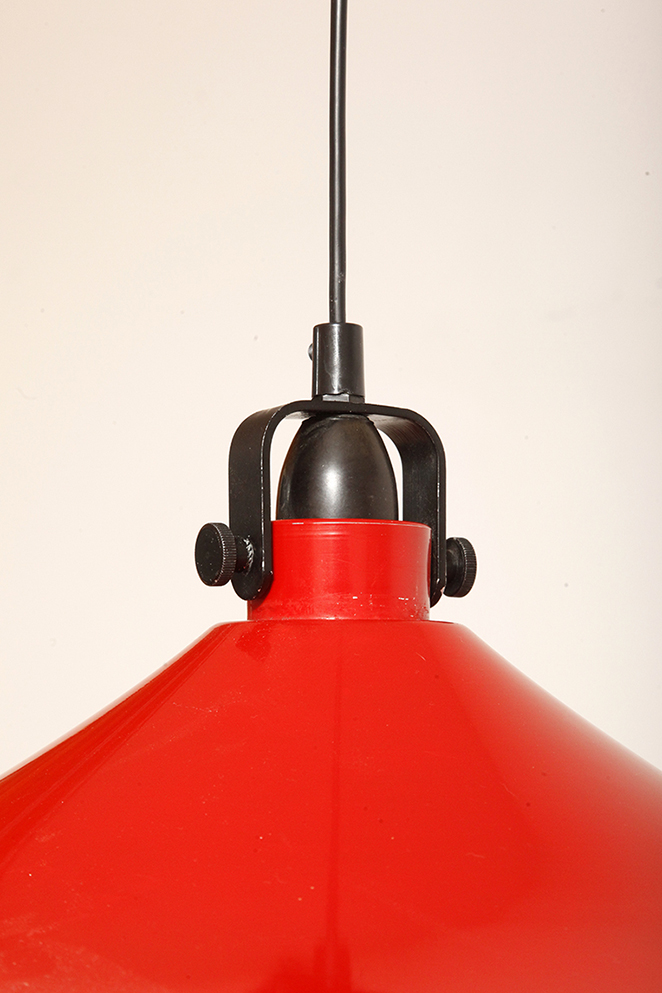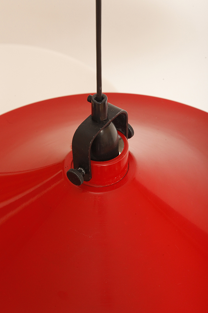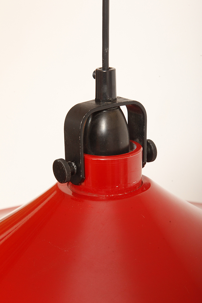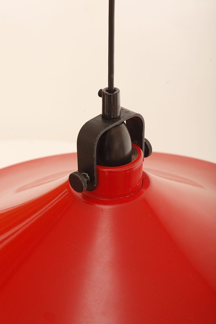 Czerwona metalowa jednopunktowa skandynawska lampa wisząca/sufitowa z czarnym uchwytem nad kloszem i czarną podsufitką, firma Decembre, Finlandia, lata 90.
