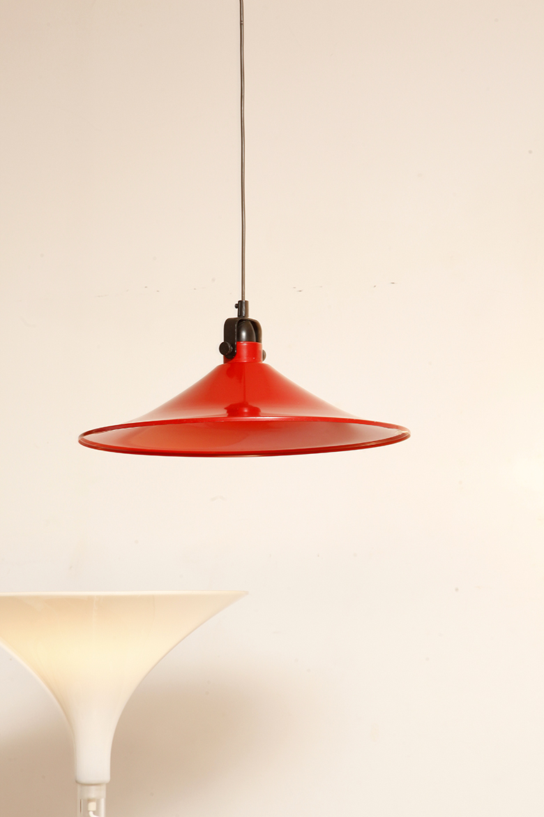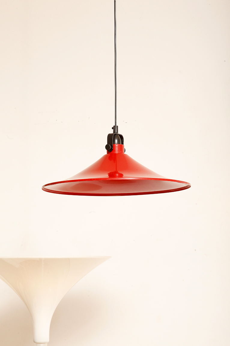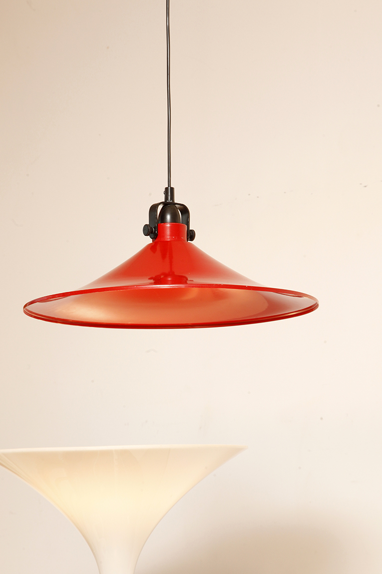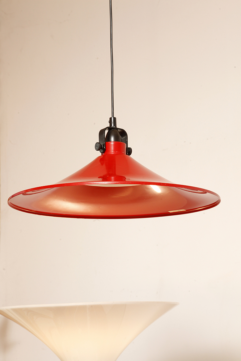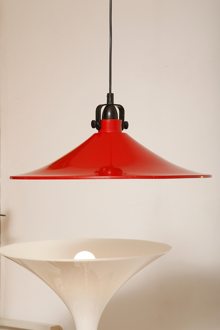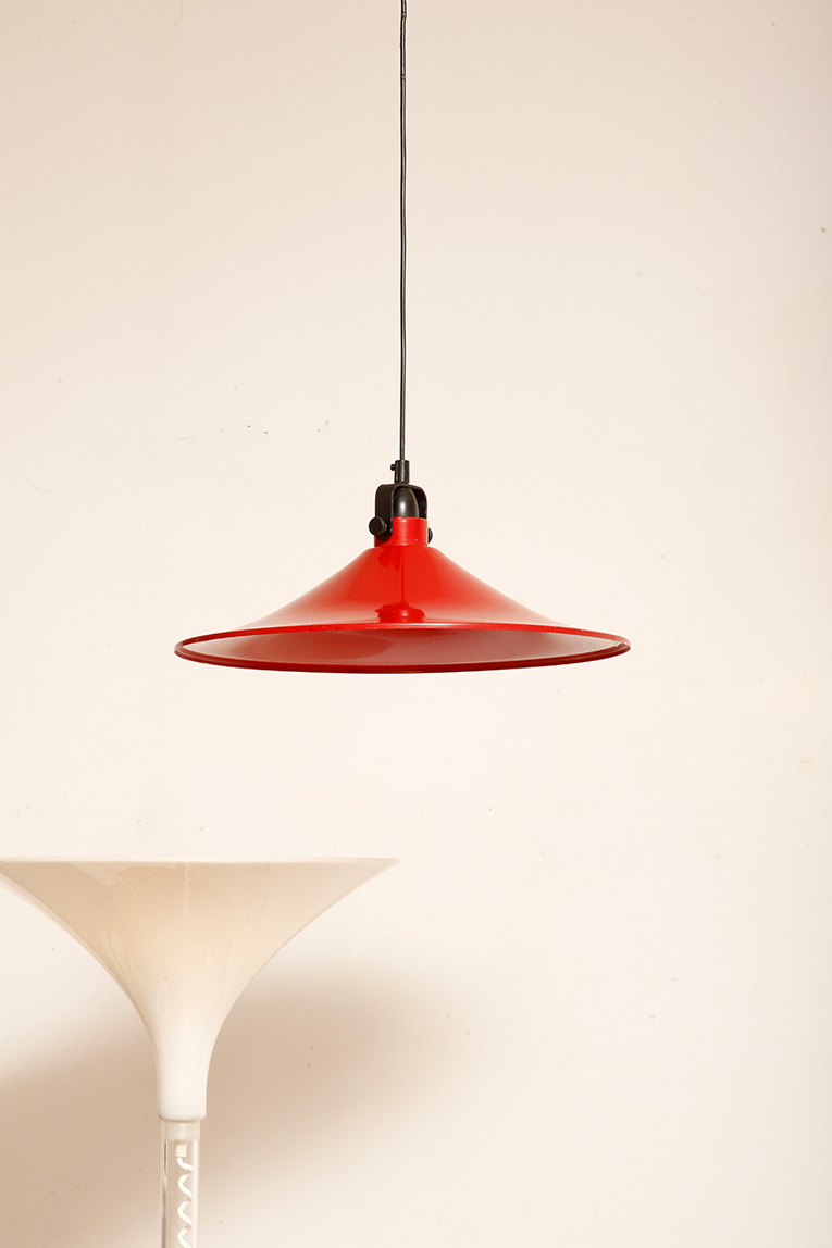 Czerwona metalowa jednopunktowa skandynawska lampa wisząca/sufitowa z czarnym uchwytem nad kloszem i czarną podsufitką, firma Decembre, Finlandia, lata 90.