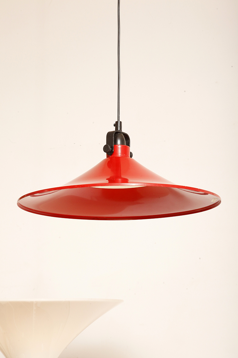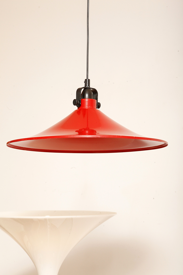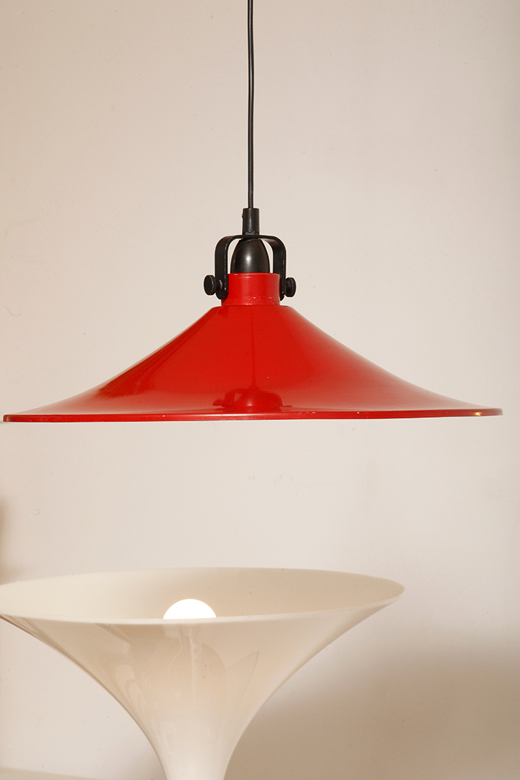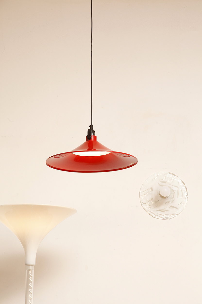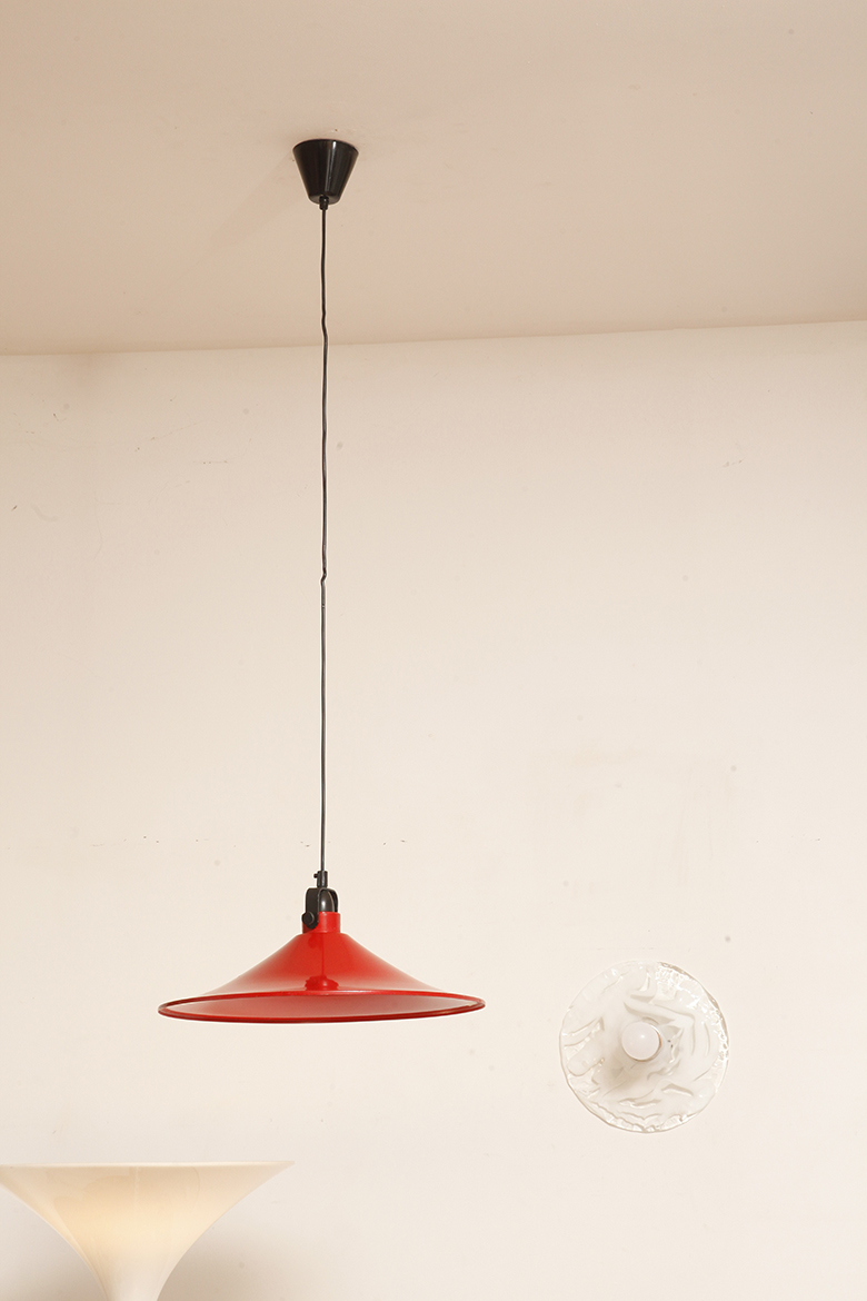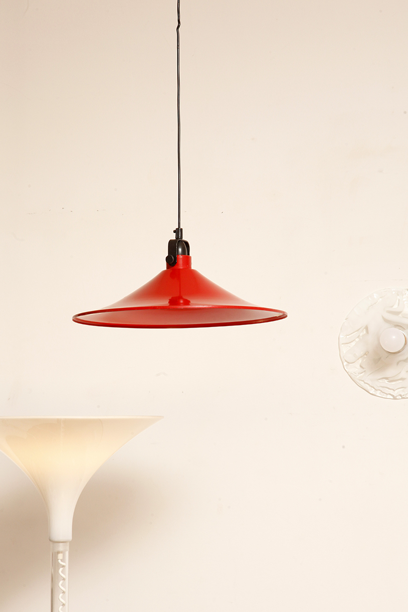 Czerwona metalowa jednopunktowa skandynawska lampa wisząca/sufitowa z czarnym uchwytem nad kloszem i czarną podsufitką, firma Decembre, Finlandia, lata 90.