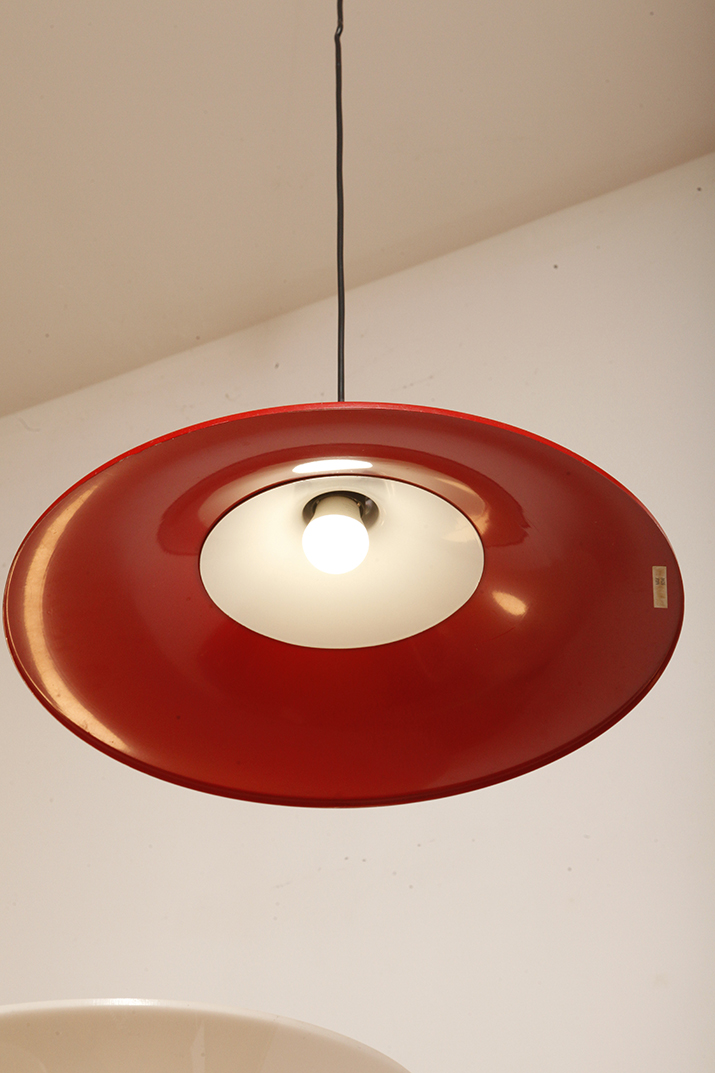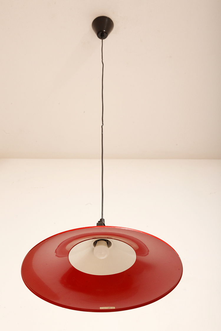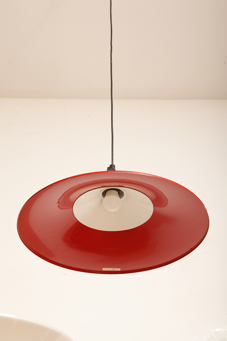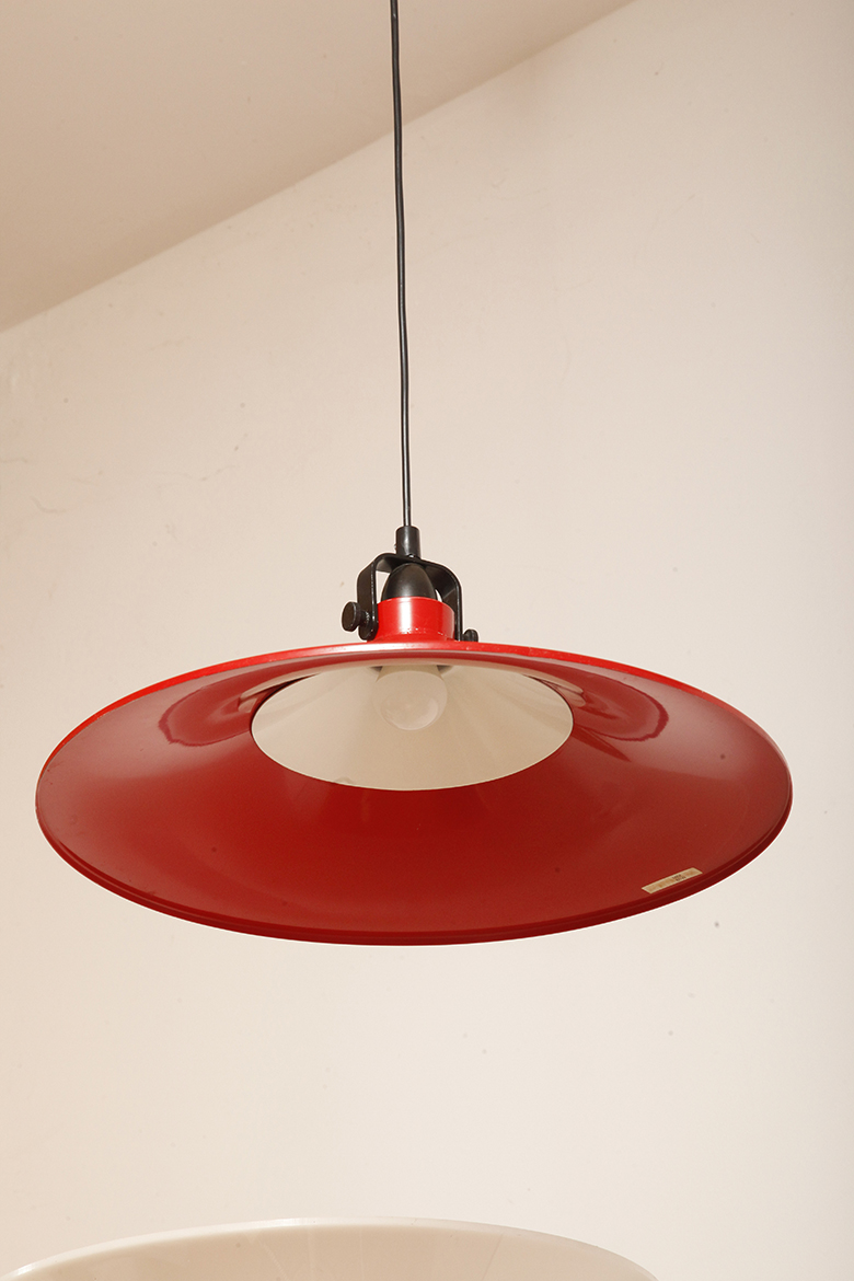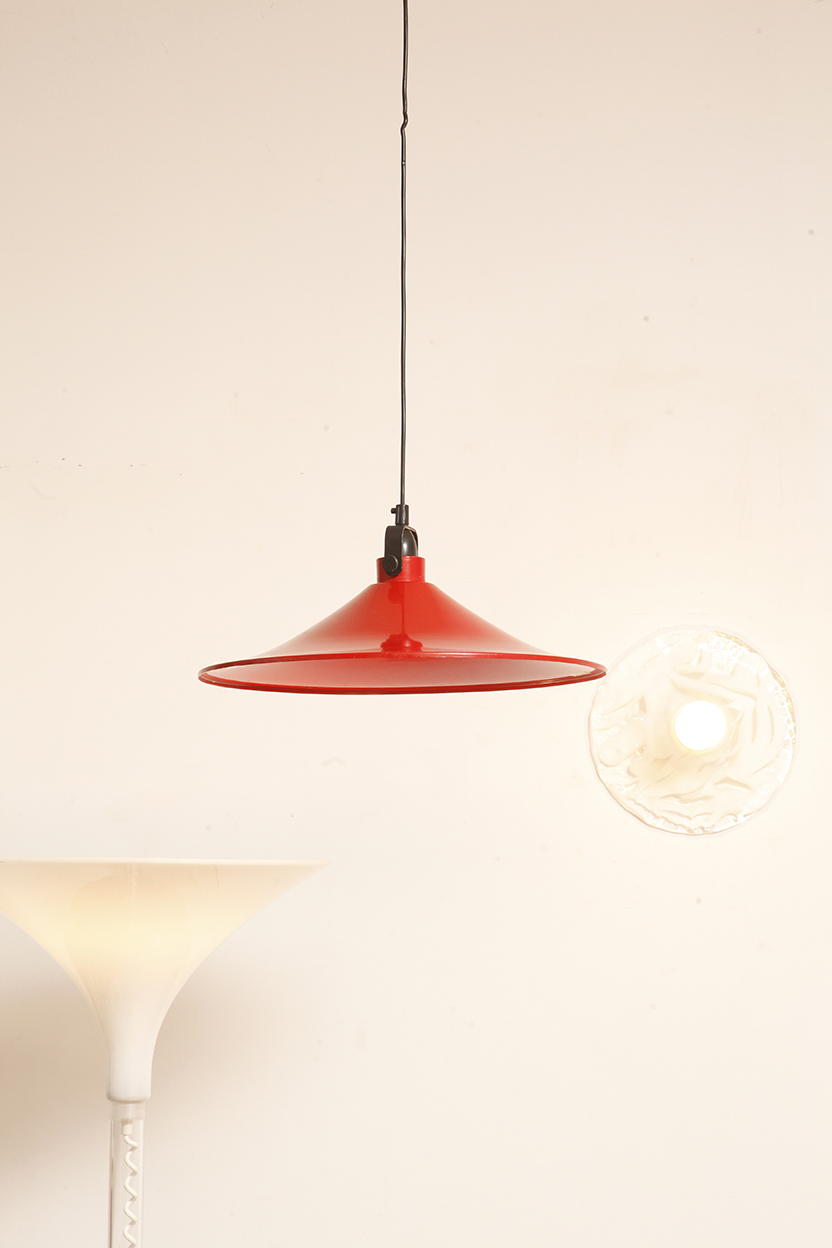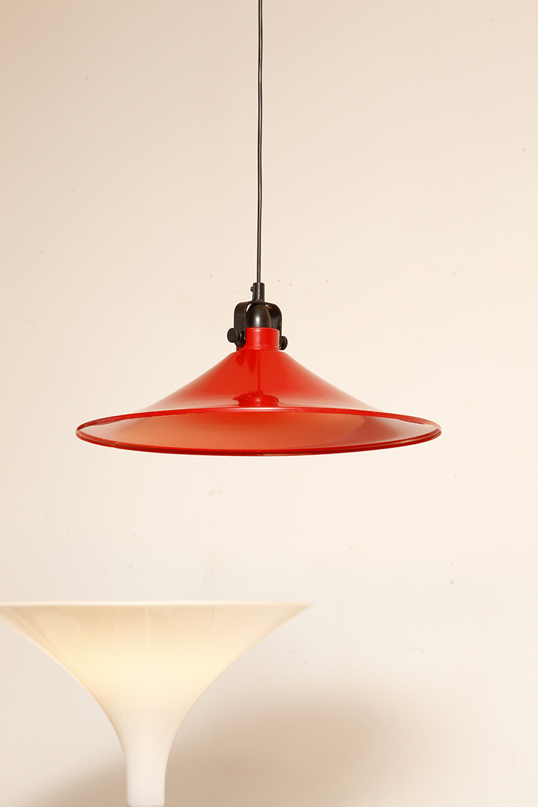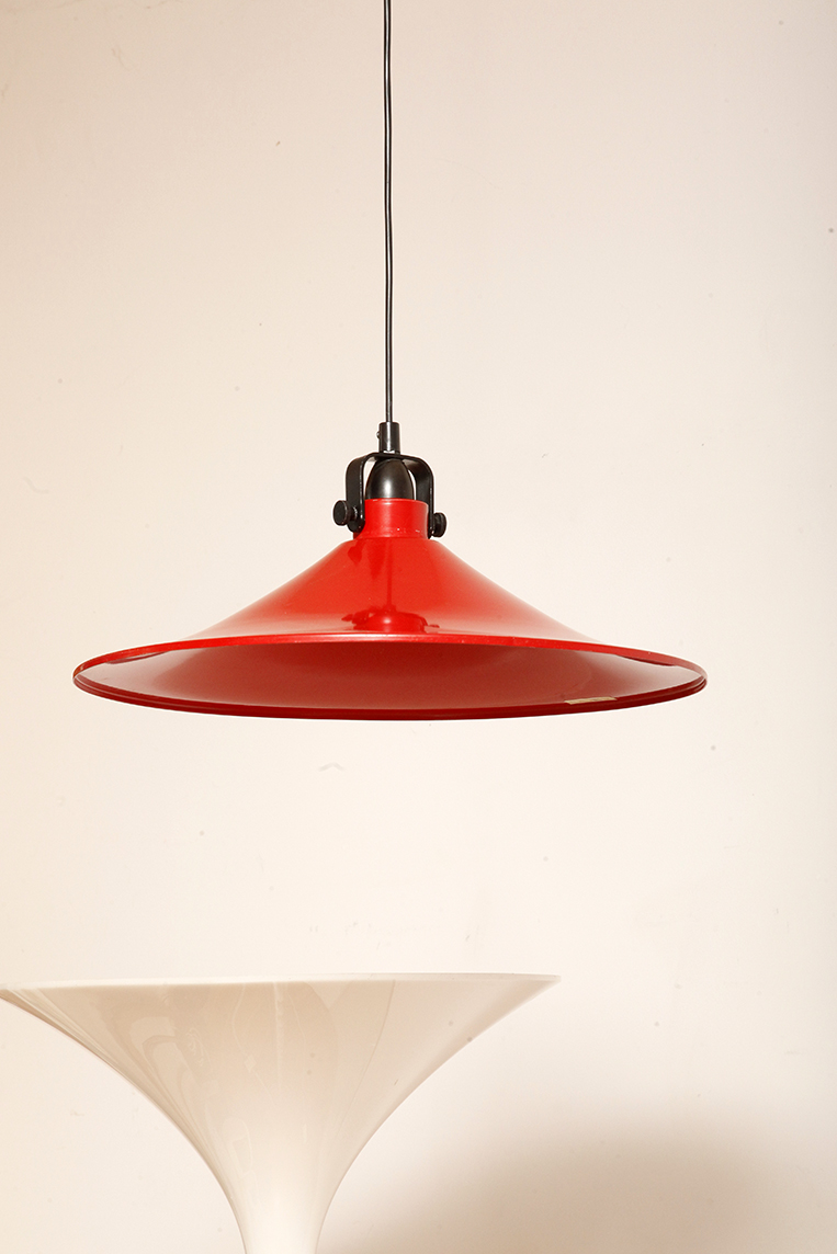 Czerwona metalowa jednopunktowa skandynawska lampa wisząca/sufitowa z czarnym uchwytem nad kloszem i czarną podsufitką, firma Decembre, Finlandia, lata 90.