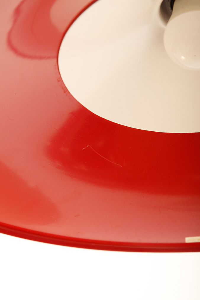 Zachowana w stanie naturalnym z kilkoma obtarciami, takimi powierzchniowymi i mało znaczącymi. Takimi wiecie, od używania. Jak to przedmiot vintage. Bez wgnieceń, ubytków, braków i odbarwień. Gotowa do użytku, sprawdzona elektrycznie. Niby cała czerwona, ale uchwyt na górze czarny ma. I biały odbłyśnik w środku, taki metalowy co by światło na czerwono się nie odbijało, a na biało. Czyli taka zmyślna z niej lampa.