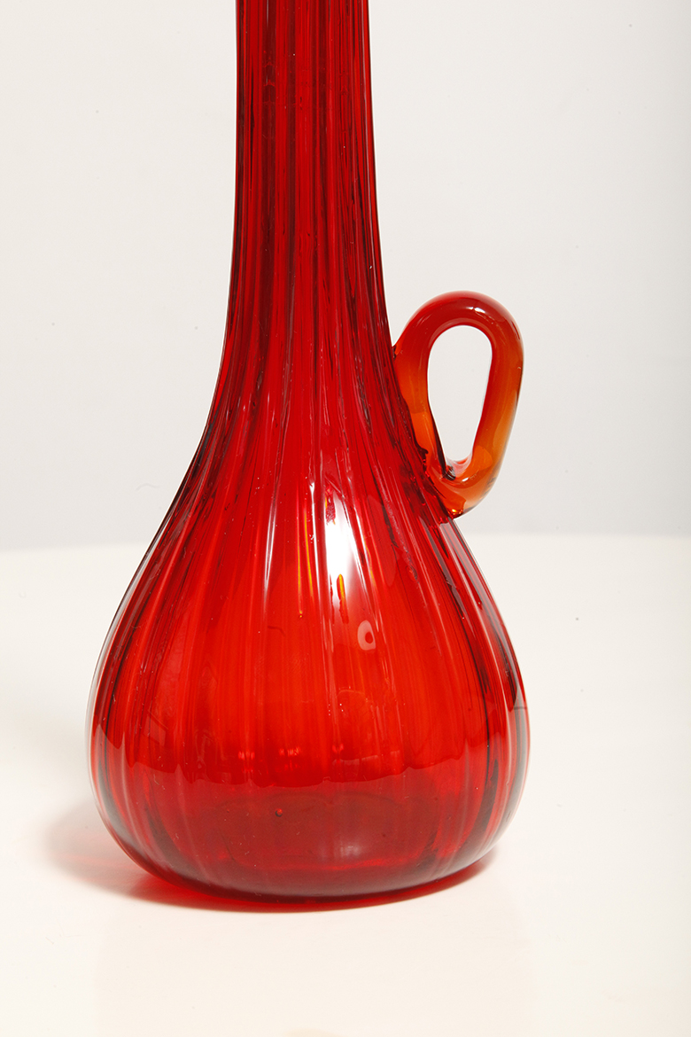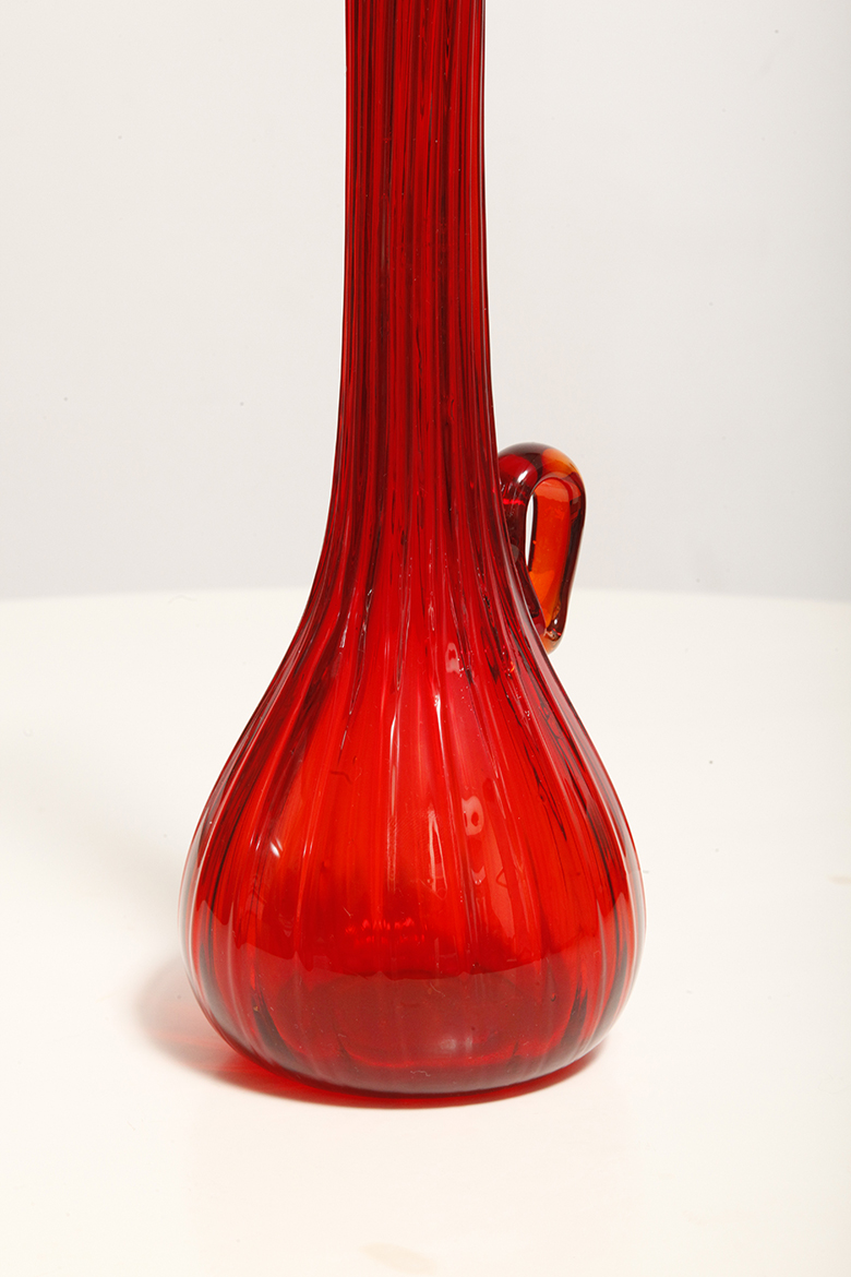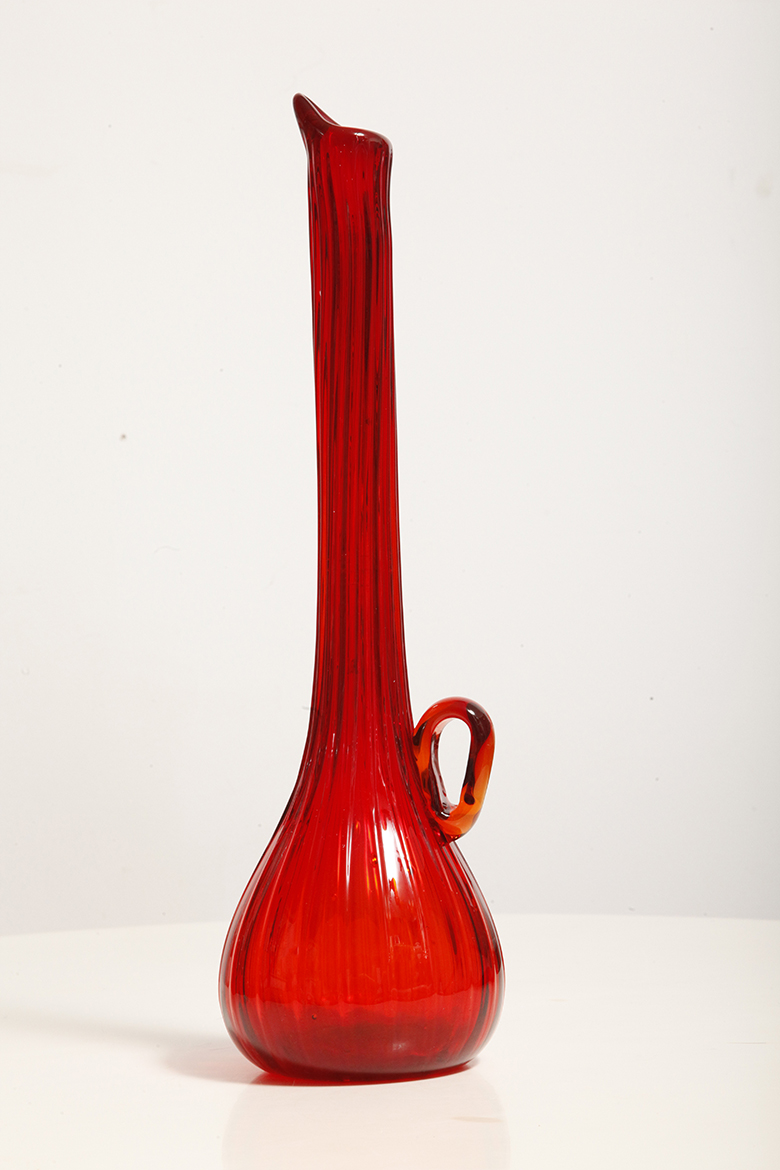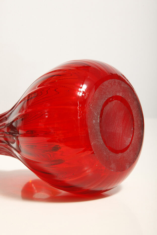 Czerwony szklany ręcznie formowany wazon/naczynie dekoracyjne/karafka, projekt Jerzy Słuczan-Orkusz, Krakowski Instytut Szkła i Ceramiki, lata 70.