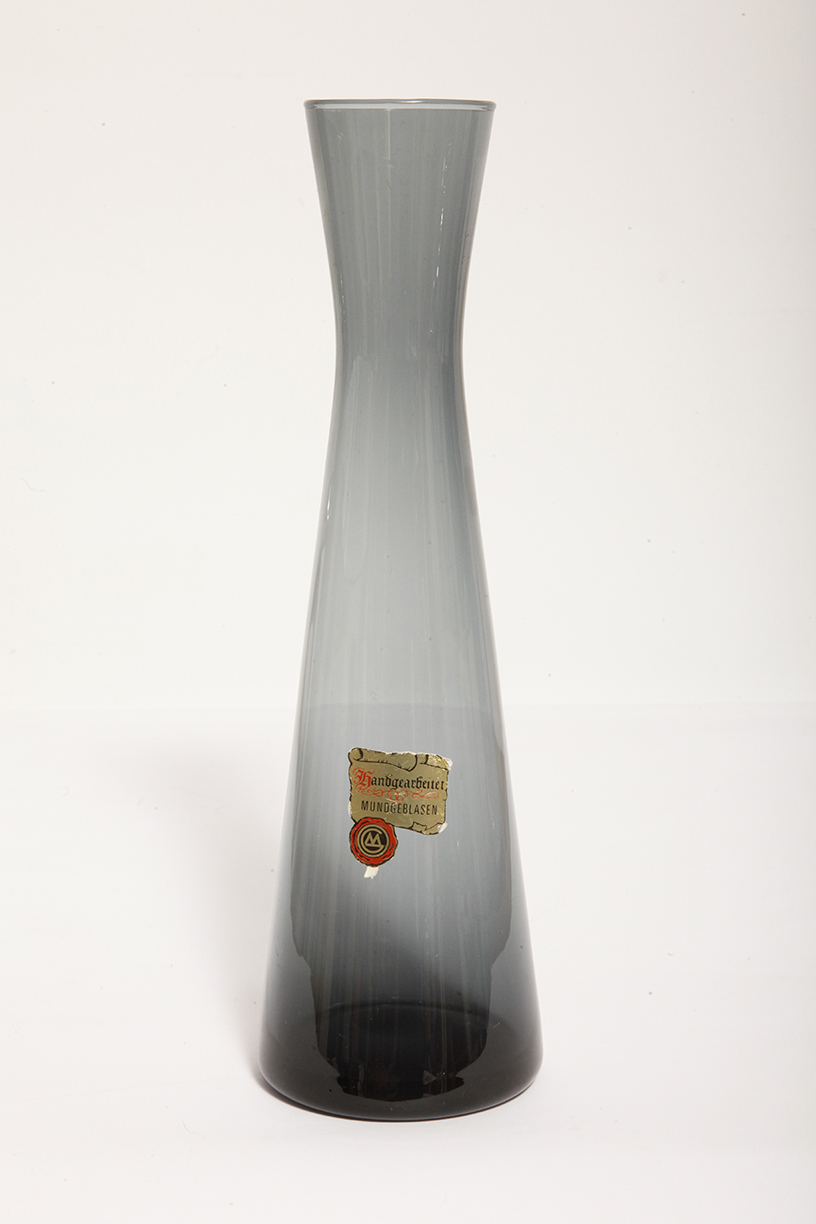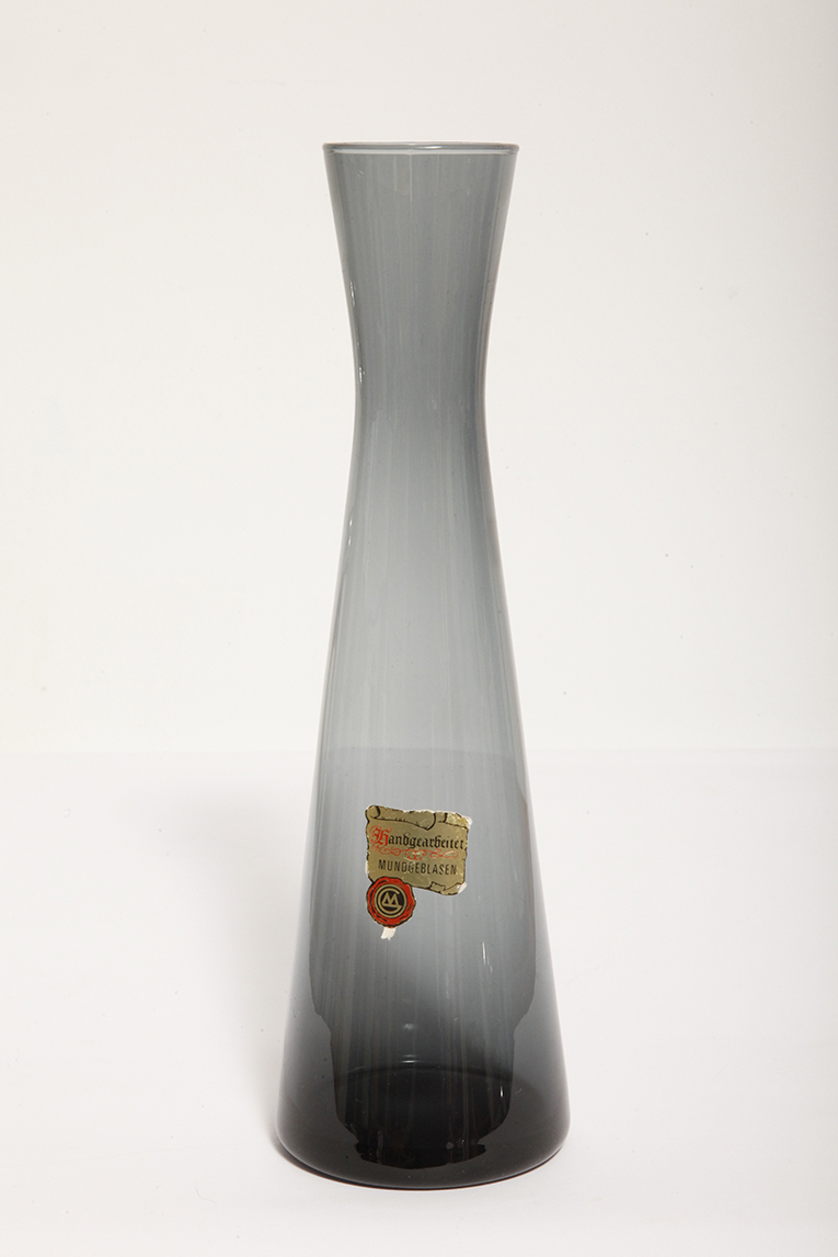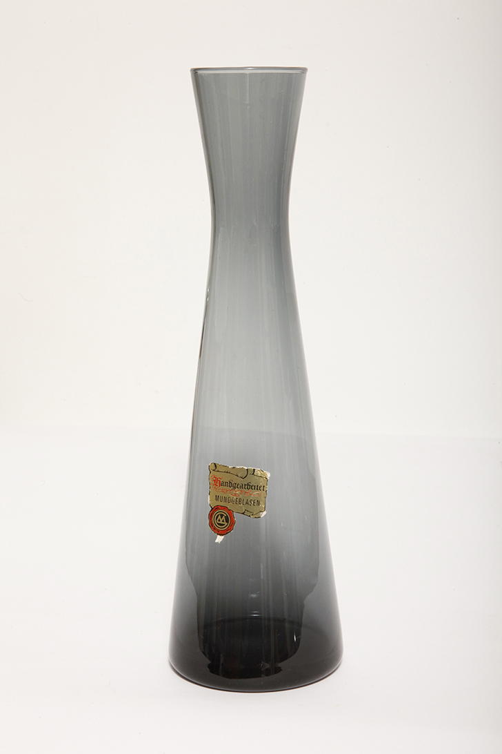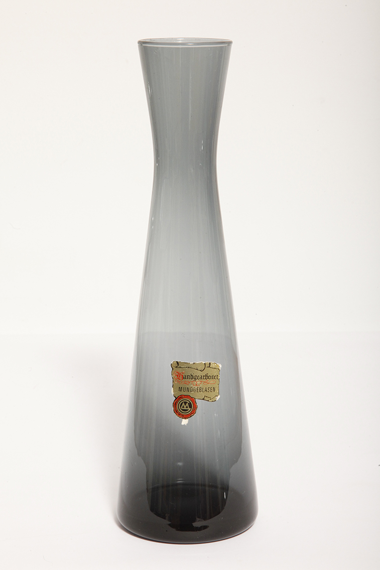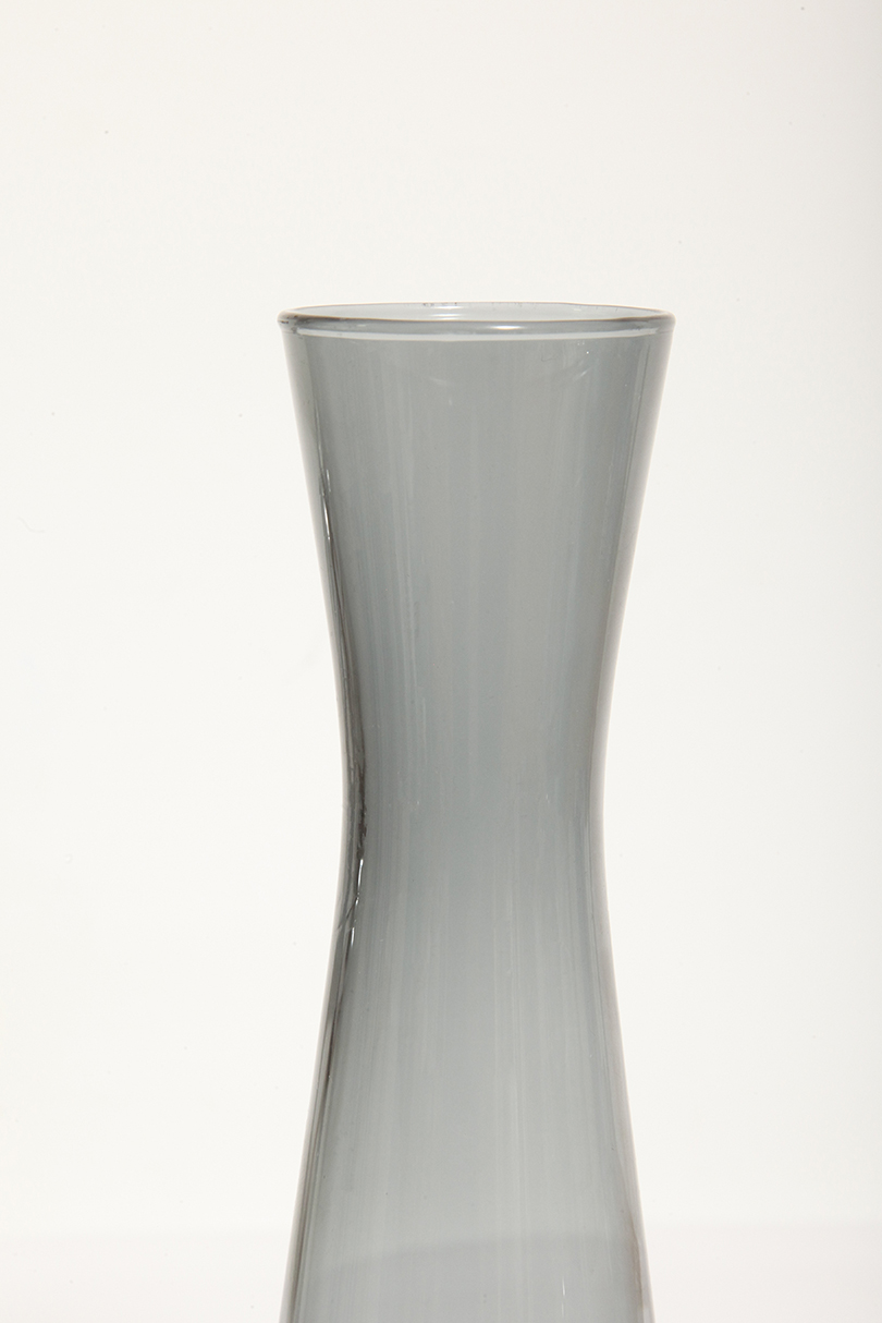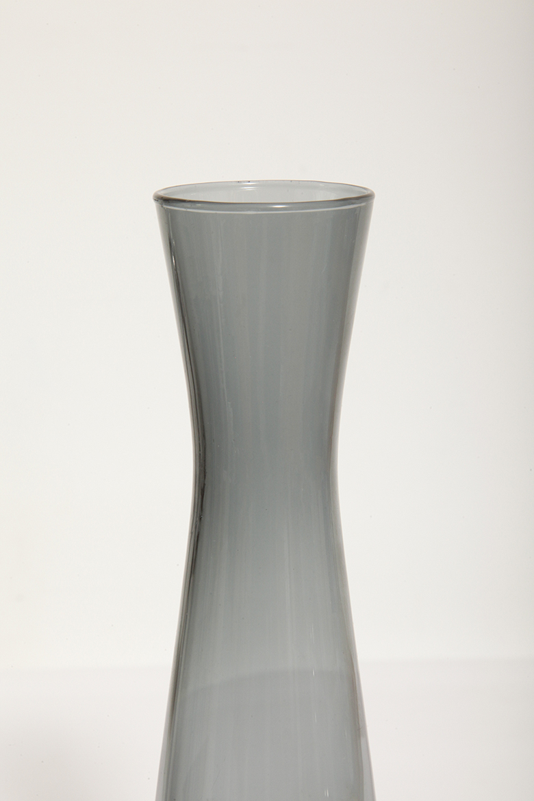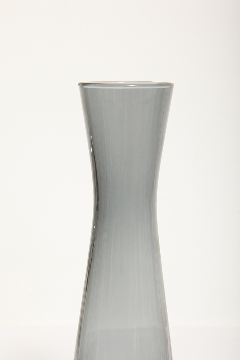 Delikatny średniej wielkości (25 cm) szklany ręcznie formowany wazon z cienkiego dymionego szkła w szarym kolorze w kształcie zbliżonym do klepsydry, Niemcy, lata 70.