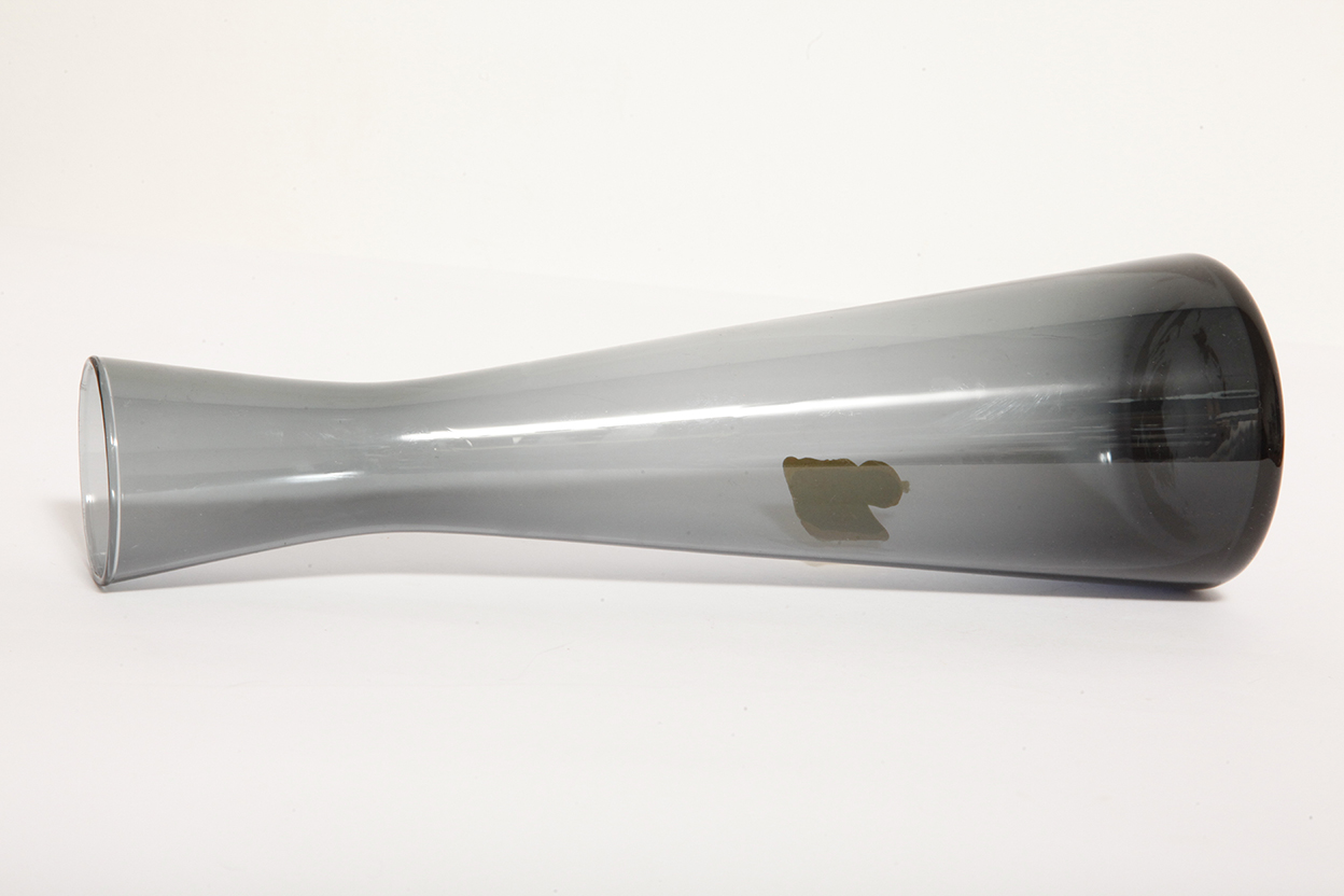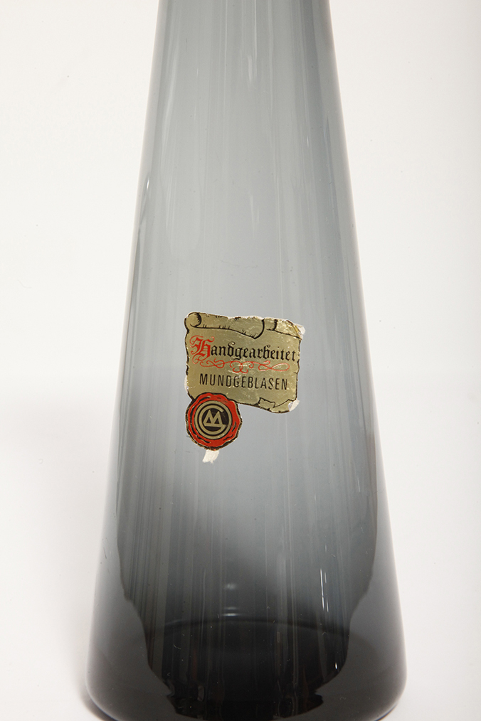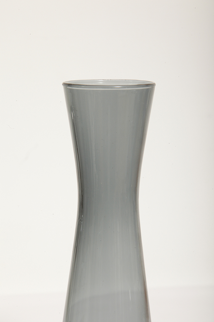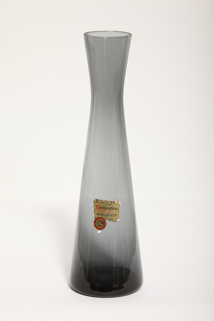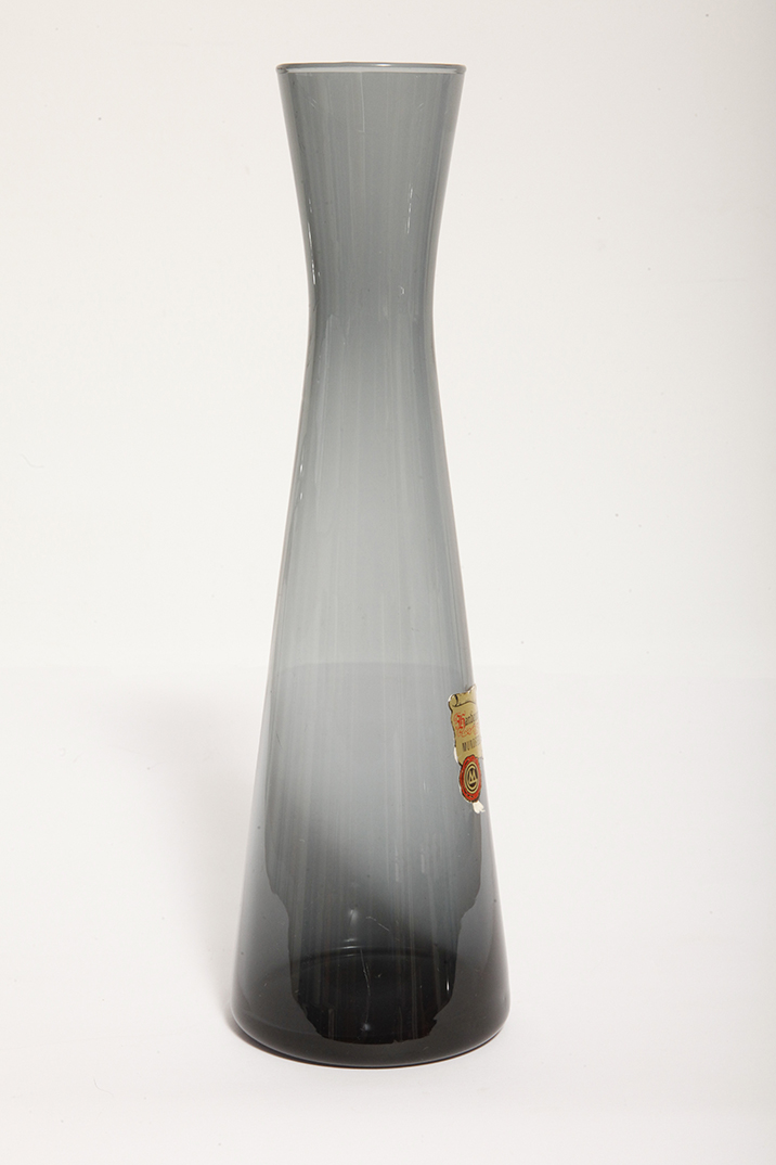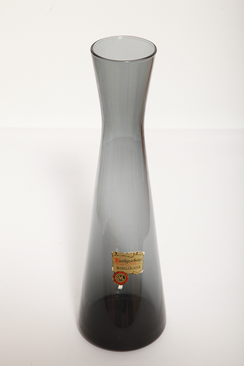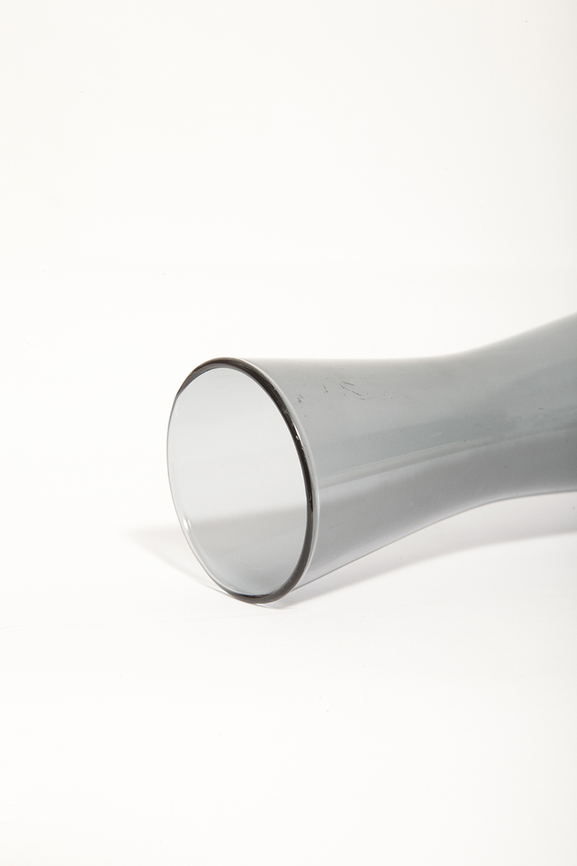 Delikatny średniej wielkości (25 cm) szklany ręcznie formowany wazon z cienkiego dymionego szkła w szarym kolorze w kształcie zbliżonym do klepsydry, Niemcy, lata 70.