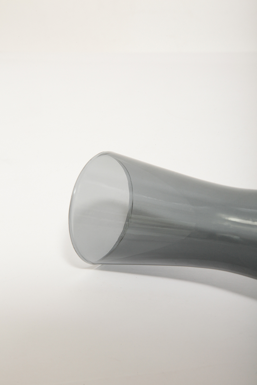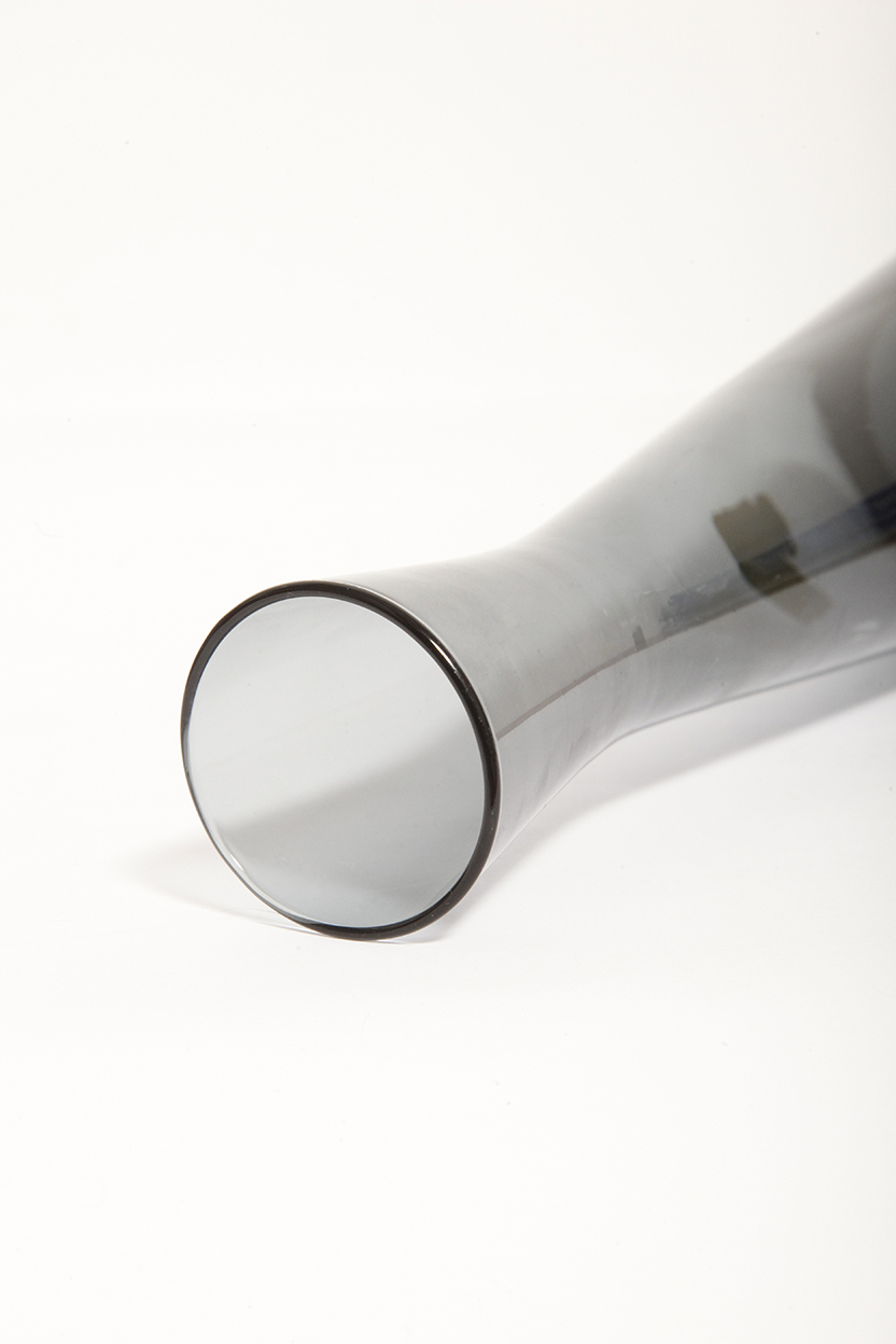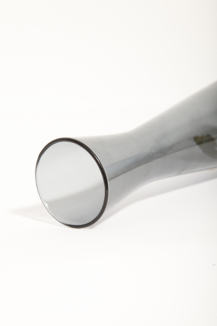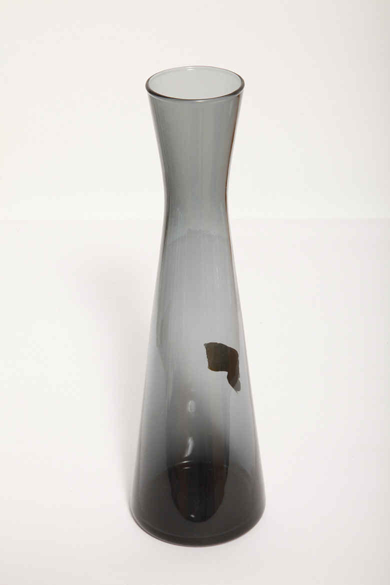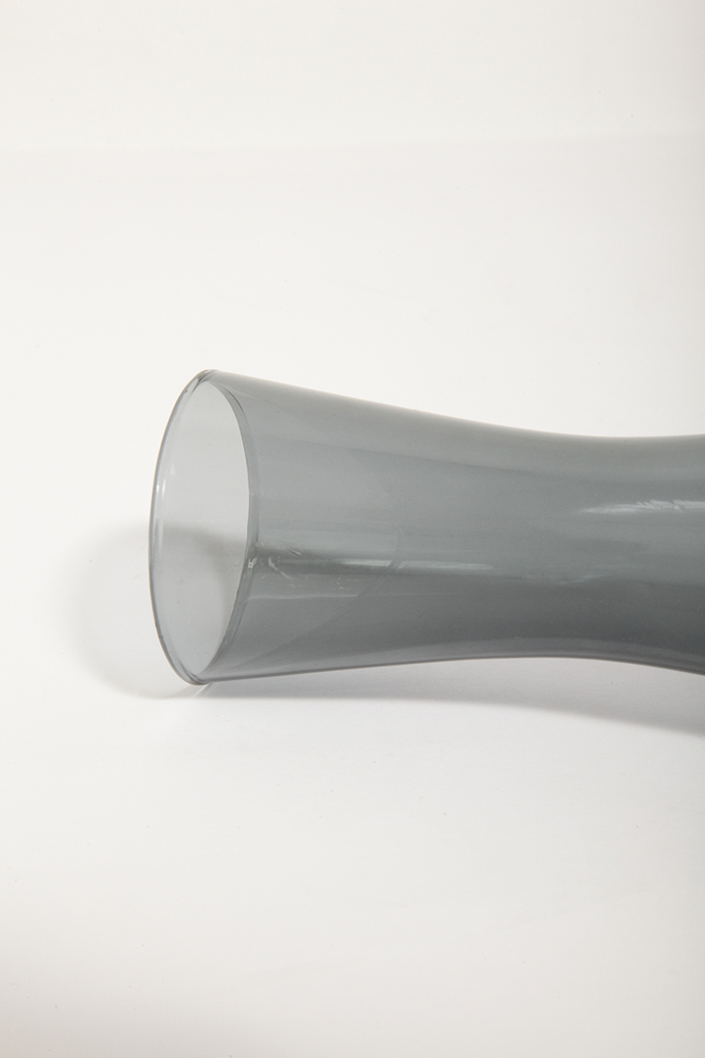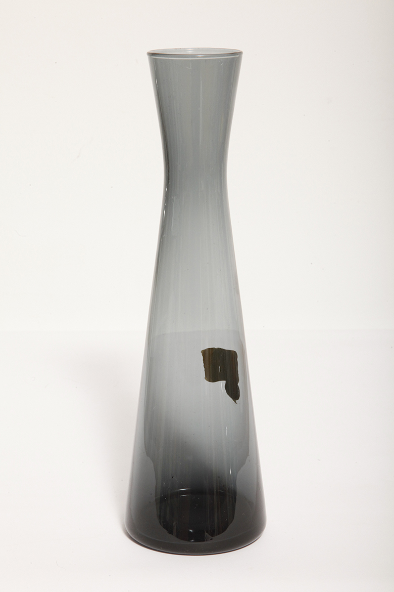 Delikatny średniej wielkości (25 cm) szklany ręcznie formowany wazon z cienkiego dymionego szkła w szarym kolorze w kształcie zbliżonym do klepsydry, Niemcy, lata 70.