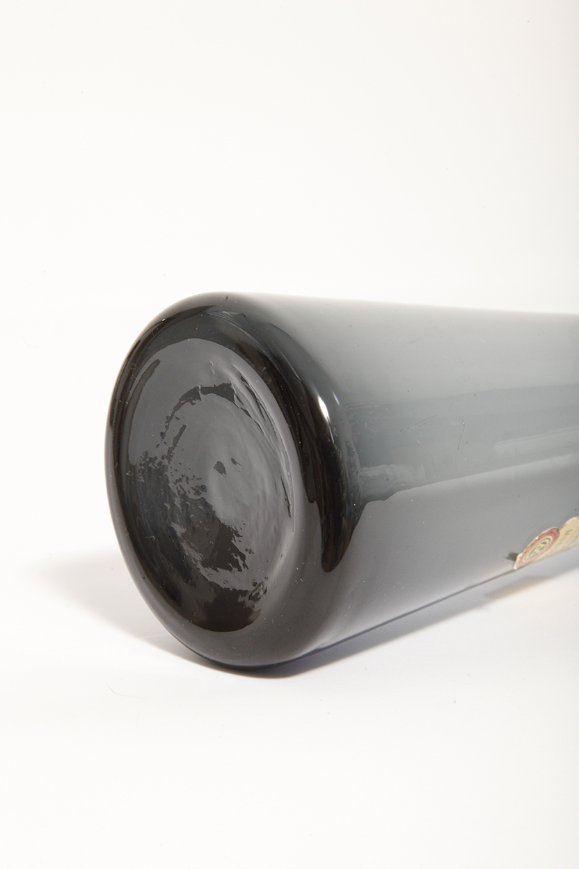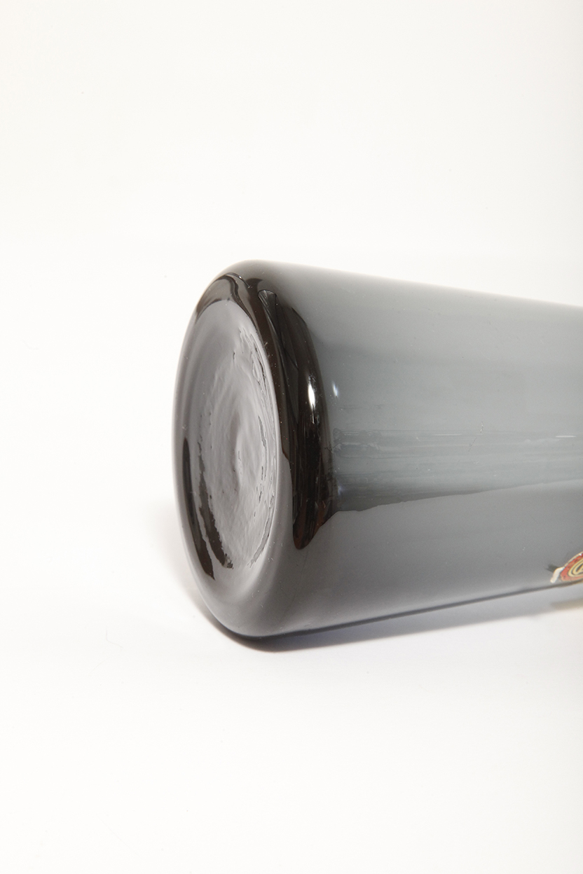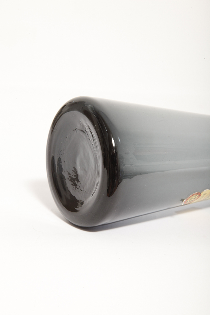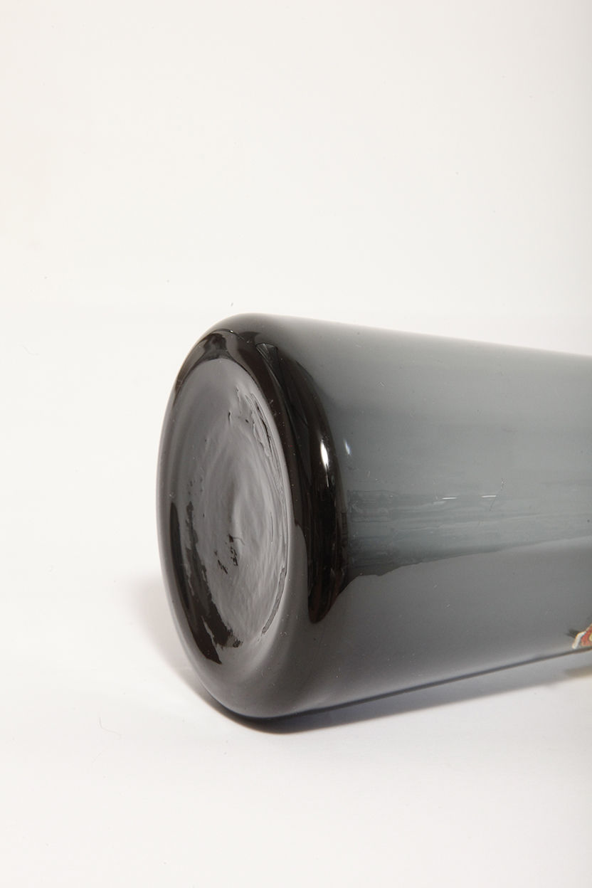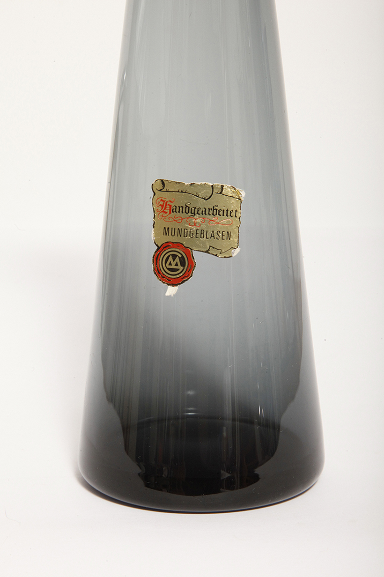 Bardzo zgrabny, nieco w bauhausowym stylu szary wazon z cienkiego szkła, ręcznie formowany czego dowodem jest naklejka fabryczna na nim zachowana (zdjęcia).