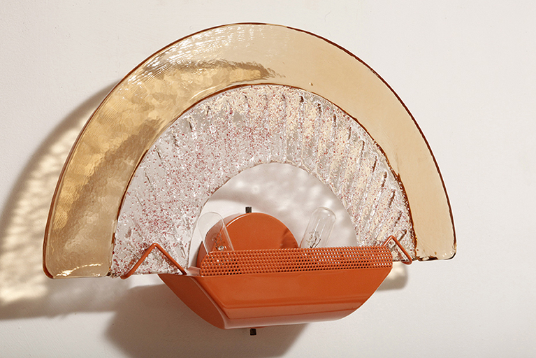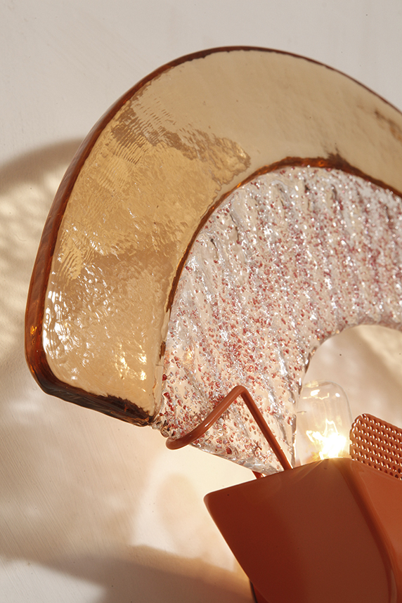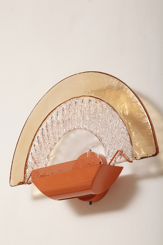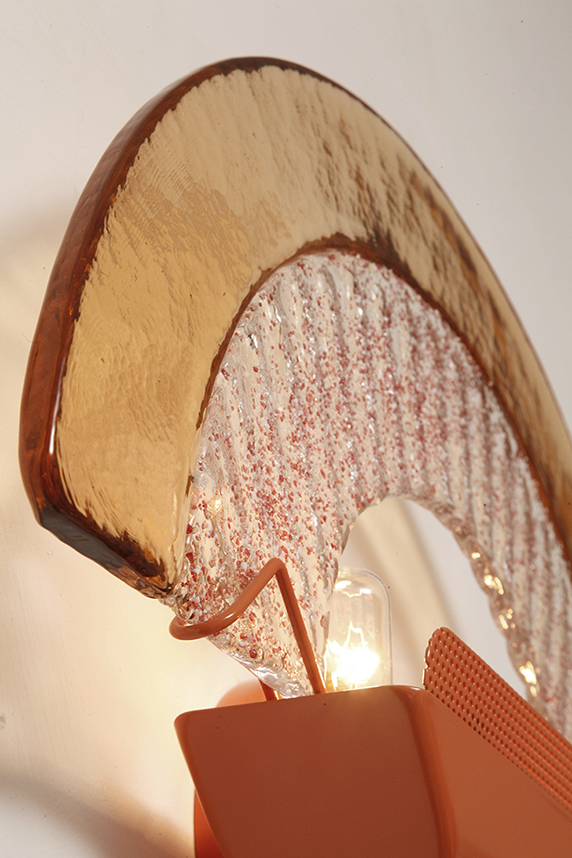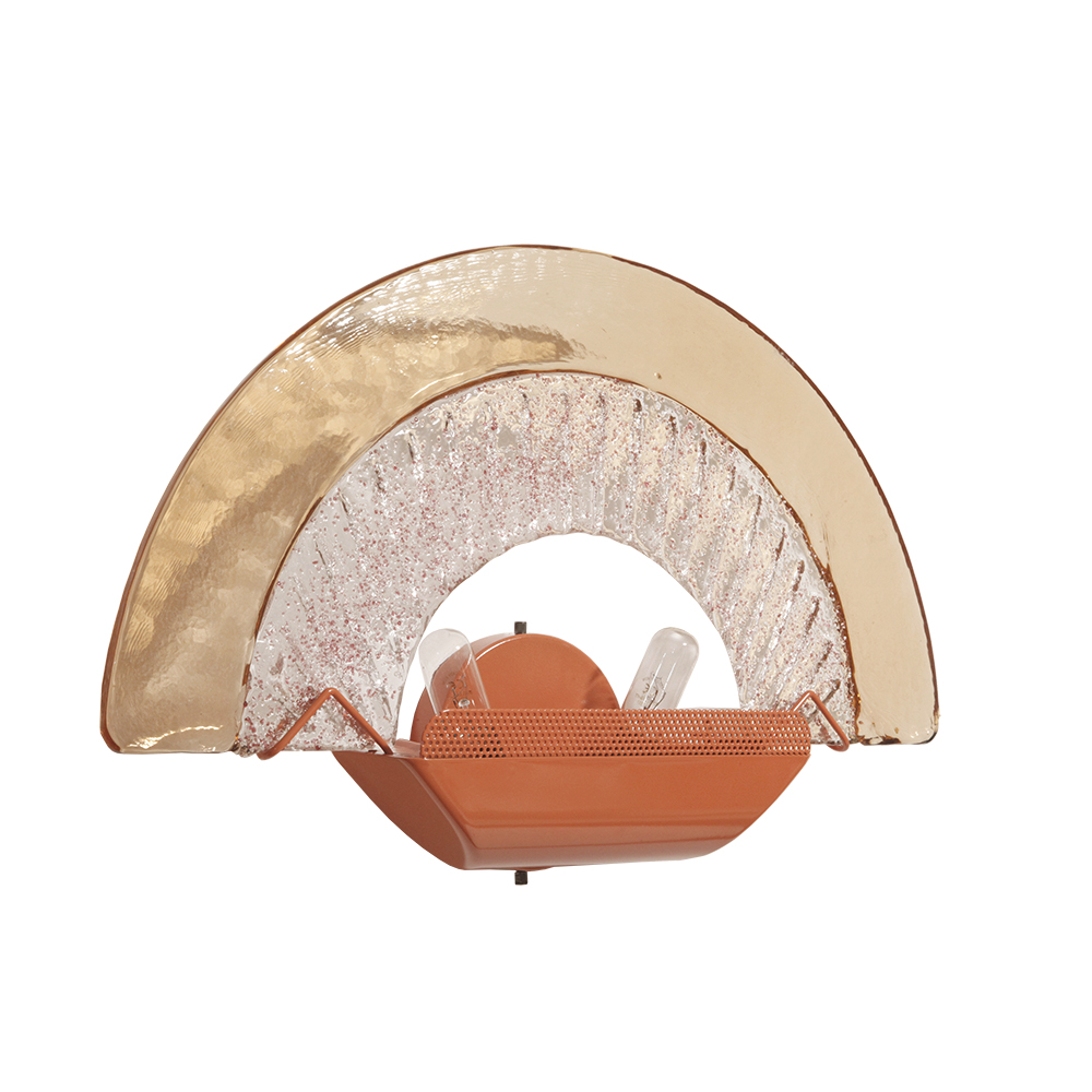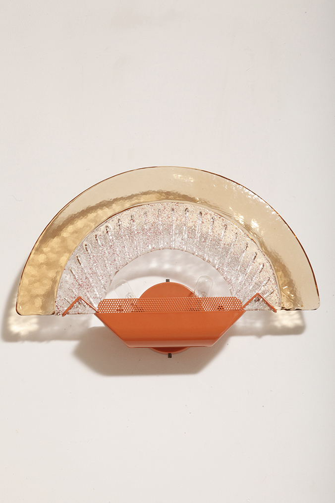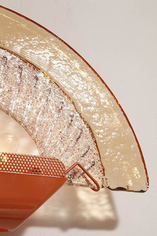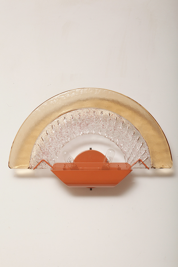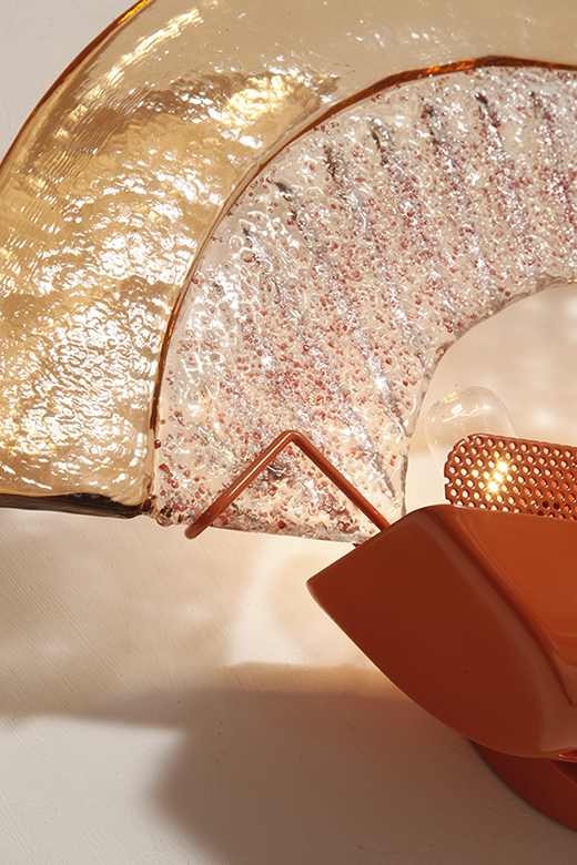 Przypomina nieco kobiecy wyrafinowany wachlarz. Górna cześć z promieniście rozchodzącymi się wyżłobieniami, dolna natomiast z zatopionymi czerwonymi i białymi opiłkami szkła.