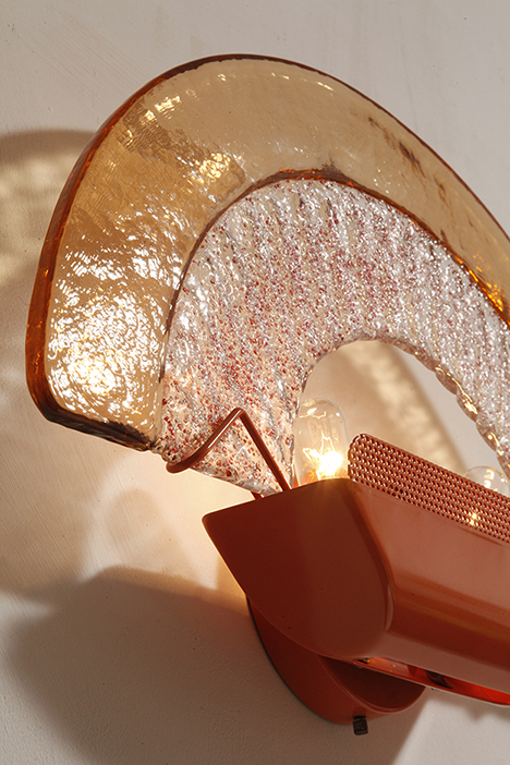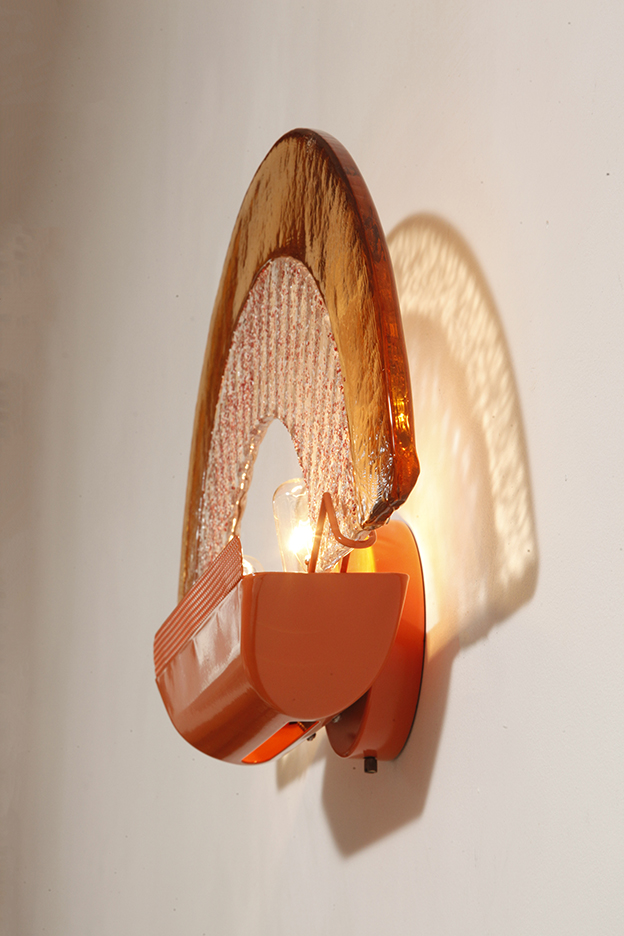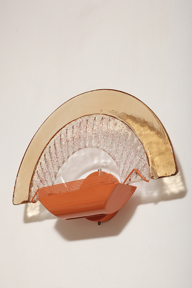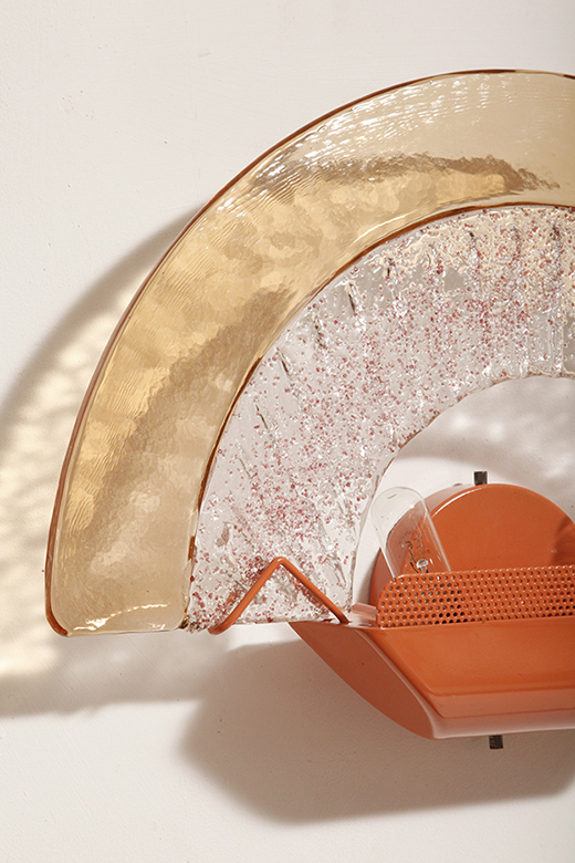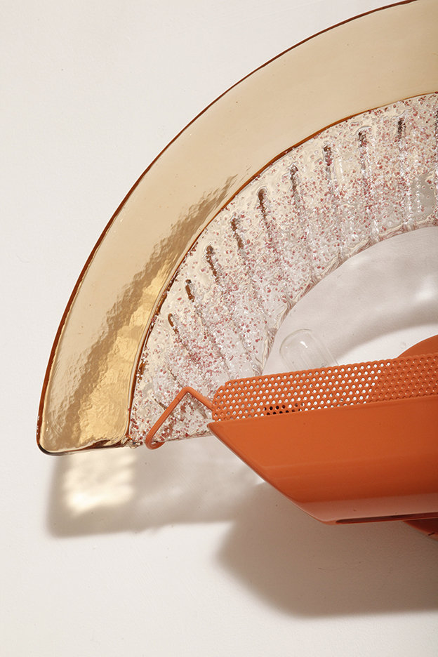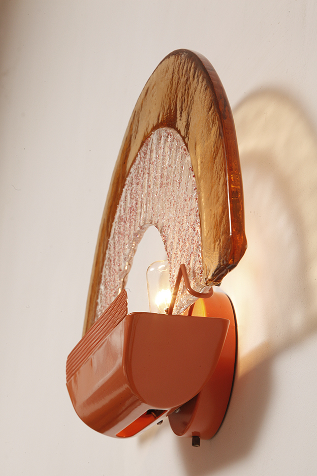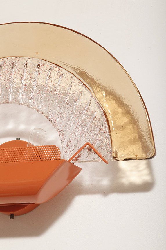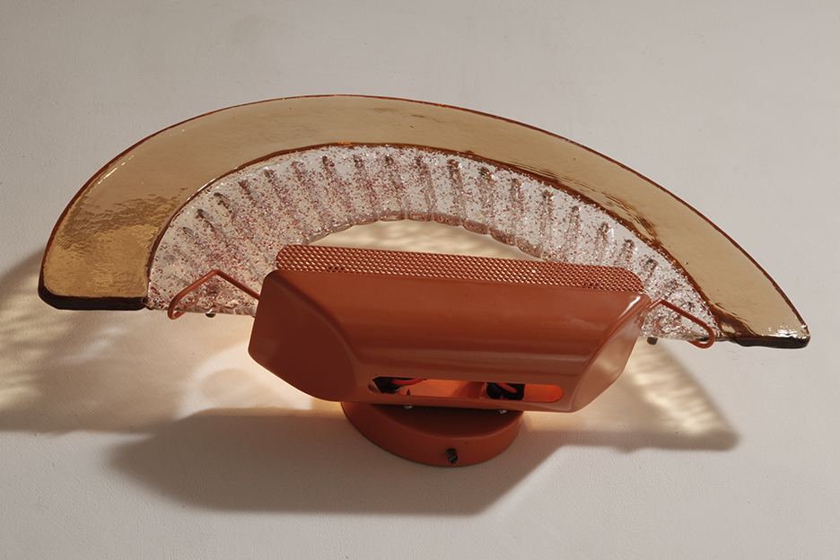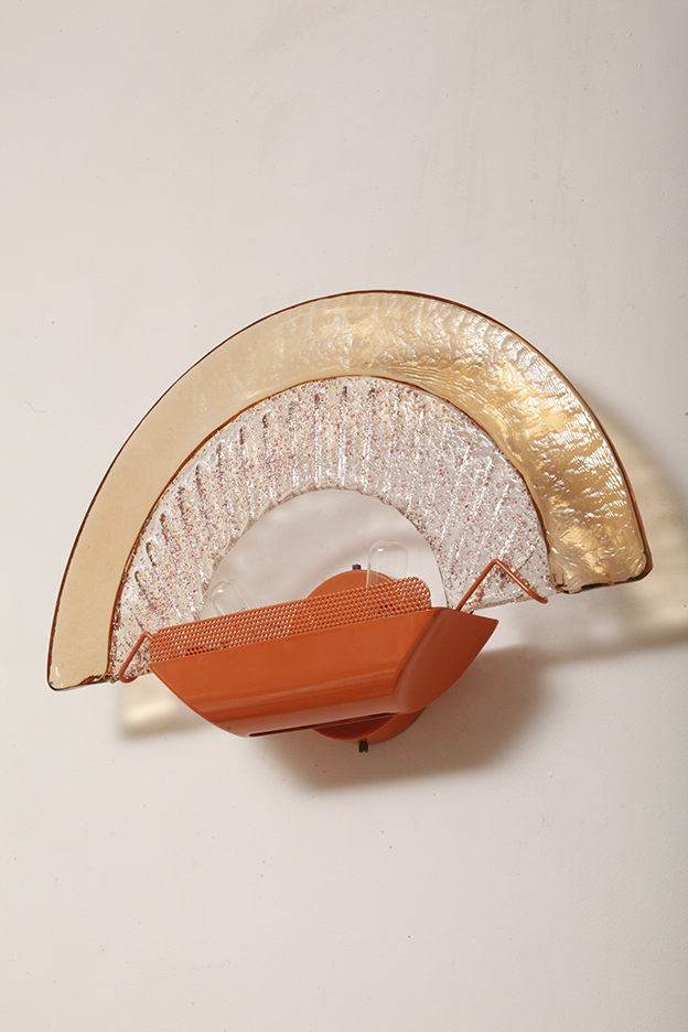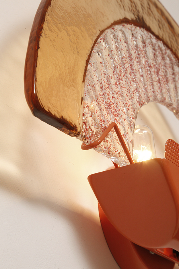 Przypomina nieco kobiecy wyrafinowany wachlarz. Górna cześć z promieniście rozchodzącymi się wyżłobieniami, dolna natomiast z zatopionymi czerwonymi i białymi opiłkami szkła.