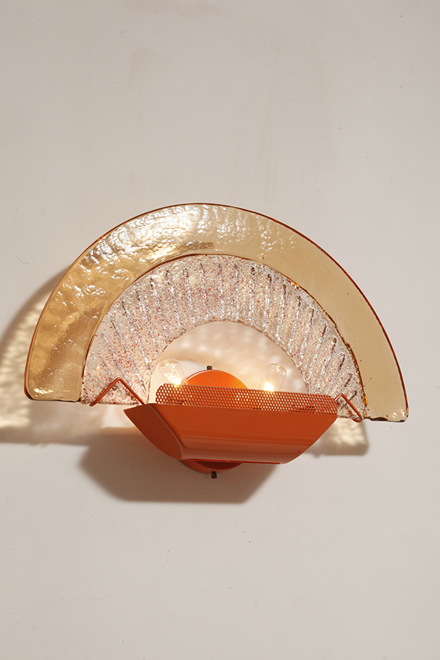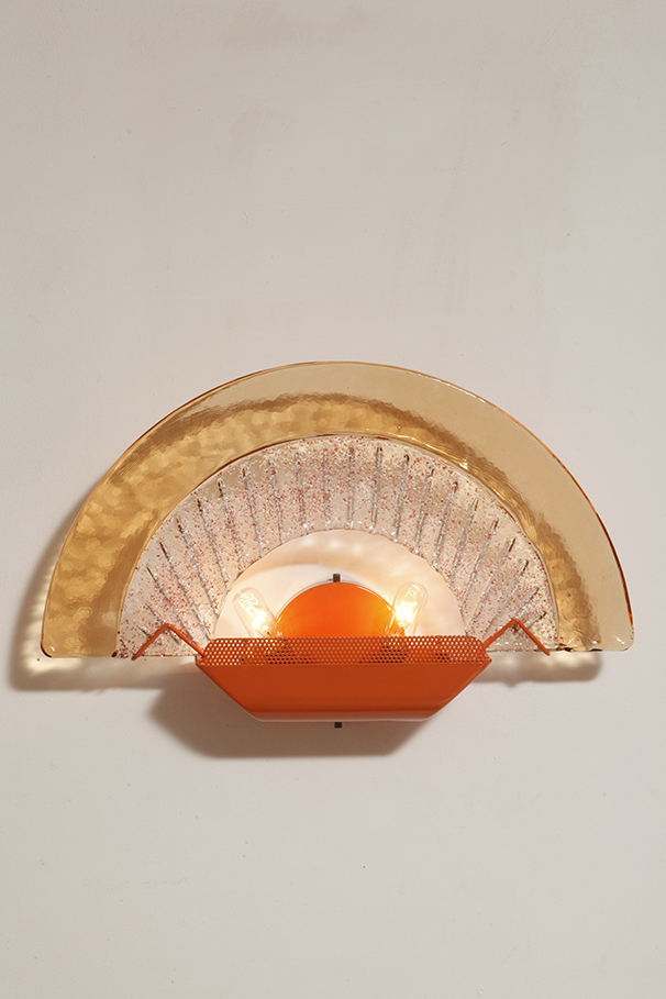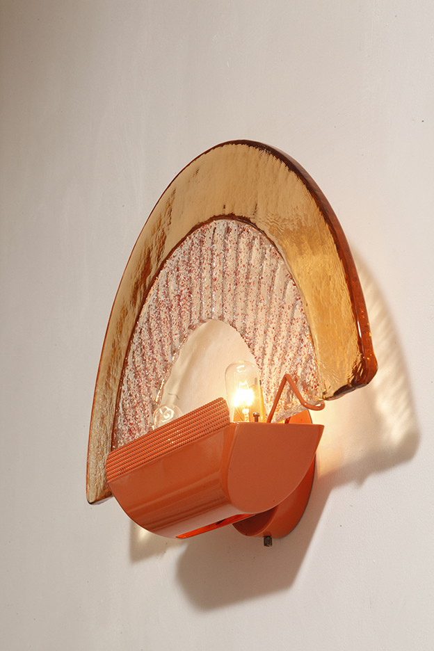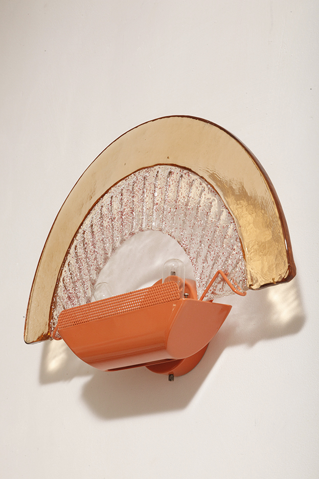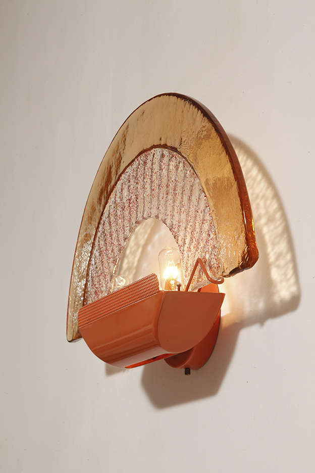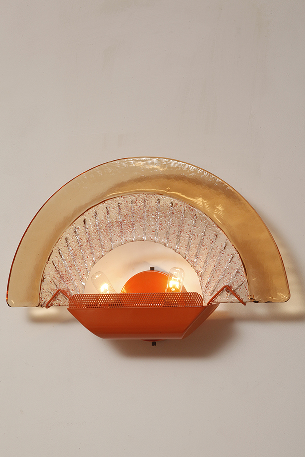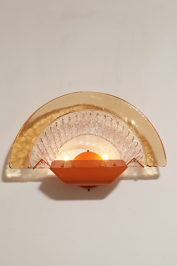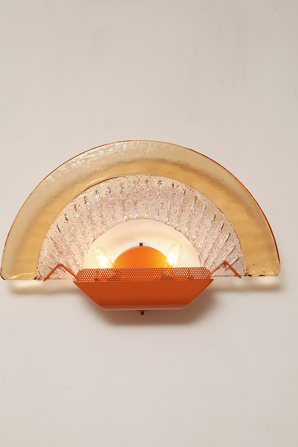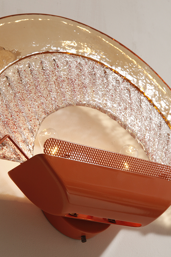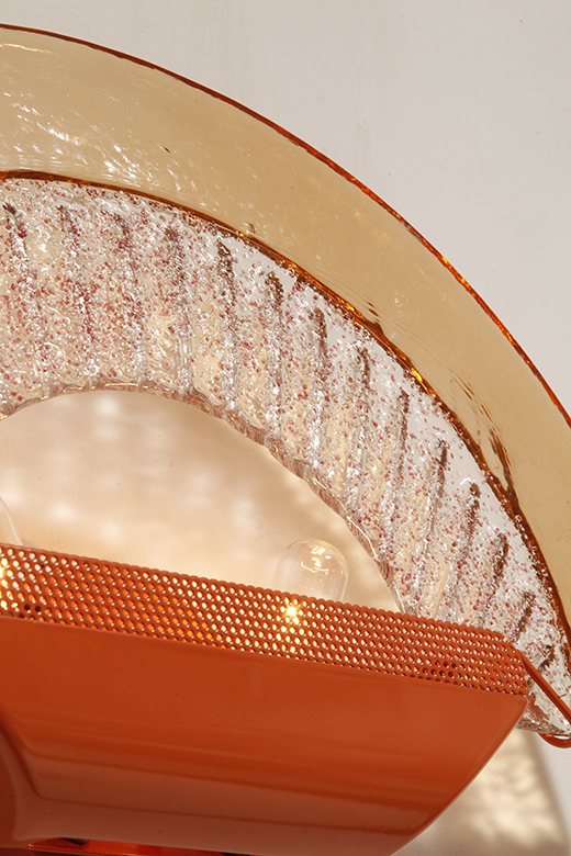 Duża dwupunktowa łososiowa lampa ścienna/kinkiet ze szklanym ręcznie formowanym fakturowym masywnym pomarańczowo-różowym kloszem, styl Art Deco, Włochy, lata 70.