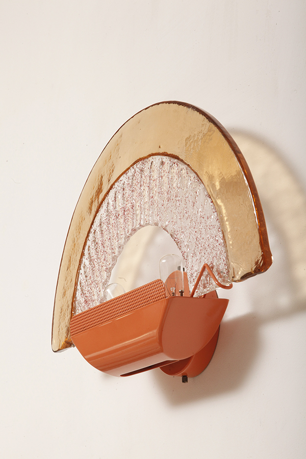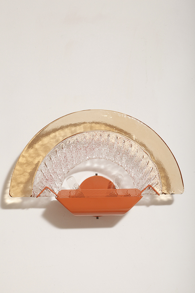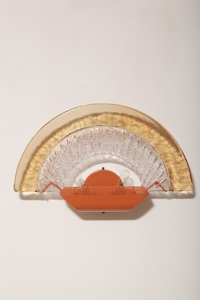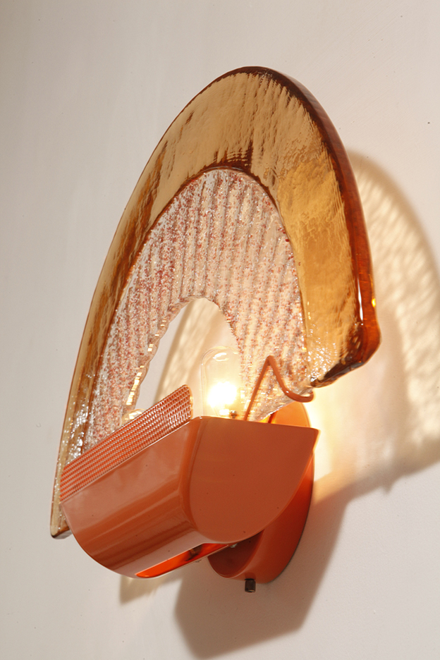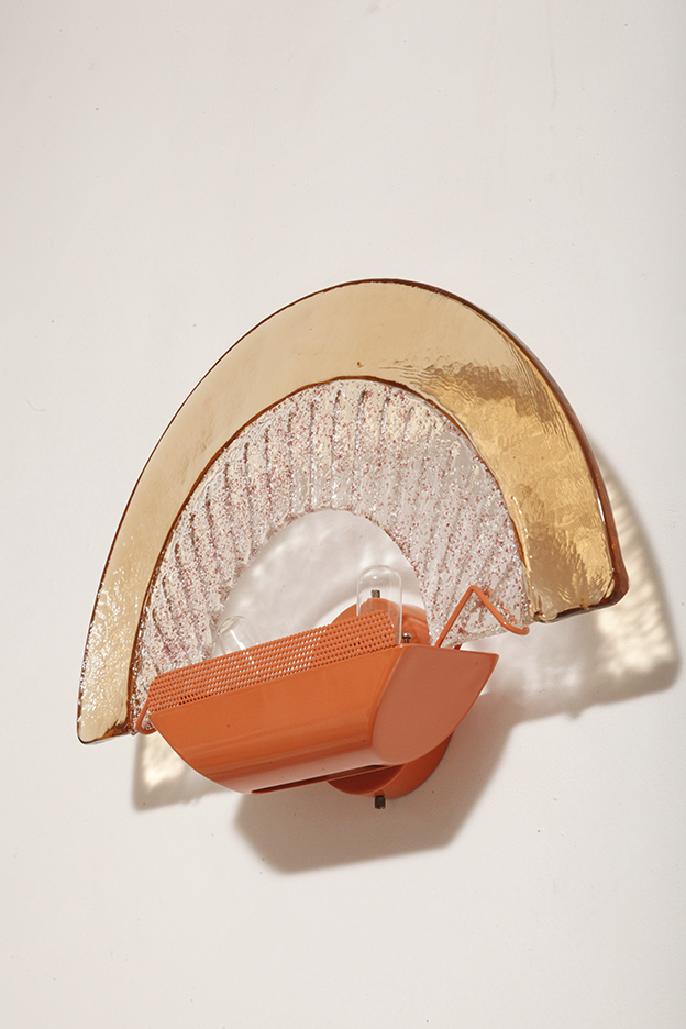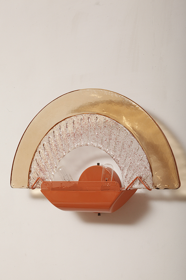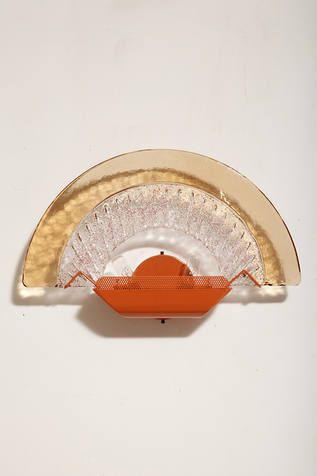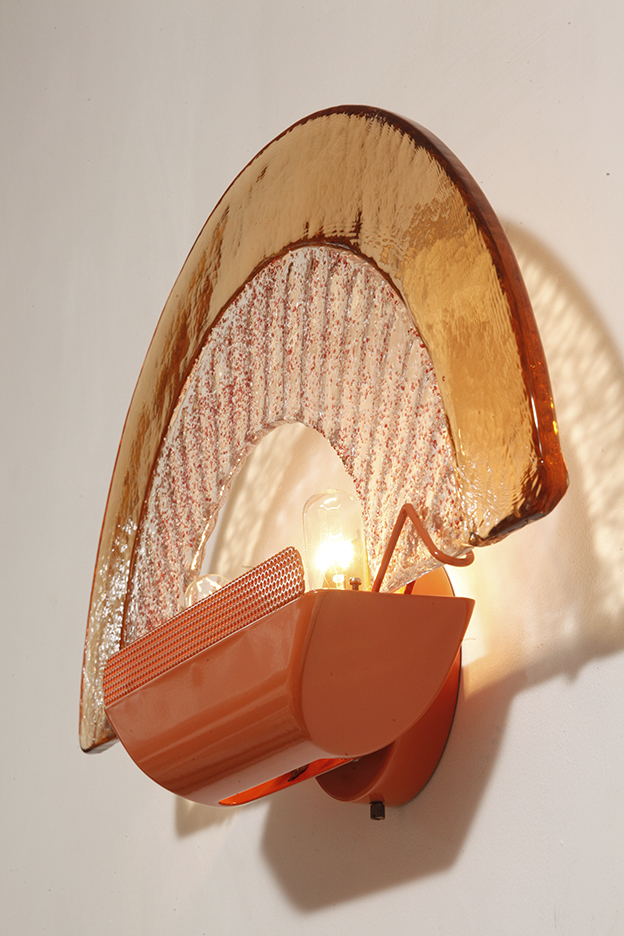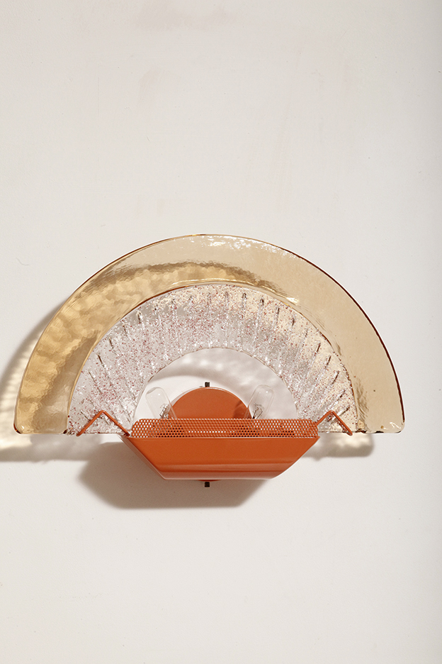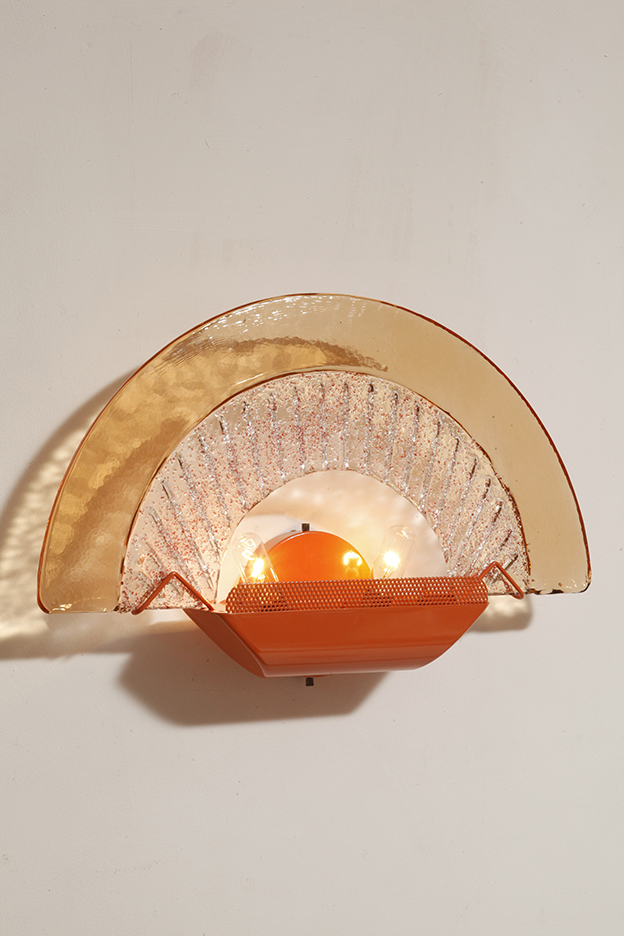 Duża dwupunktowa łososiowa lampa ścienna/kinkiet ze szklanym ręcznie formowanym fakturowym masywnym pomarańczowo-różowym kloszem, styl Art Deco, Włochy, lata 70.