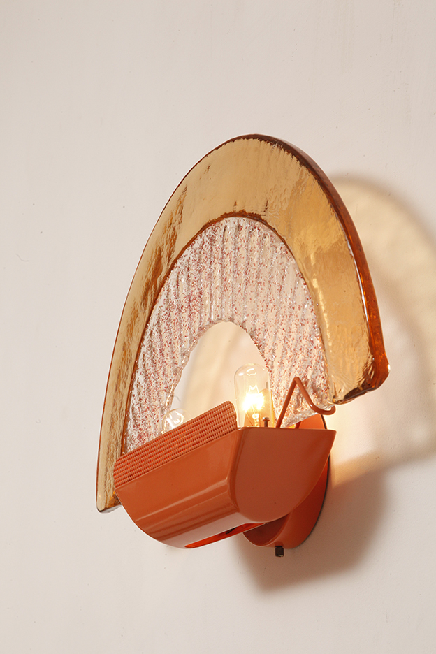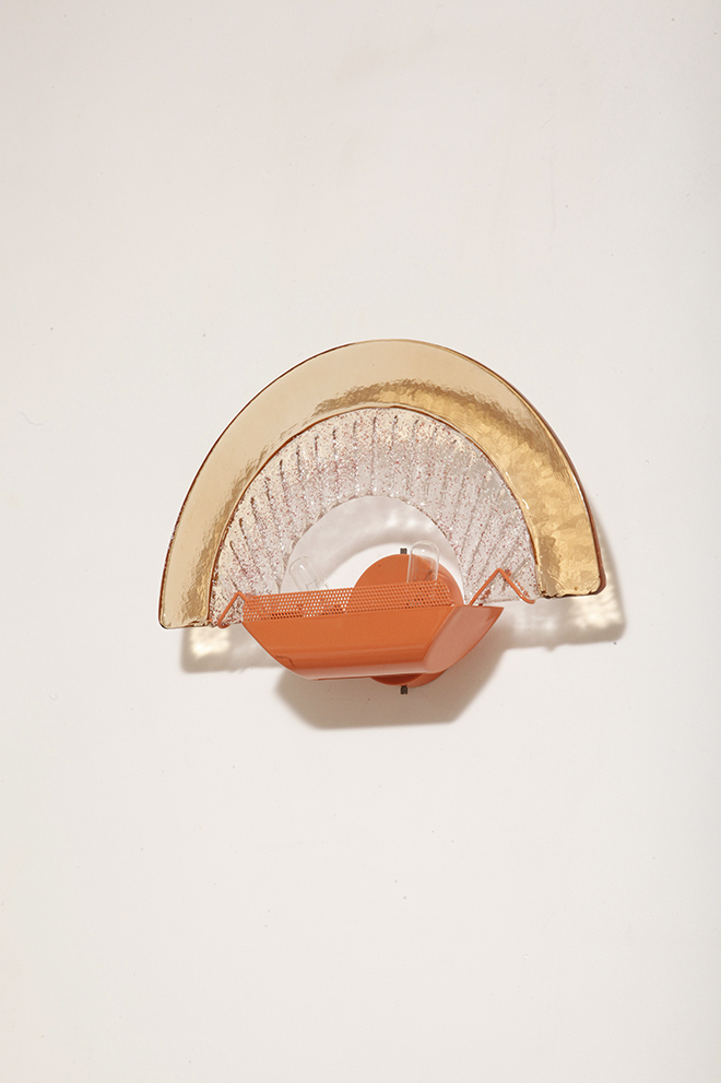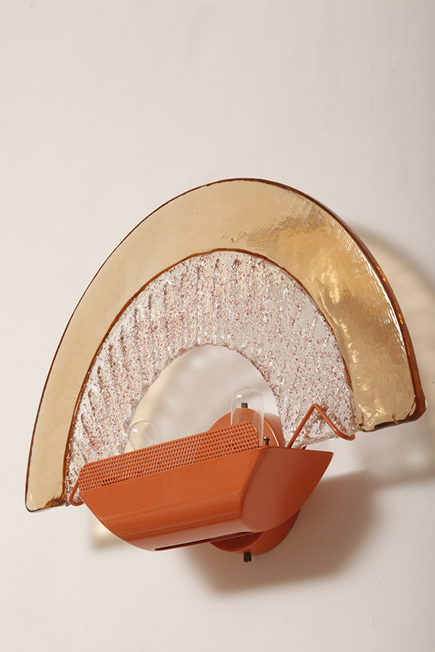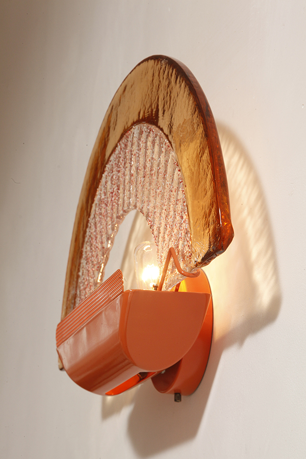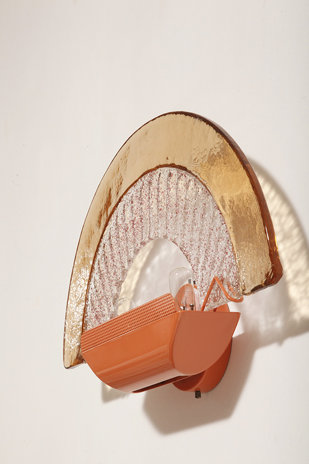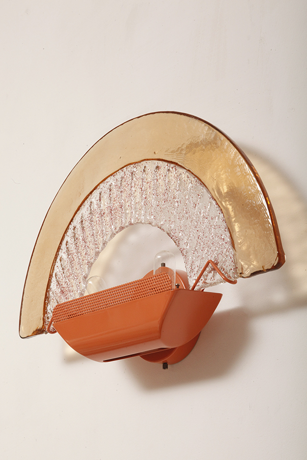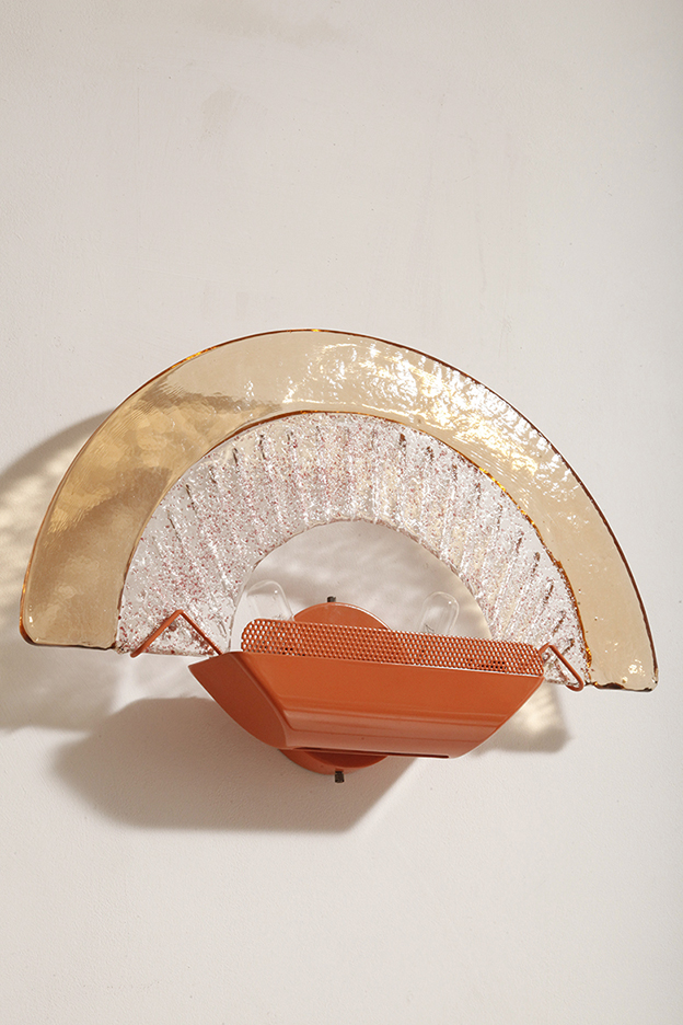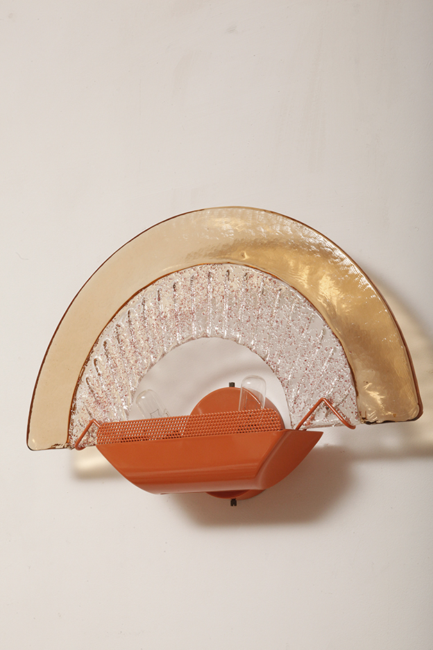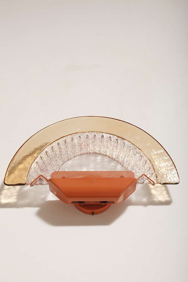 Duża dwupunktowa łososiowa lampa ścienna/kinkiet ze szklanym ręcznie formowanym fakturowym masywnym pomarańczowo-różowym kloszem, styl Art Deco, Włochy, lata 70.