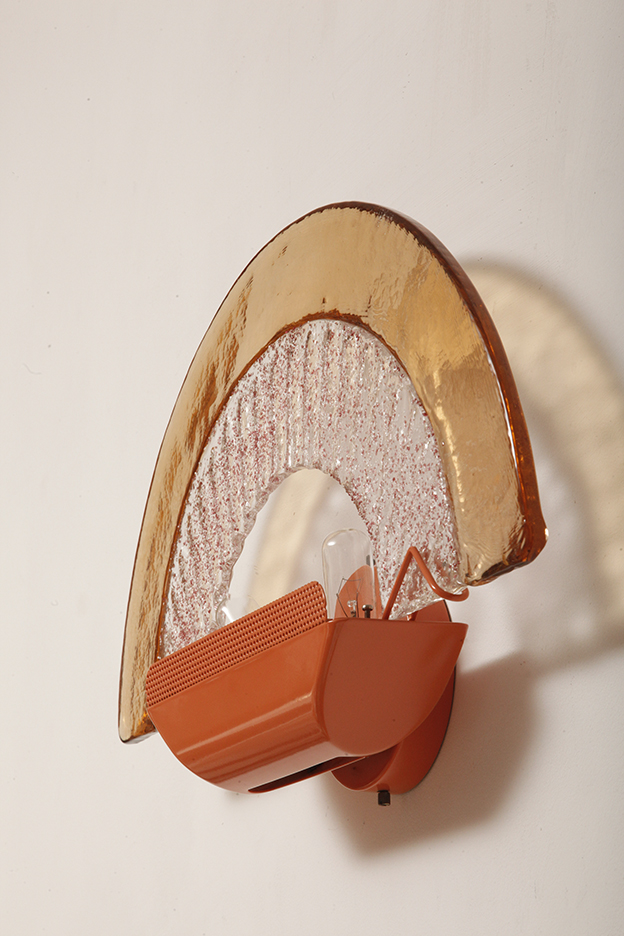 Klosz jest montowany grawitacyjnie w specjalnie zainstalowane w tym celu po obu stronach metalowe dwa uchwyty (zdjęcia). Światło dwóch żarówek rozchodzi się po jego mocno fakturowej powierzchni. Jest na co popatrzeć w każdym razie.