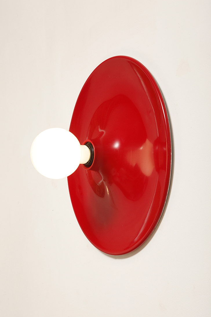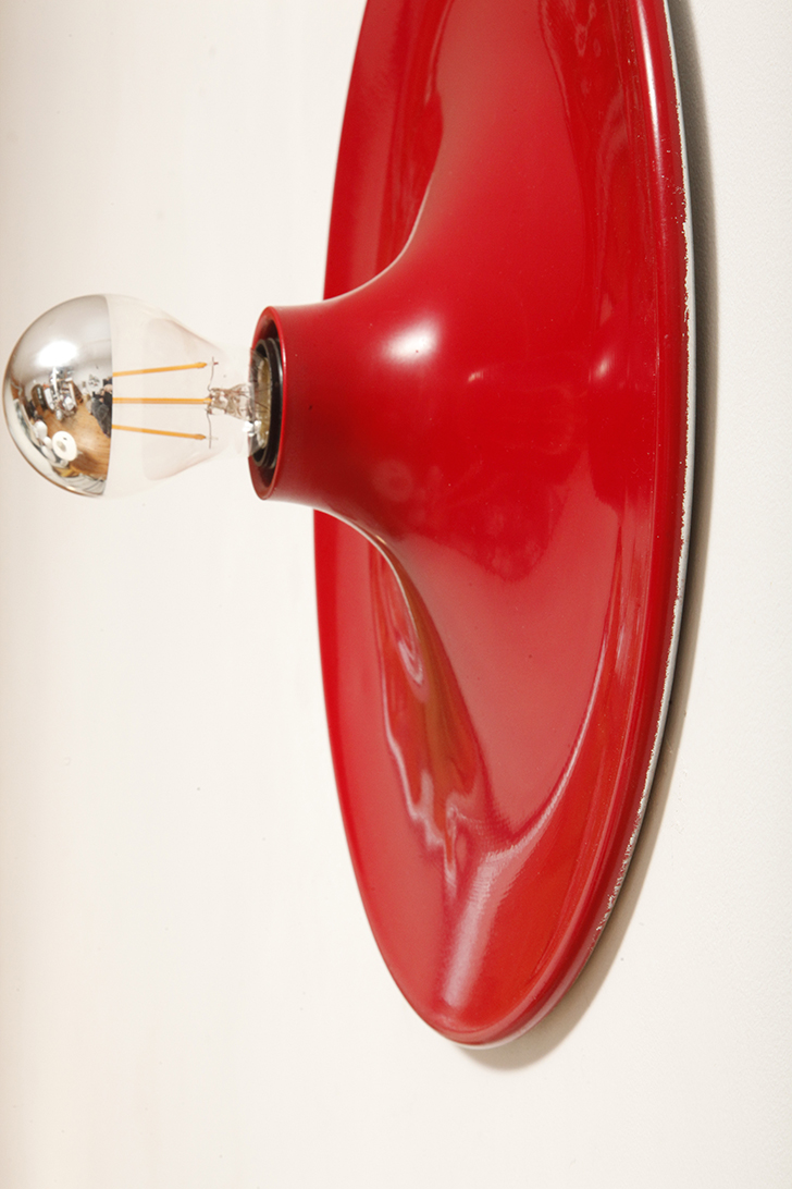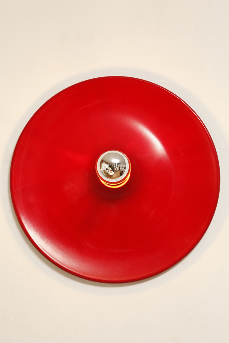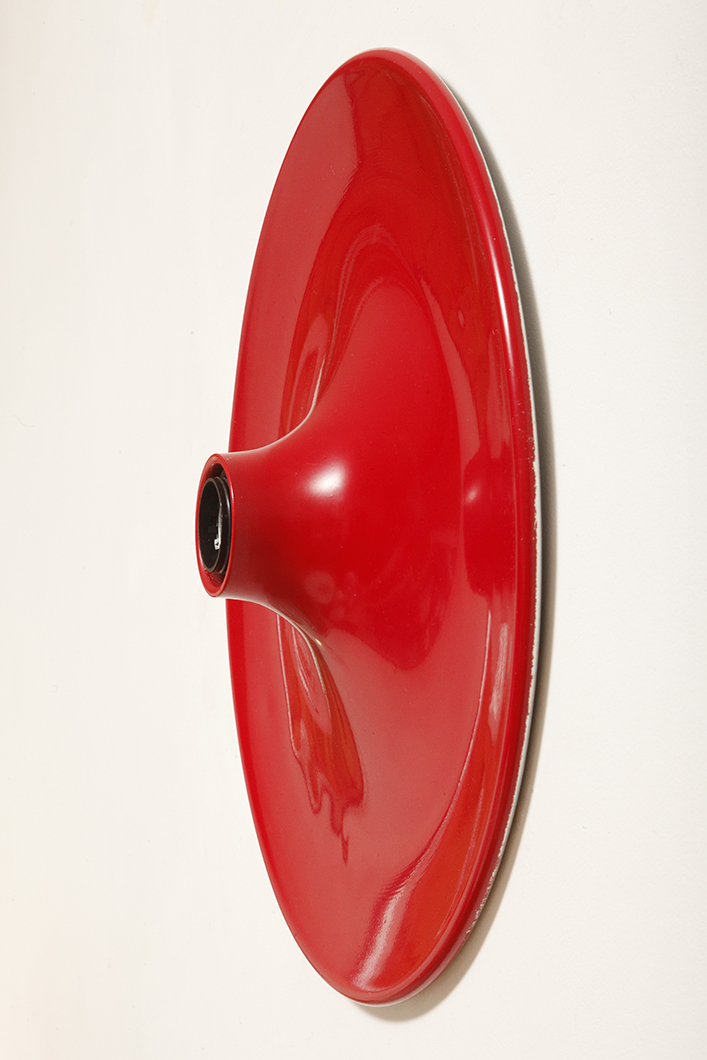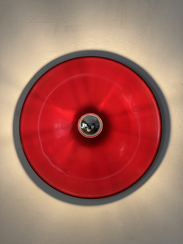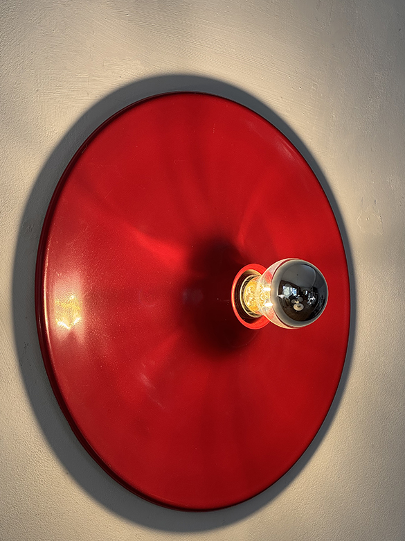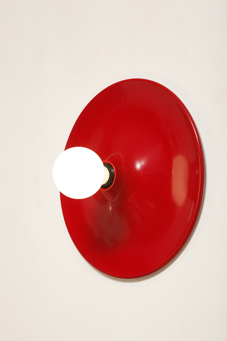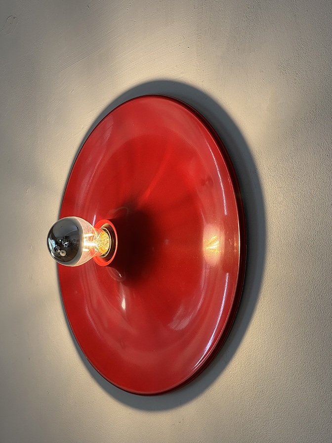 Duża jednopunktowa okrągła lakierowana na czerwono w połysku aluminiowa lampa ścienna/kinkiet, Space Age, Włochy, lata 70