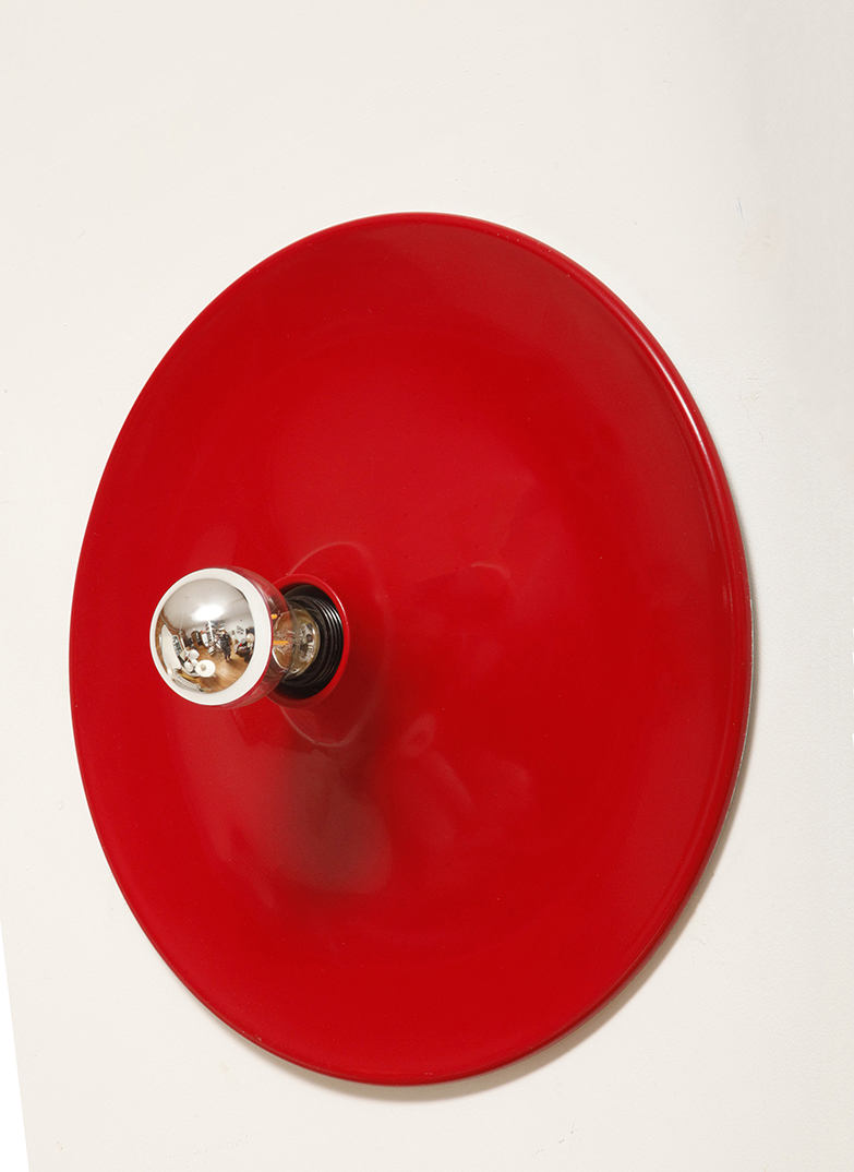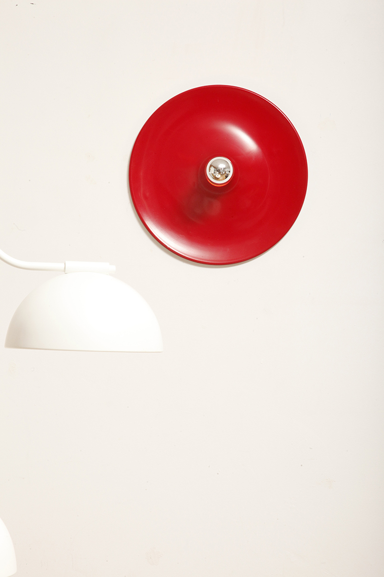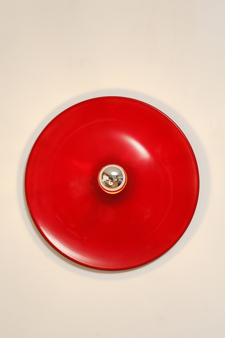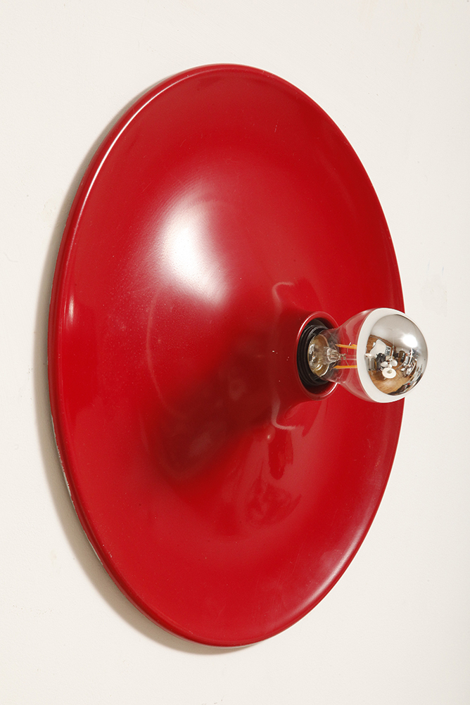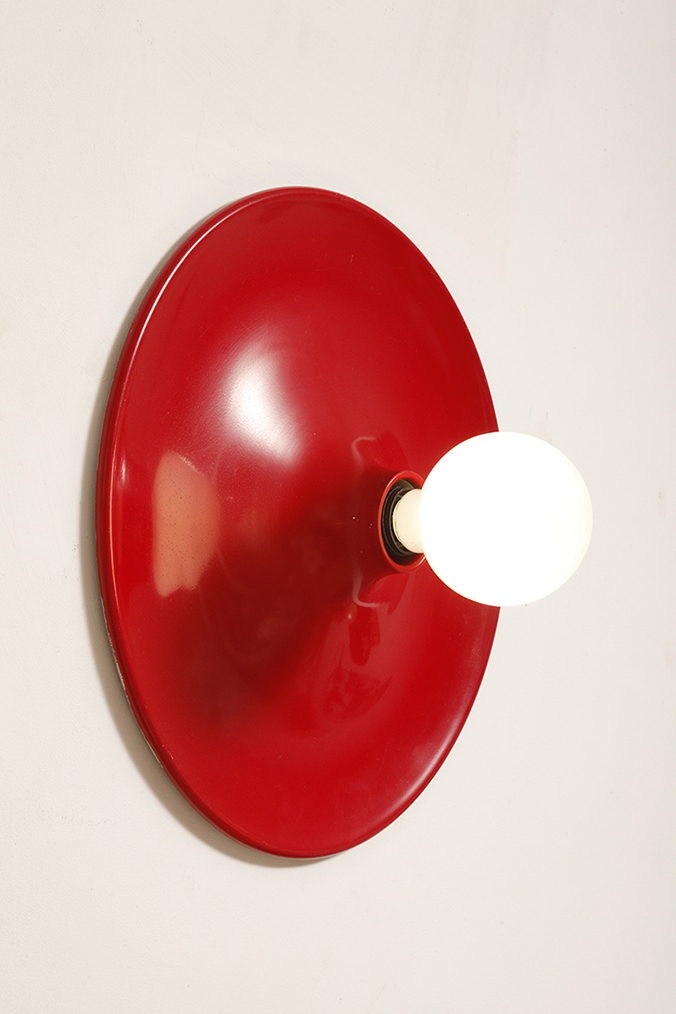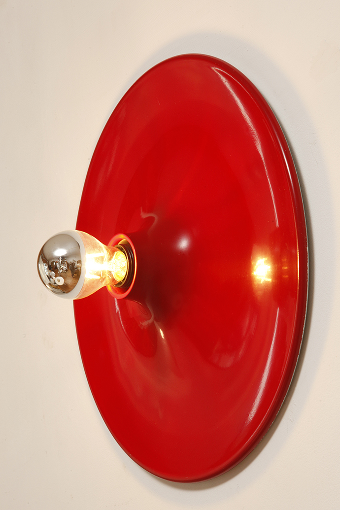 Duża jednopunktowa okrągła lakierowana na czerwono w połysku aluminiowa lampa ścienna/kinkiet, Space Age, Włochy, lata 70