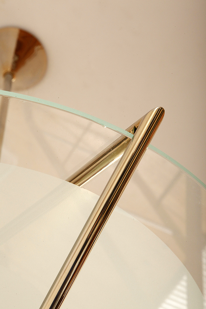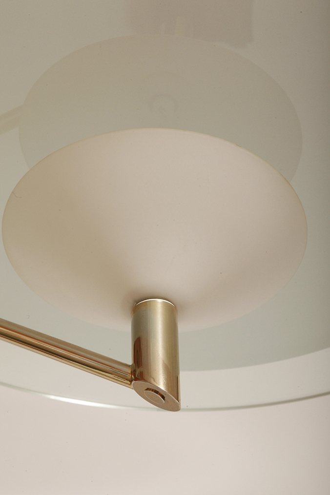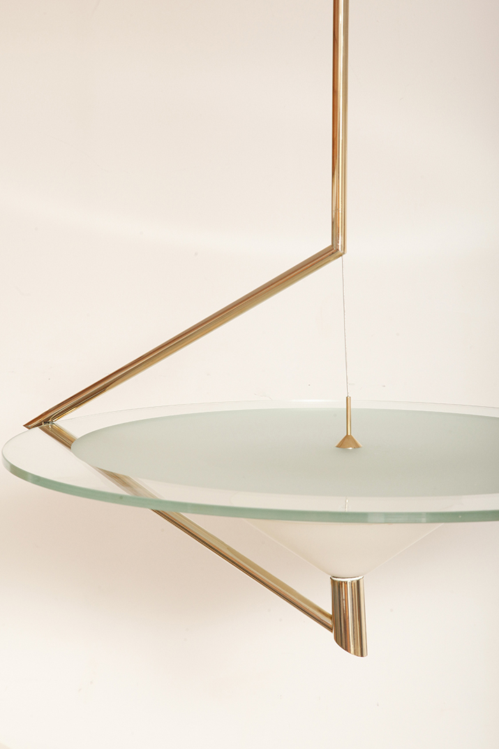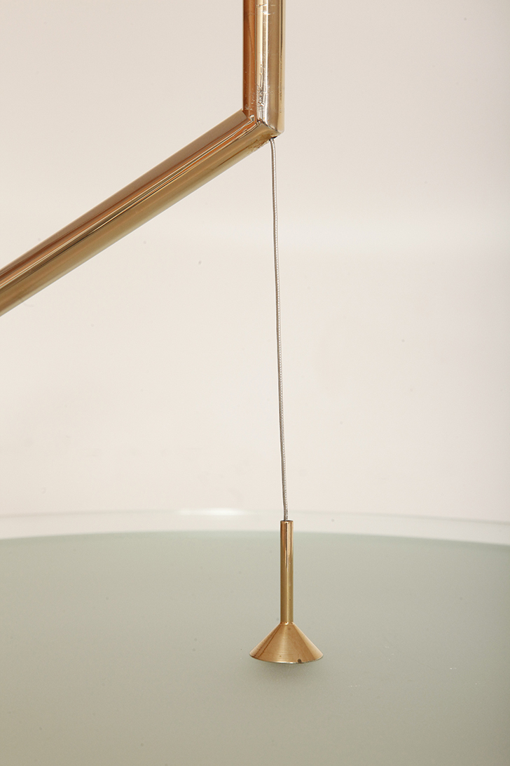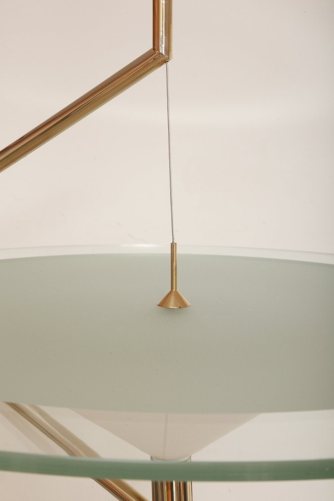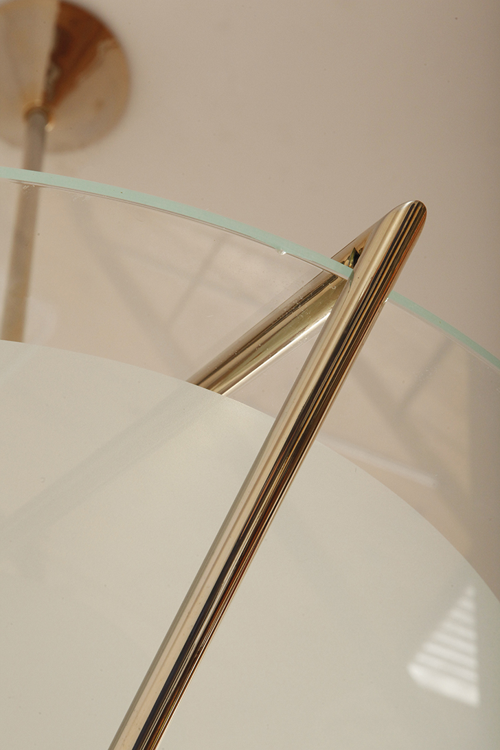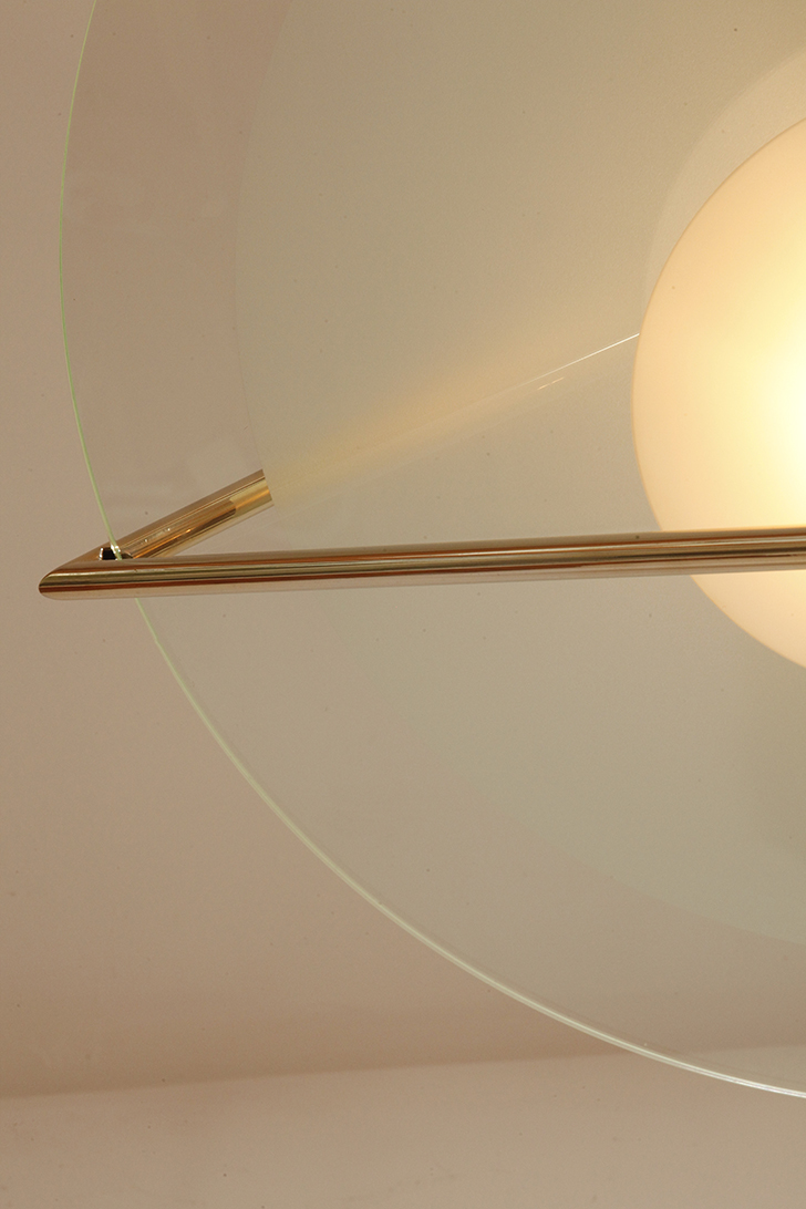 Szklany klosz z białym środkiem z jednej strony w połysku, z drugiej matowym, konstrukcja z chromowanych stalowych rurek, szklany dolny klosz w kształcie przewróconego matowego stożka. Szkło opalowe.