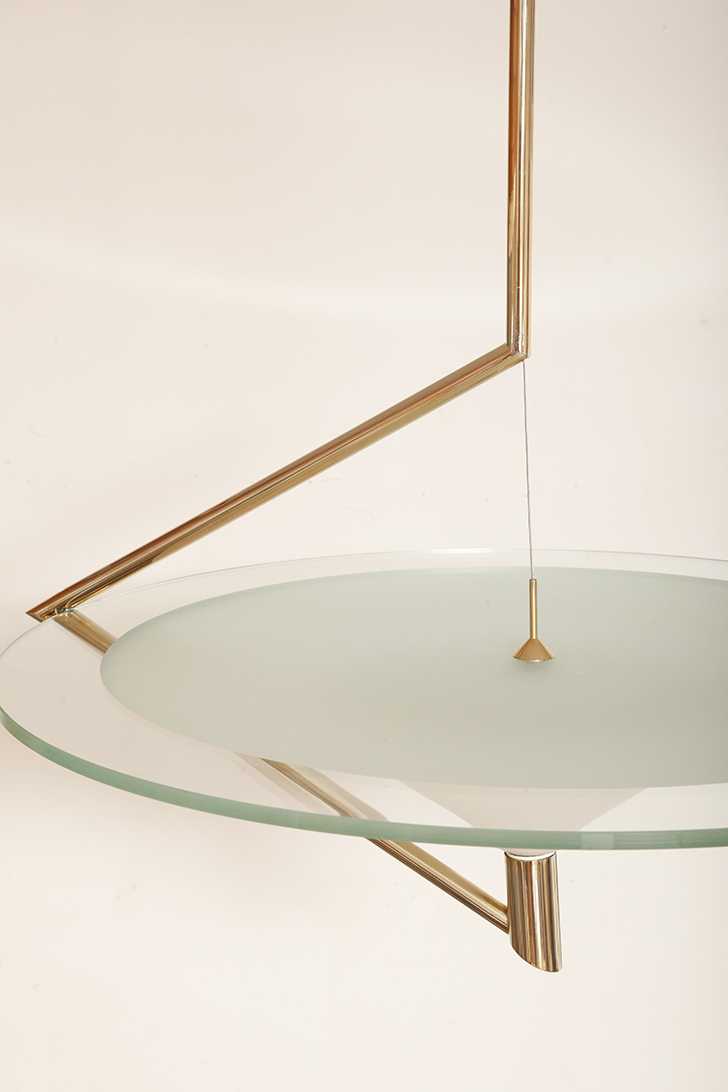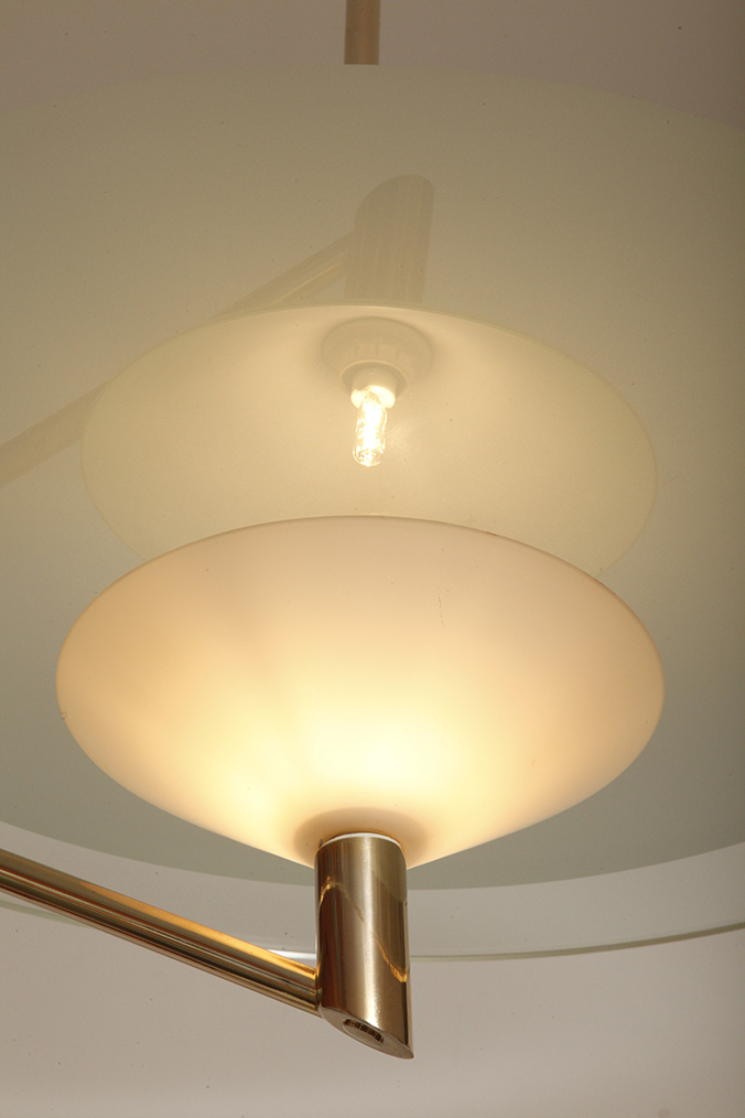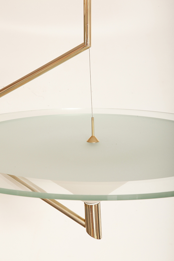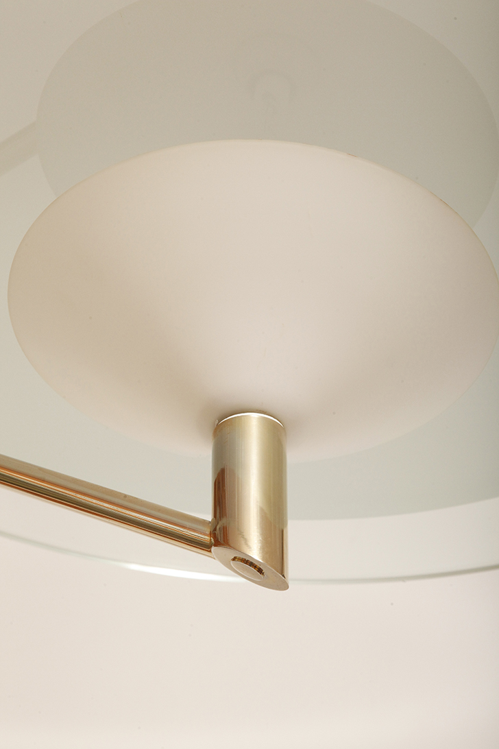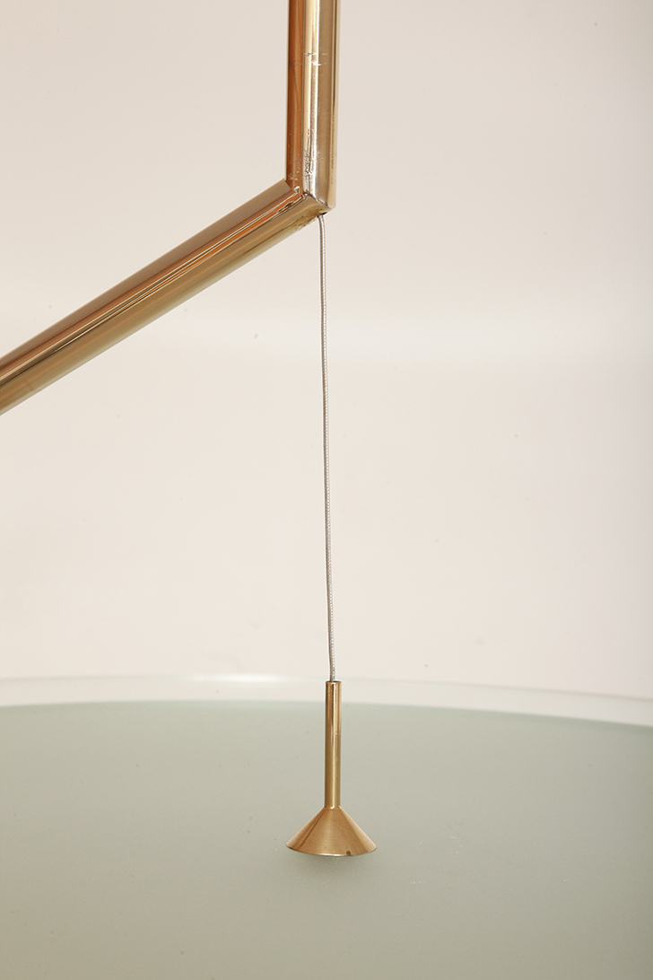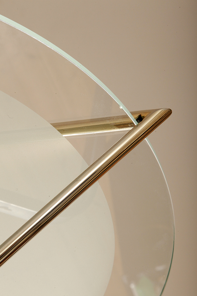 Szklany klosz z białym środkiem z jednej strony w połysku, z drugiej matowym, konstrukcja z chromowanych stalowych rurek, szklany dolny klosz w kształcie przewróconego matowego stożka. Szkło opalowe.