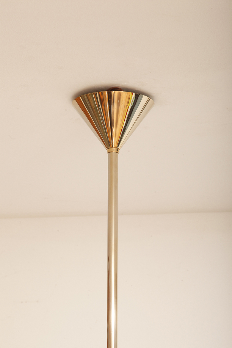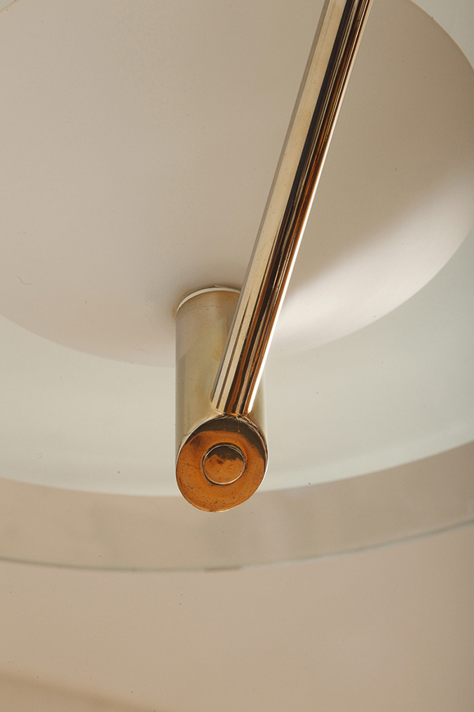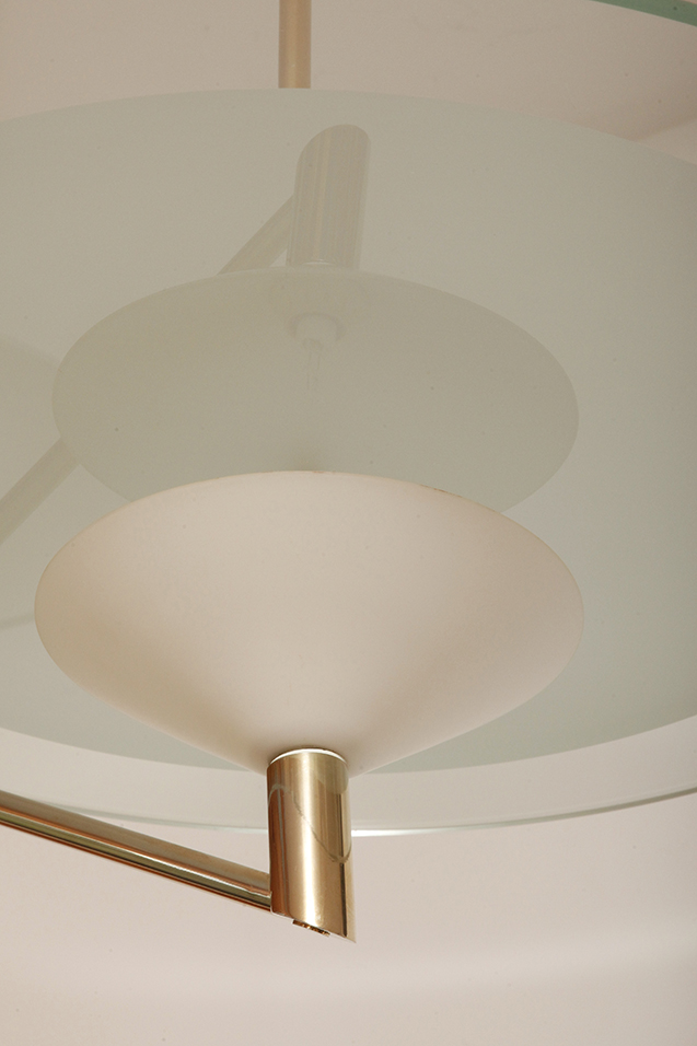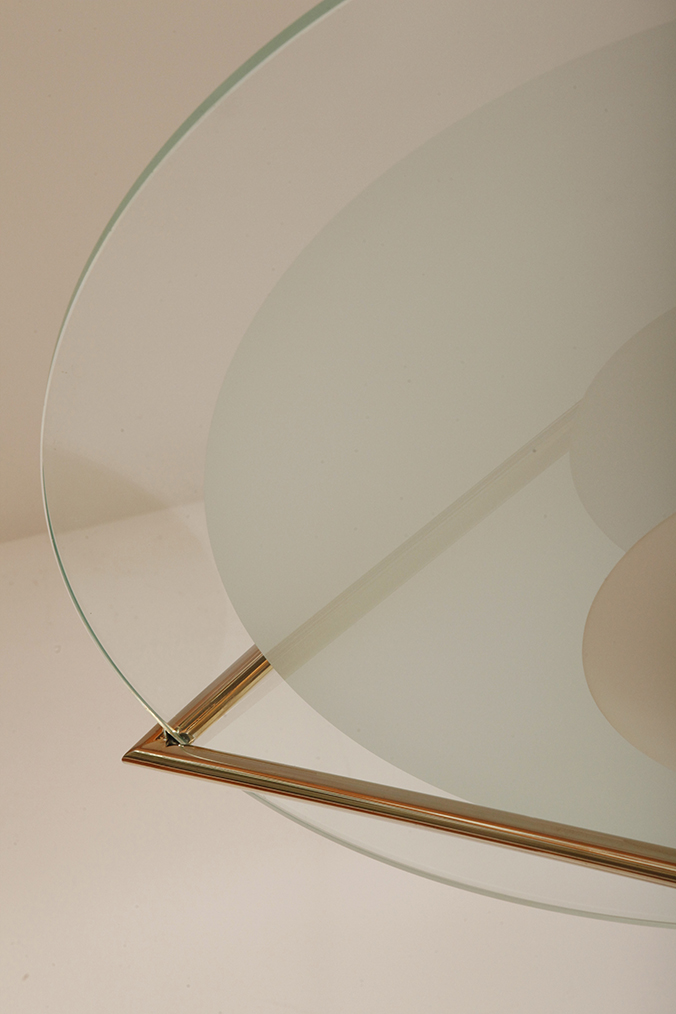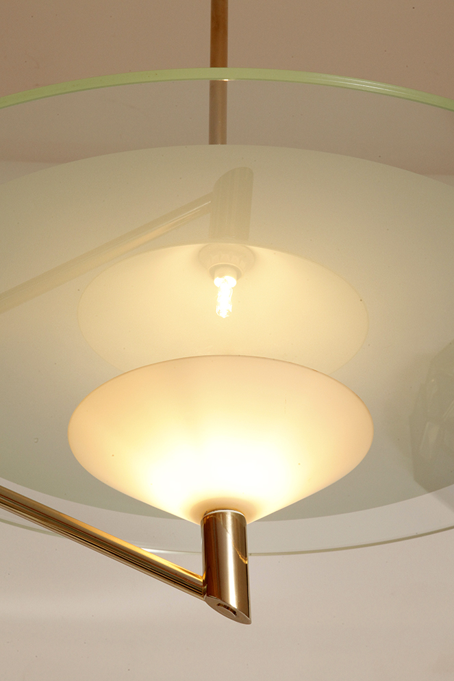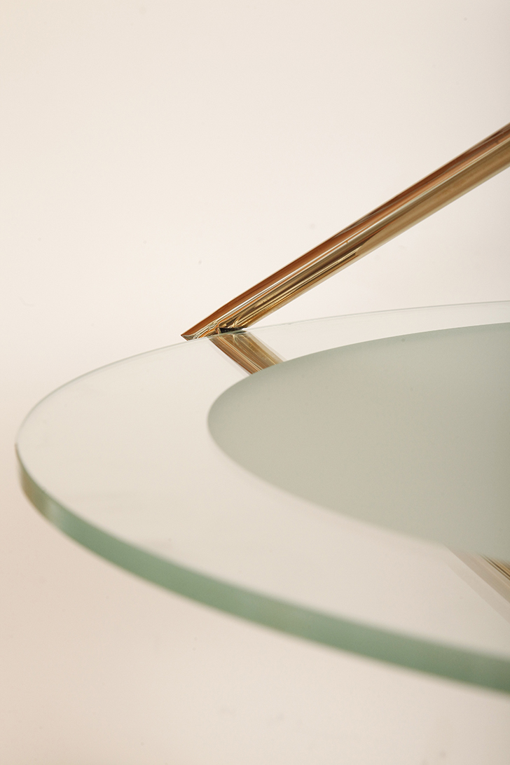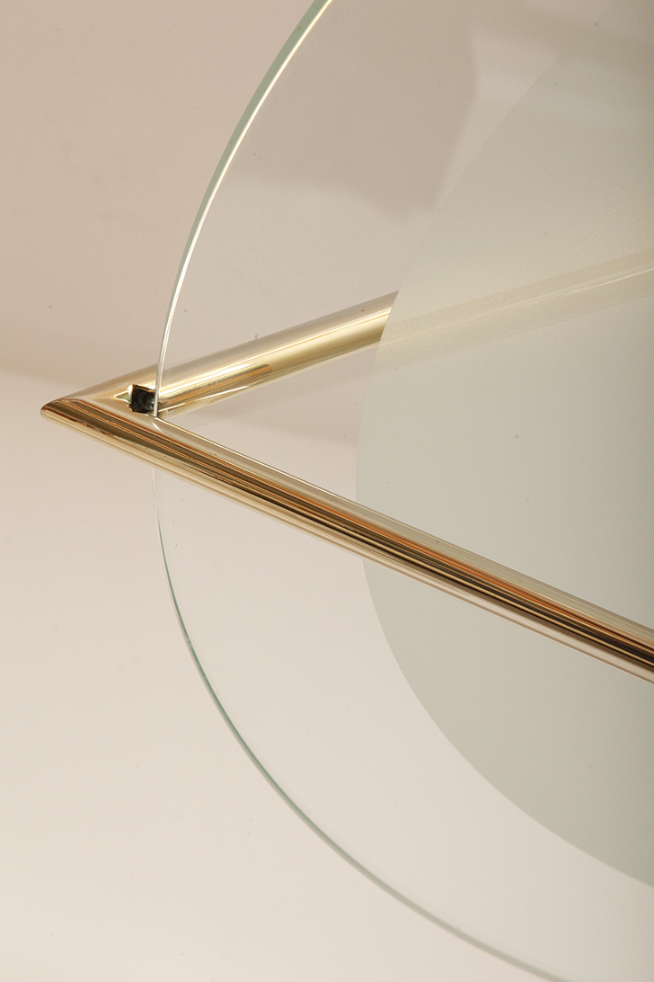 Szklany klosz z białym środkiem z jednej strony w połysku, z drugiej matowym, konstrukcja z chromowanych stalowych rurek, szklany dolny klosz w kształcie przewróconego matowego stożka. Szkło opalowe.