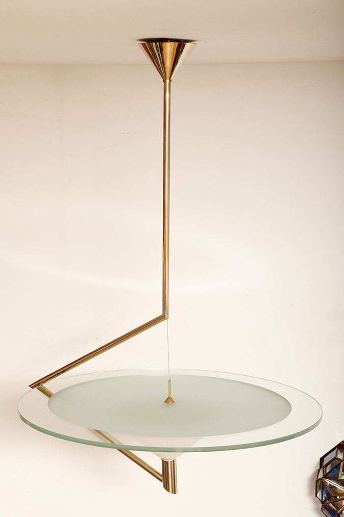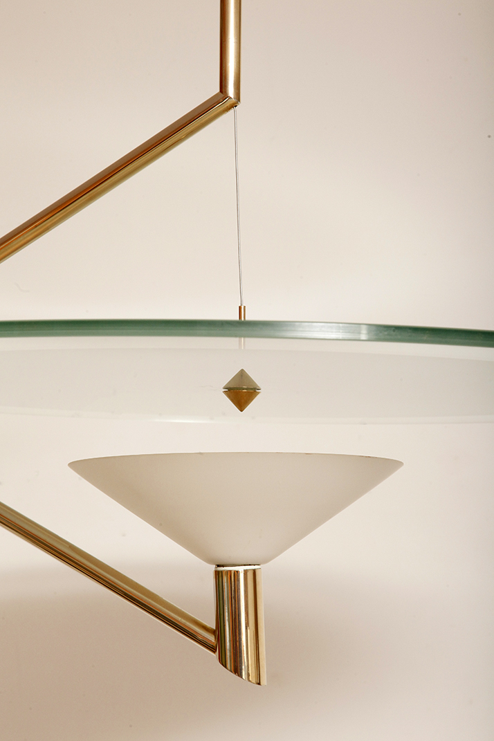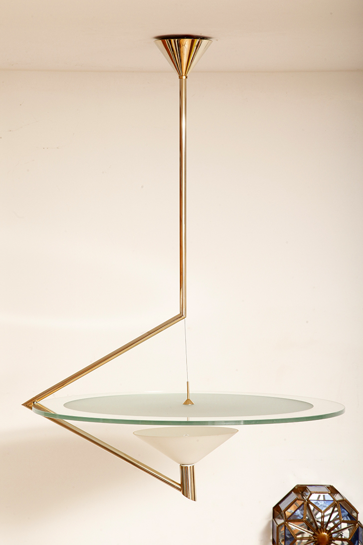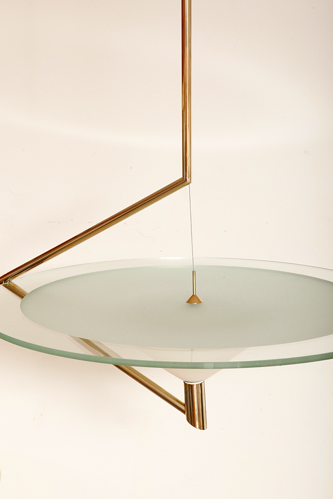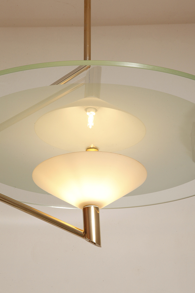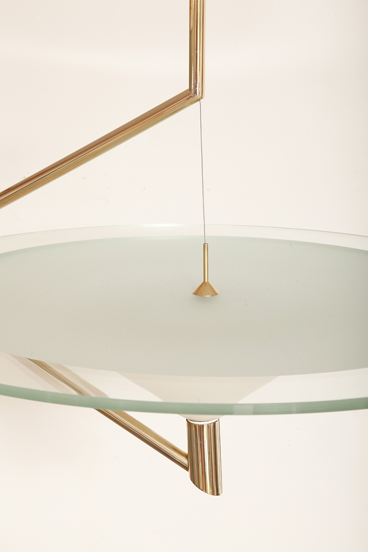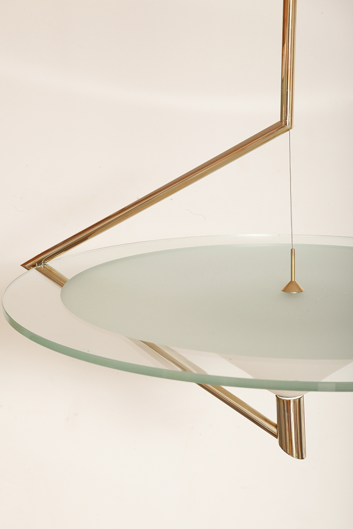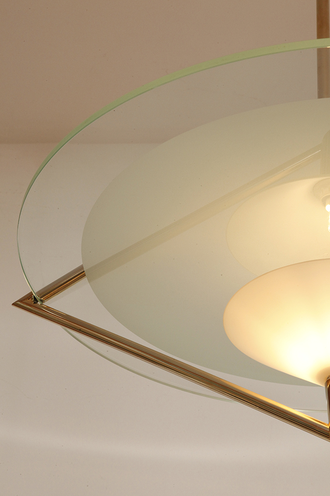 Duża lampa sufitowa „Olympia 2731” z okrągłym masywnym szklanym kloszem w kształcie koła zawieszonym na stalowej złotej konstrukcji, projekt Daniel Puppa dla Fontana Arte/Mediolan, Włochy, wzór z 1984 roku