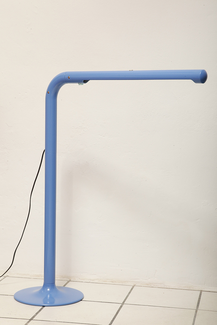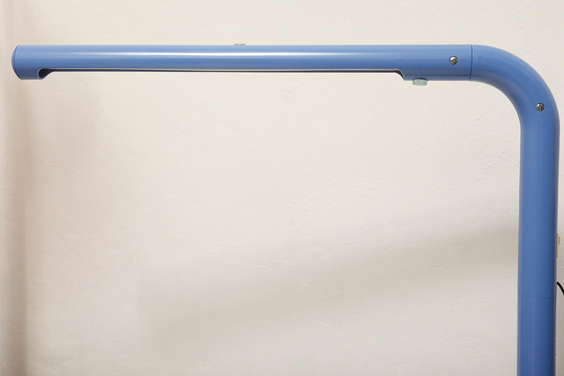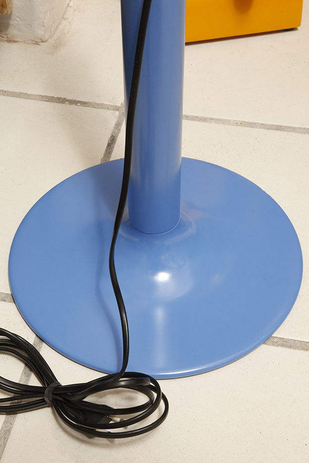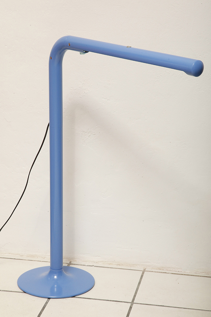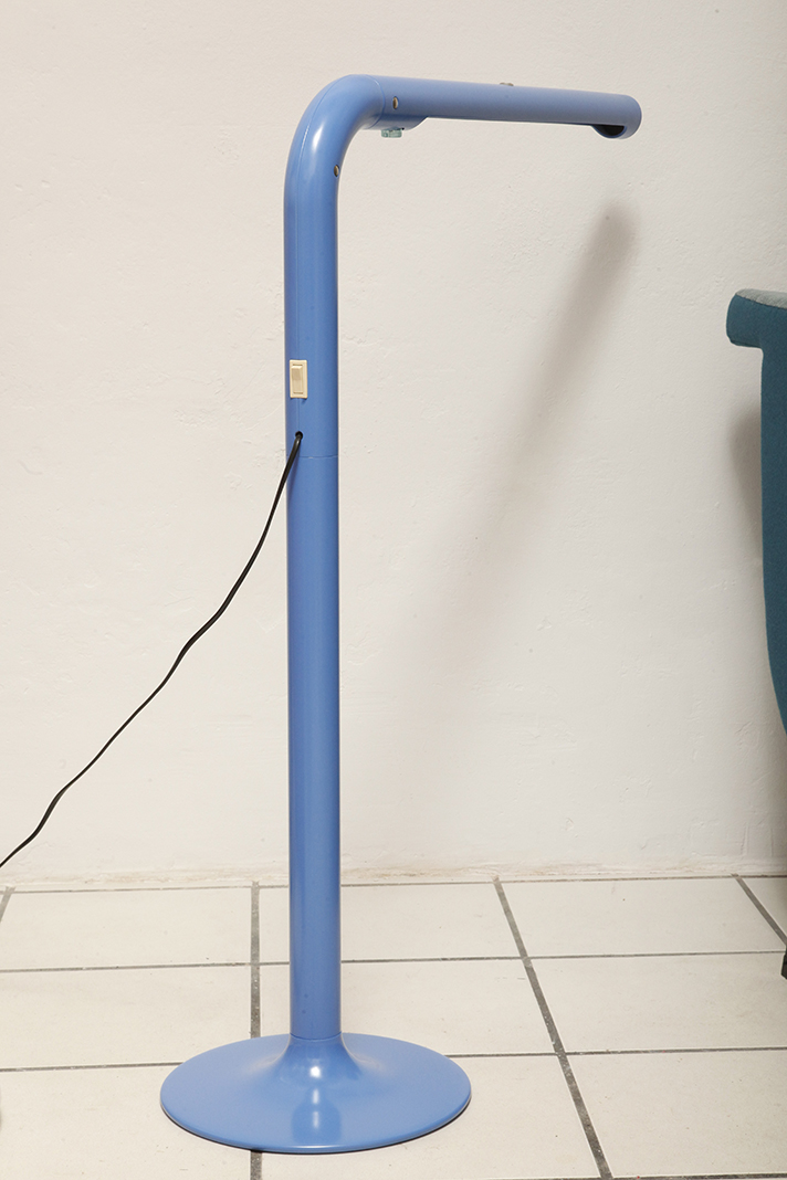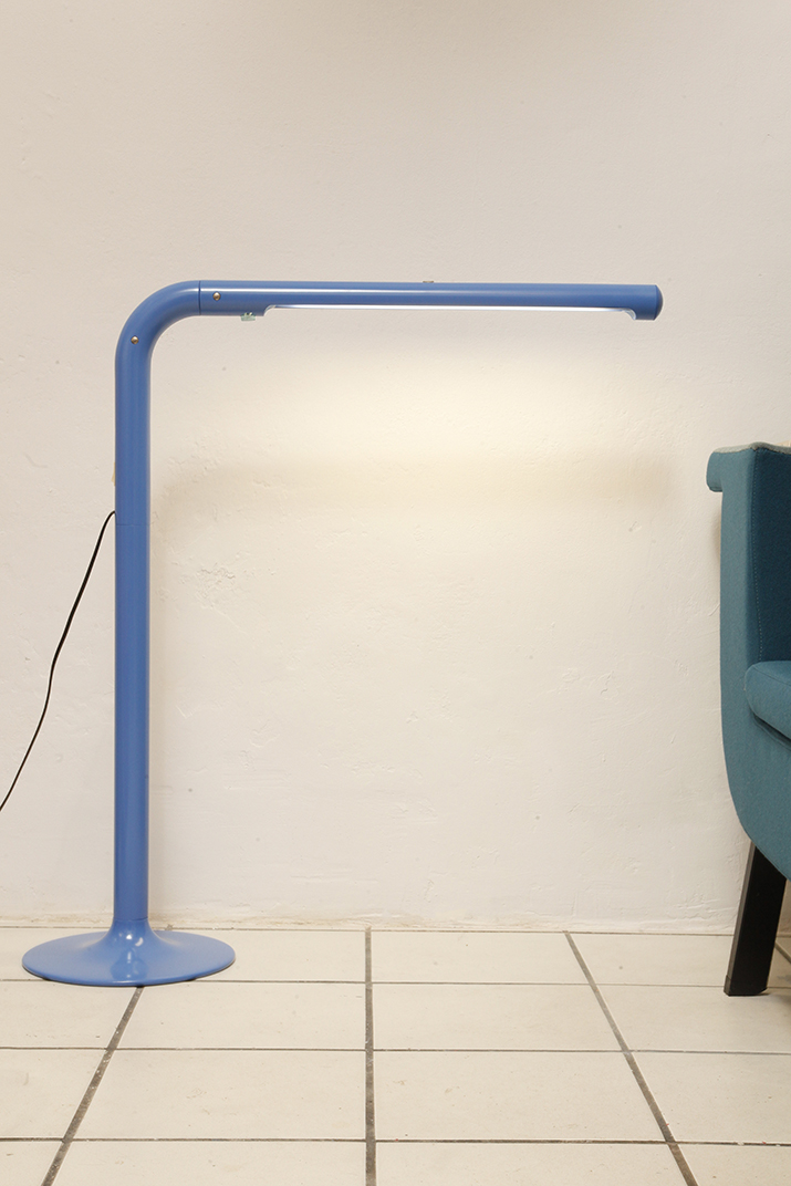Duża niebieska jednopunktowa lampa biurkowa/podłogowa w kształcie odwróconego „L” z tworzywa sztucznego z metalową okrągłą podstawą „Tube”, projekt Anders Pehrson dla Ateljé Lyktan, Space Age, Szwecja, wzór z 1973 roku