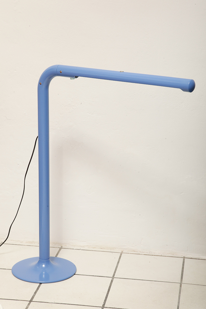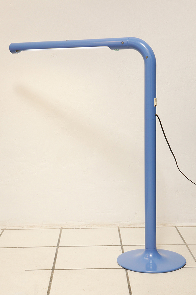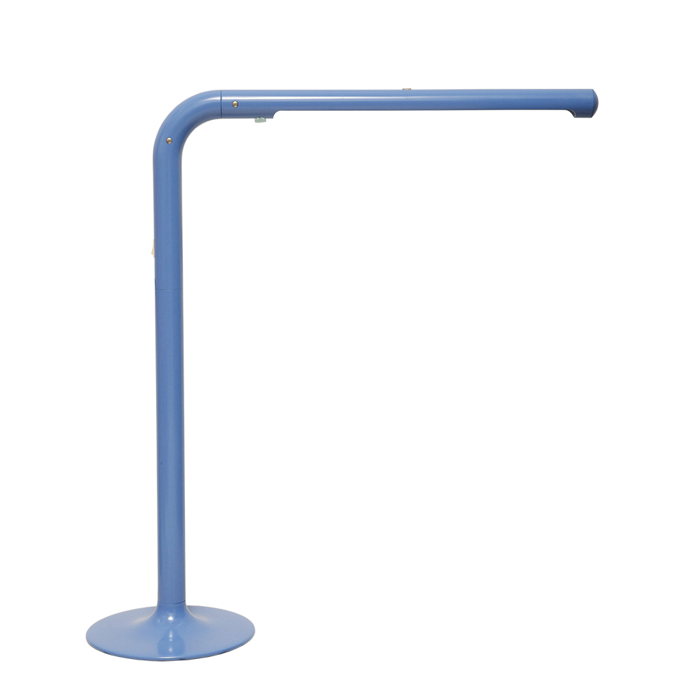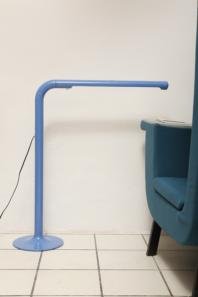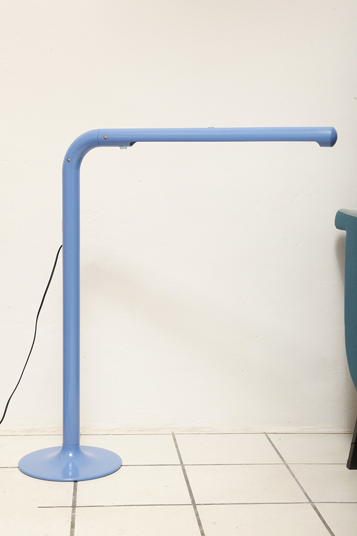 Duża niebieska jednopunktowa lampa biurkowa/podłogowa w kształcie odwróconego „L” z tworzywa sztucznego z metalową okrągłą podstawą „Tube”, projekt Anders Pehrson dla Ateljé Lyktan, Space Age, Szwecja, wzór z 1973 roku
