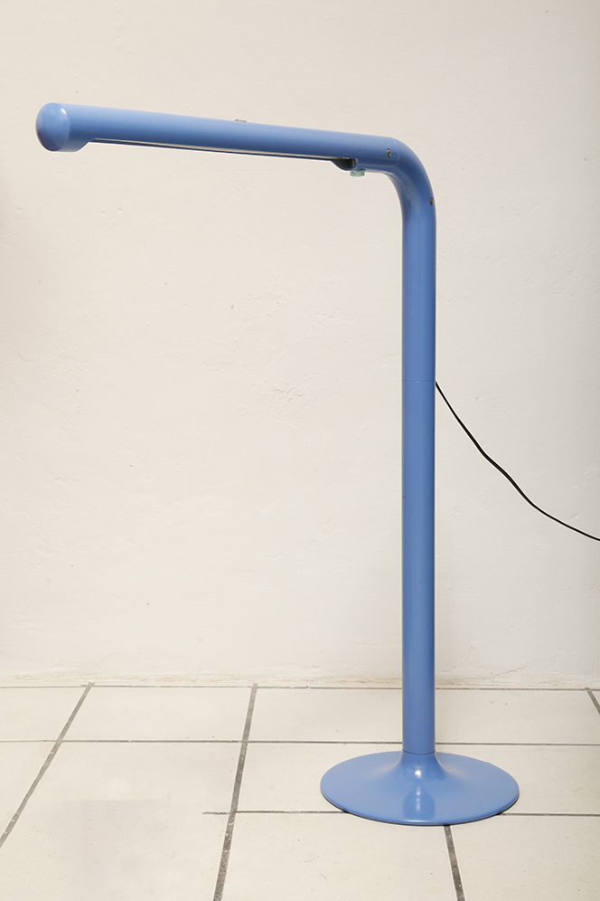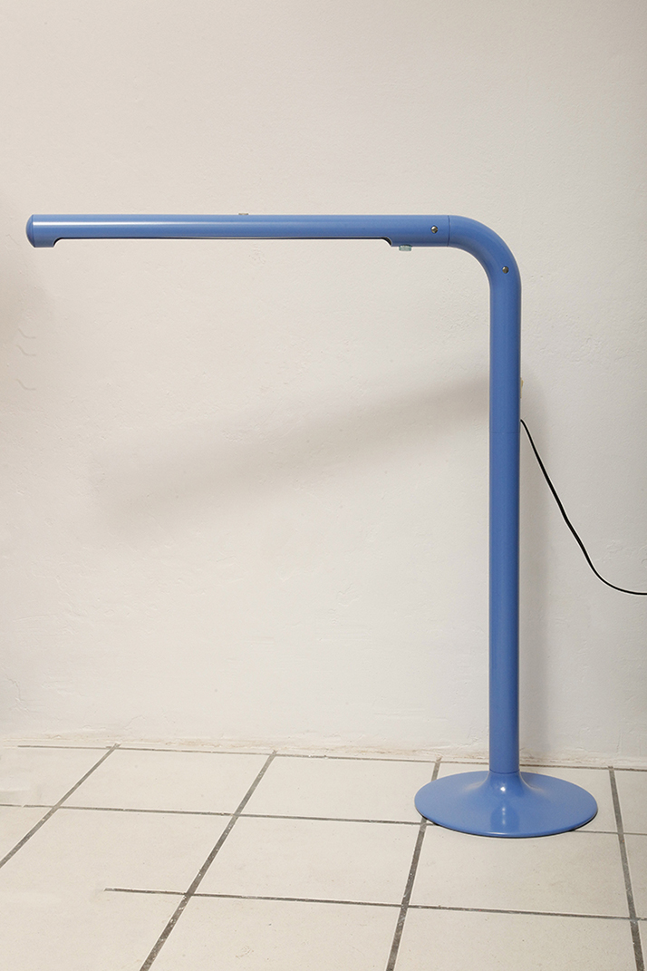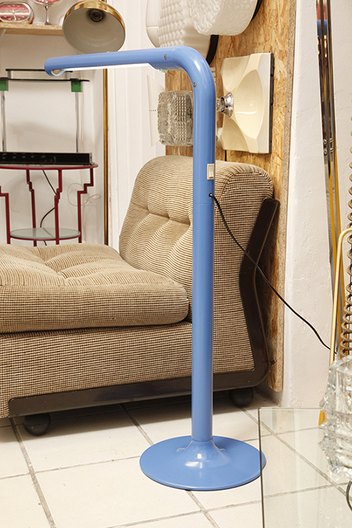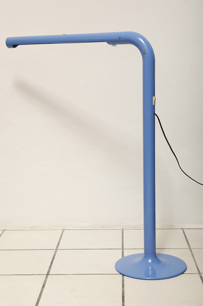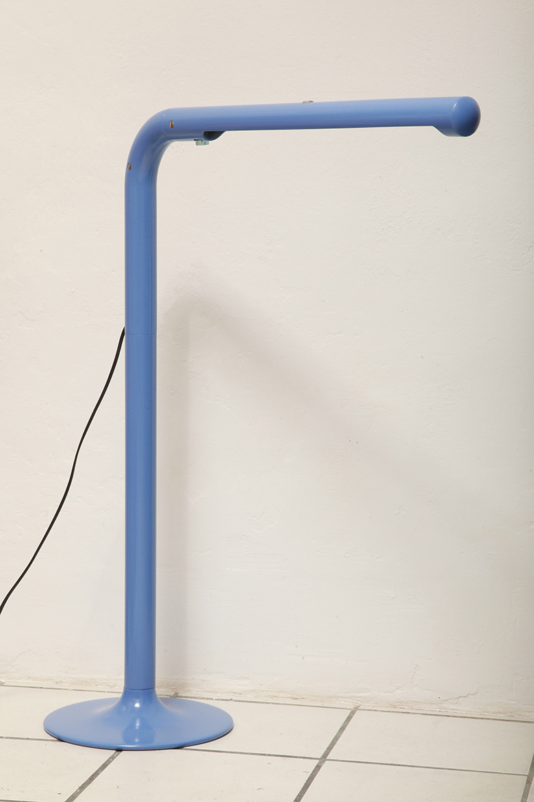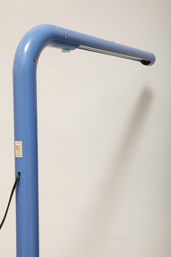 Duża niebieska jednopunktowa lampa biurkowa/podłogowa w kształcie odwróconego „L” z tworzywa sztucznego z metalową okrągłą podstawą „Tube”, projekt Anders Pehrson dla Ateljé Lyktan, Space Age, Szwecja, wzór z 1973 roku