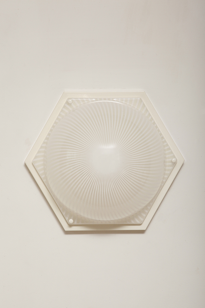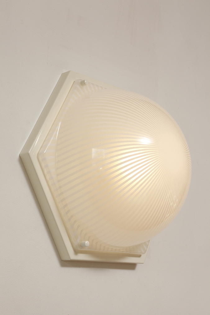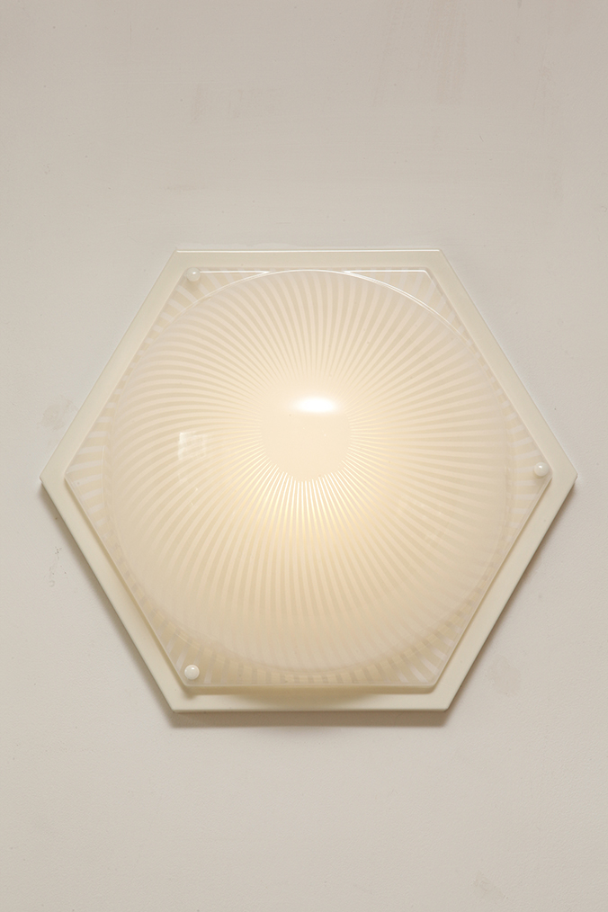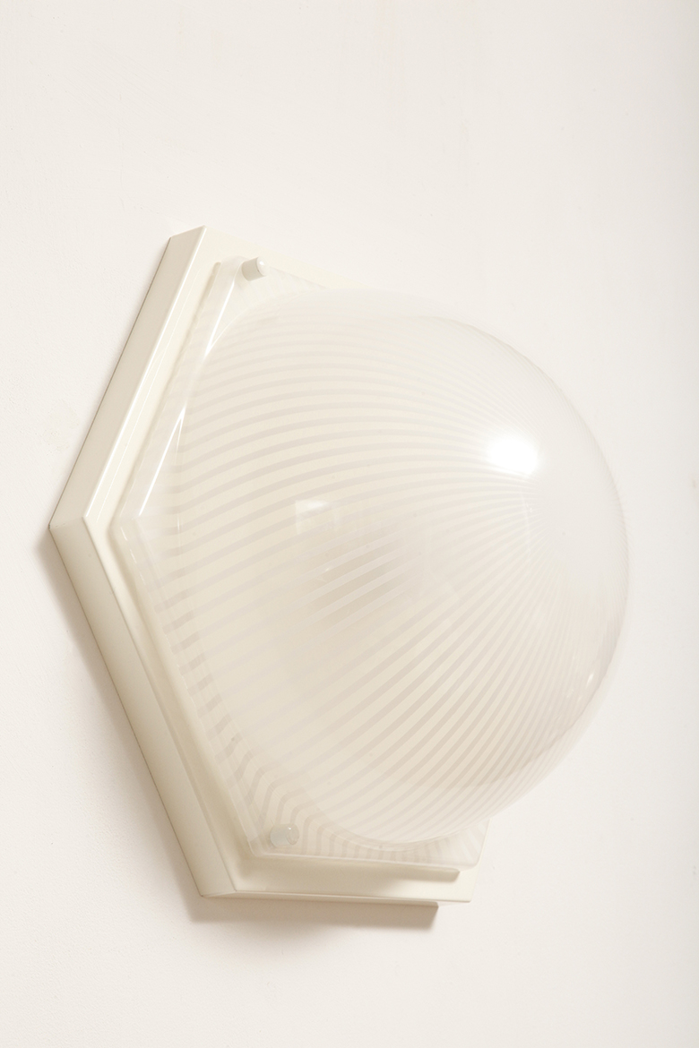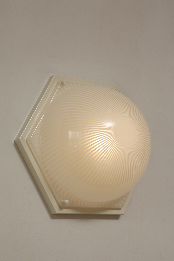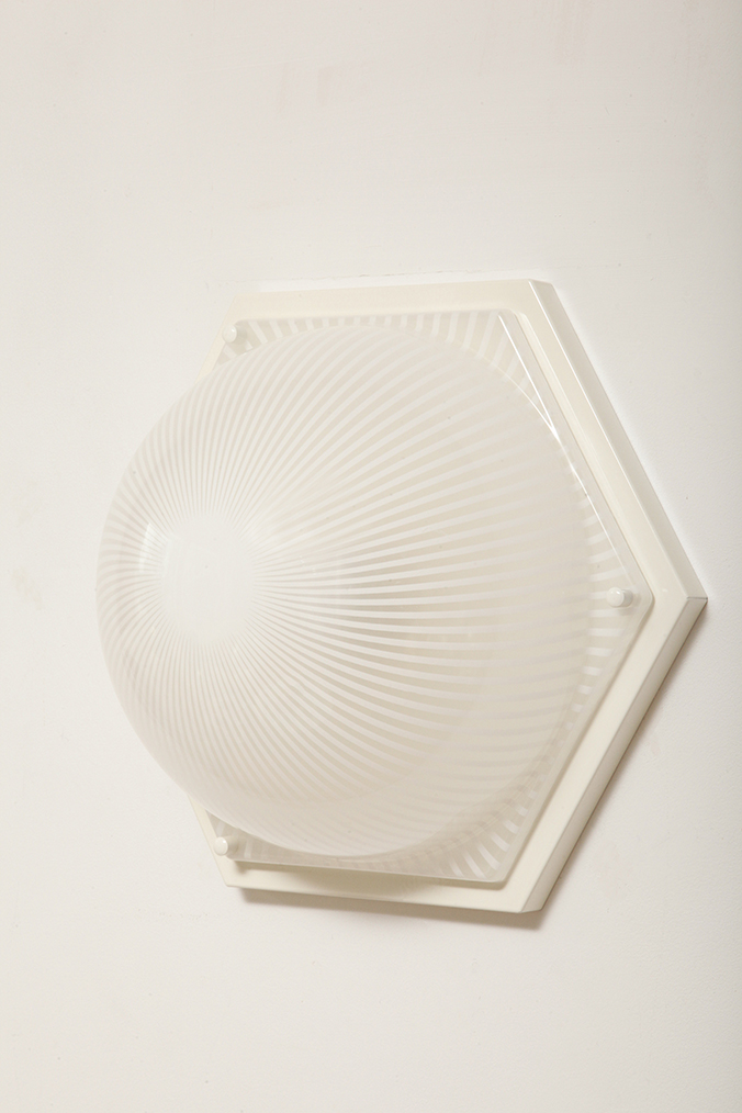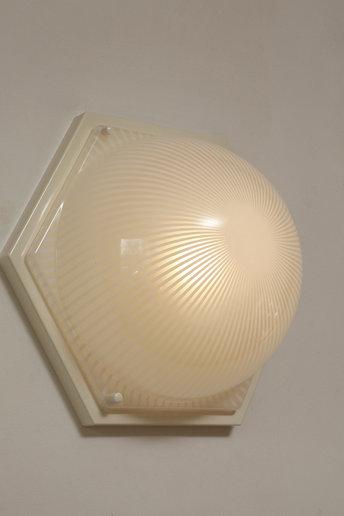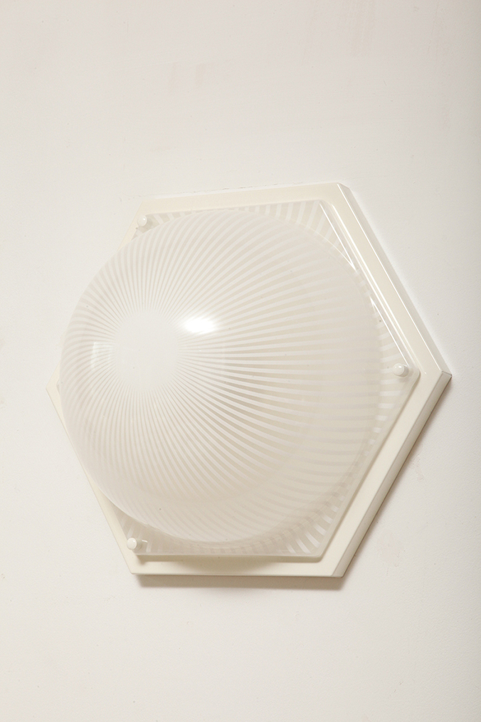 Duża sześcioboczna jednopunktowa mlecznobiała ażurowa lampa ścienna/kinkiet z kloszem z tworzywa (akryl) w kształcie kopuły, Włochy, lata 80.