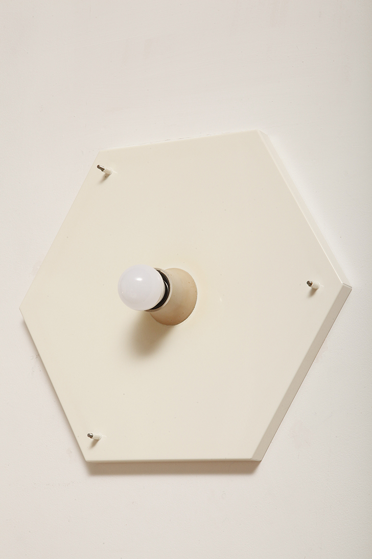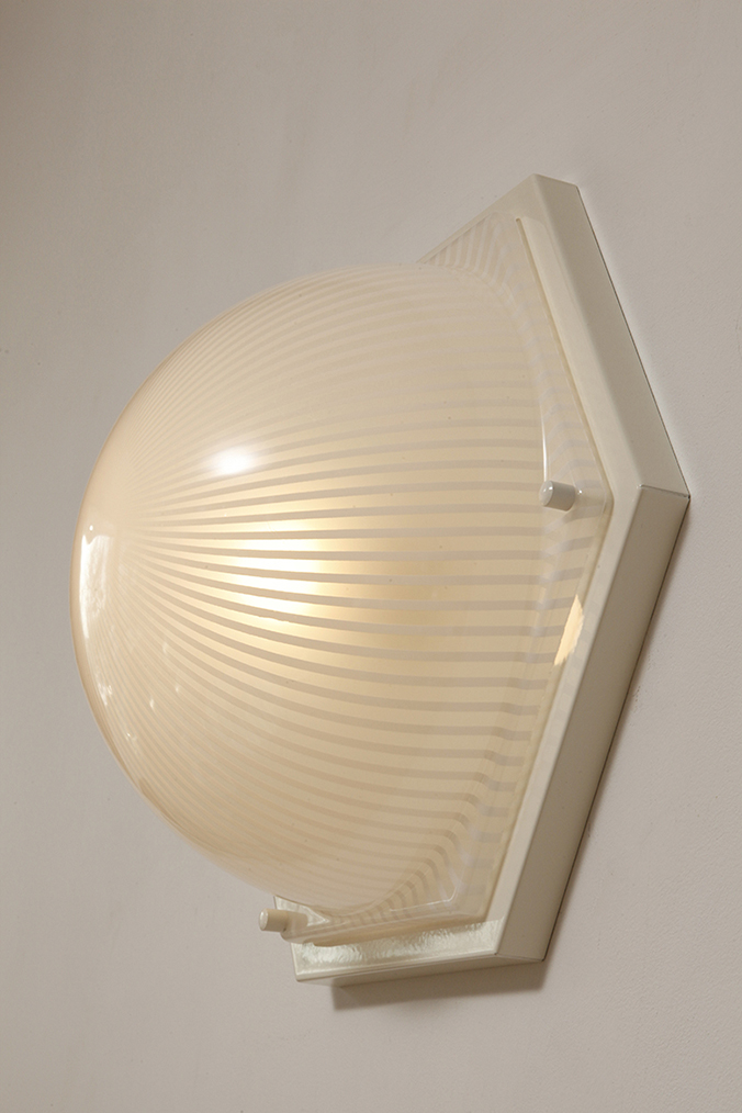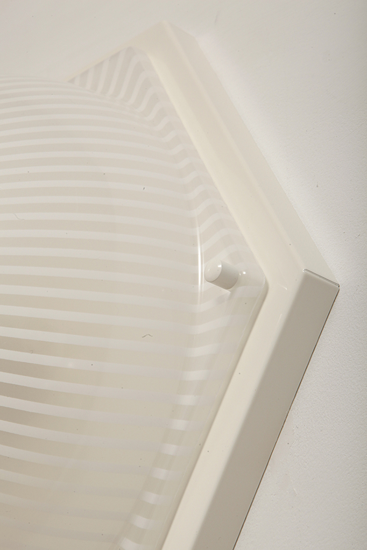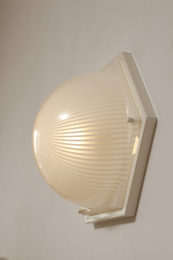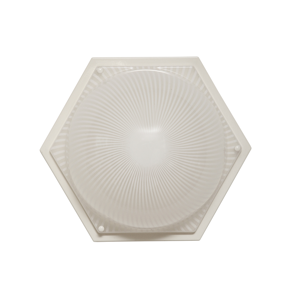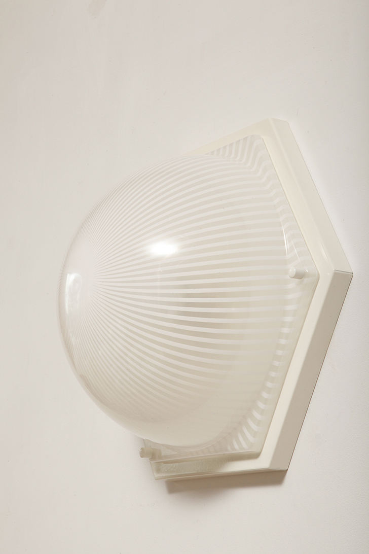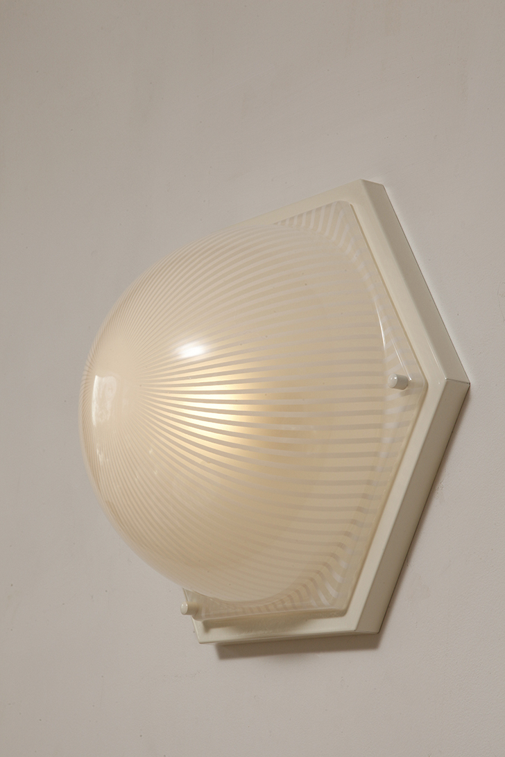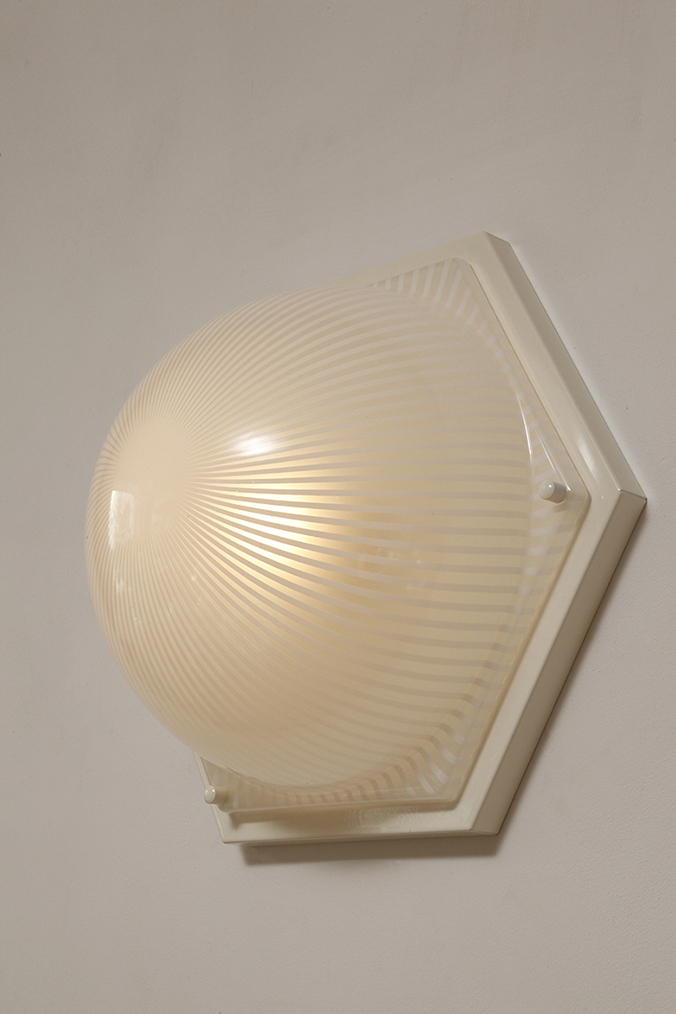 Duża sześcioboczna jednopunktowa mlecznobiała ażurowa lampa ścienna/kinkiet z kloszem z tworzywa (akryl) w kształcie kopuły, Włochy, lata 80.