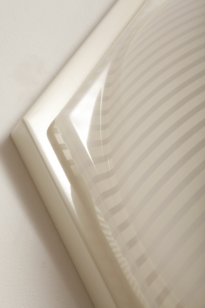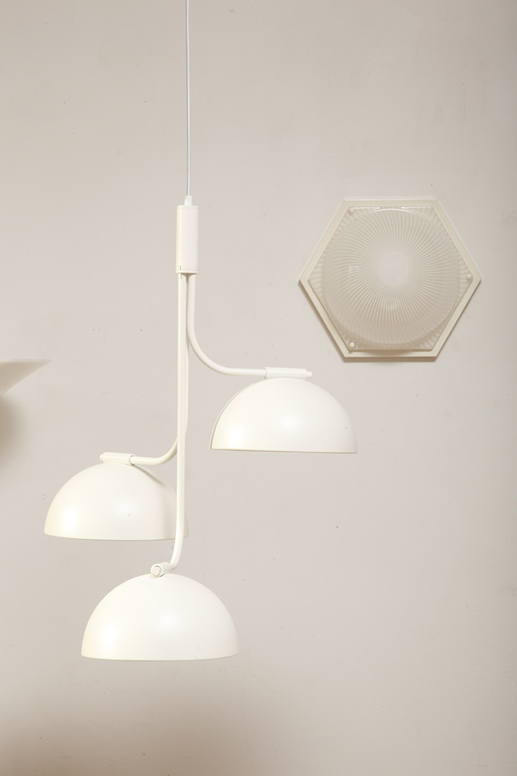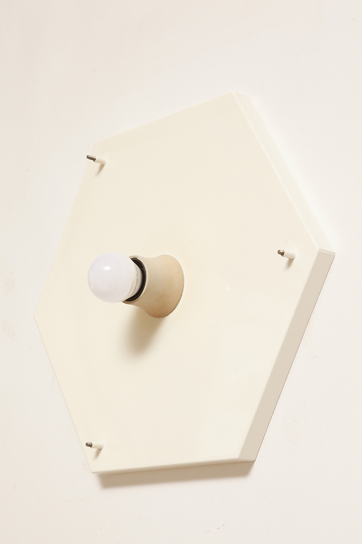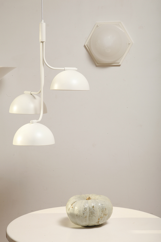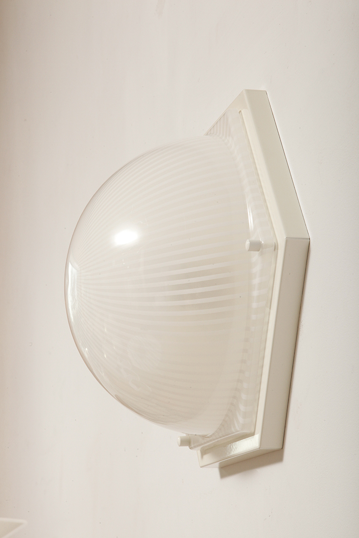 Zachowana w bardzo dobrym stanie, tak elementy metalowe (białe plecy) jak i plastikowe, czyli mlecznobiały klosz na przemian z liniami białymi o przeźroczystymi, czyli ażurowy