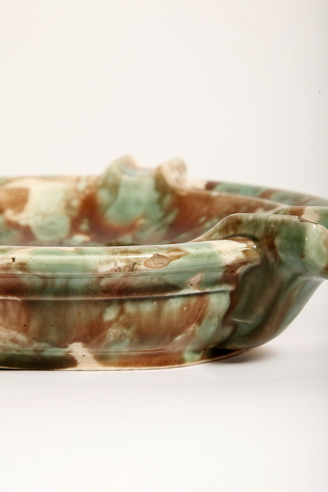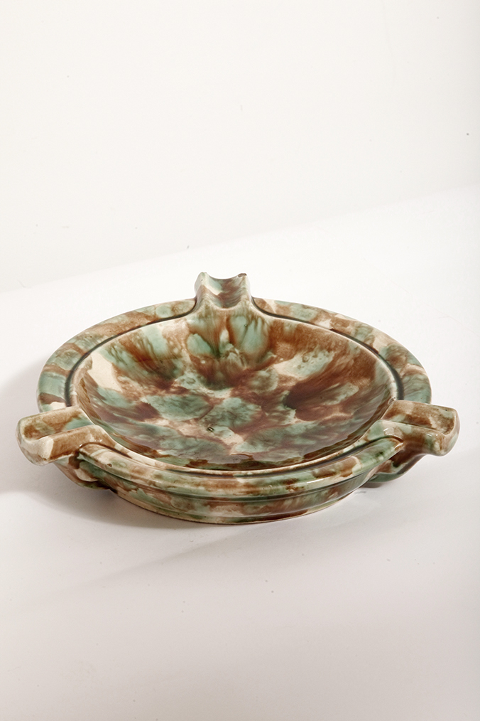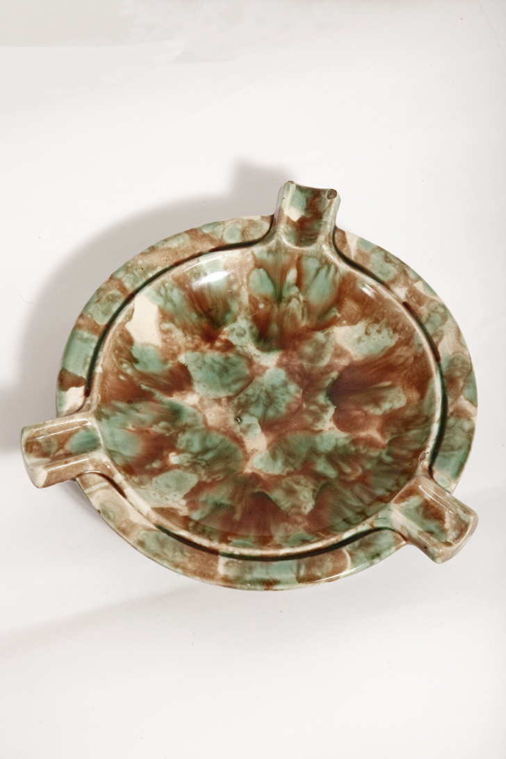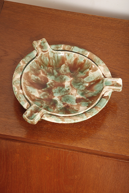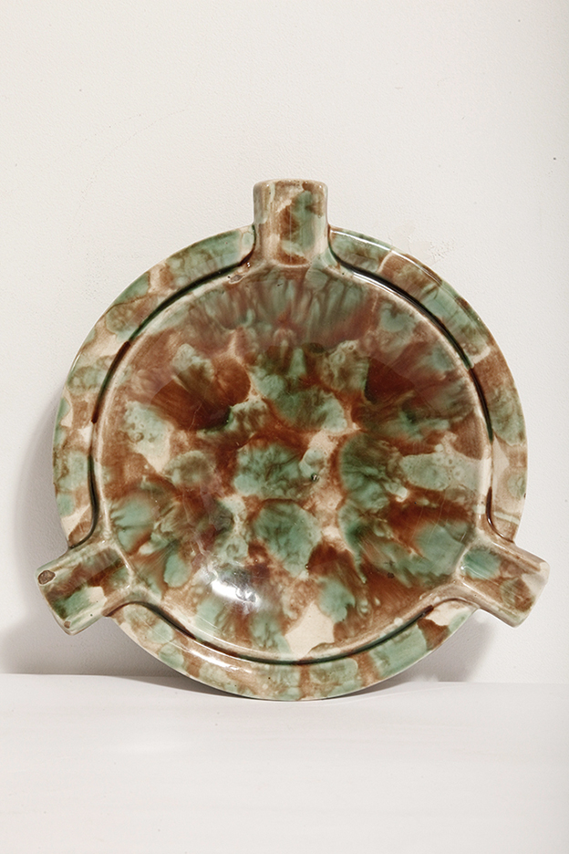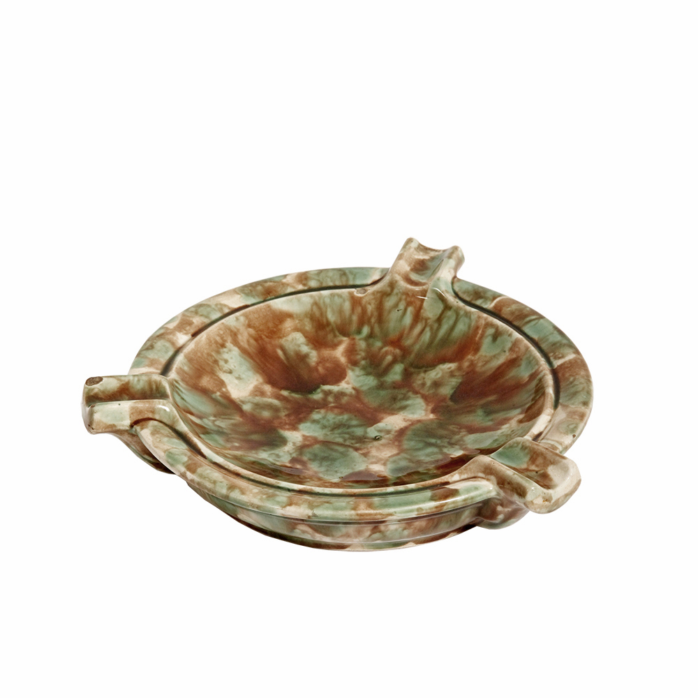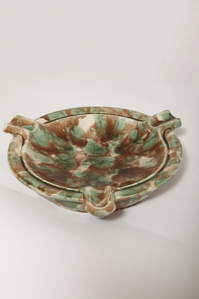 Duża zielono-brązowa fajansowa okrągła popielnica, Polskie Zjednoczone Fabryki Fajansu „Włocławek” we Włocławku, Polska, lata 1945-1955