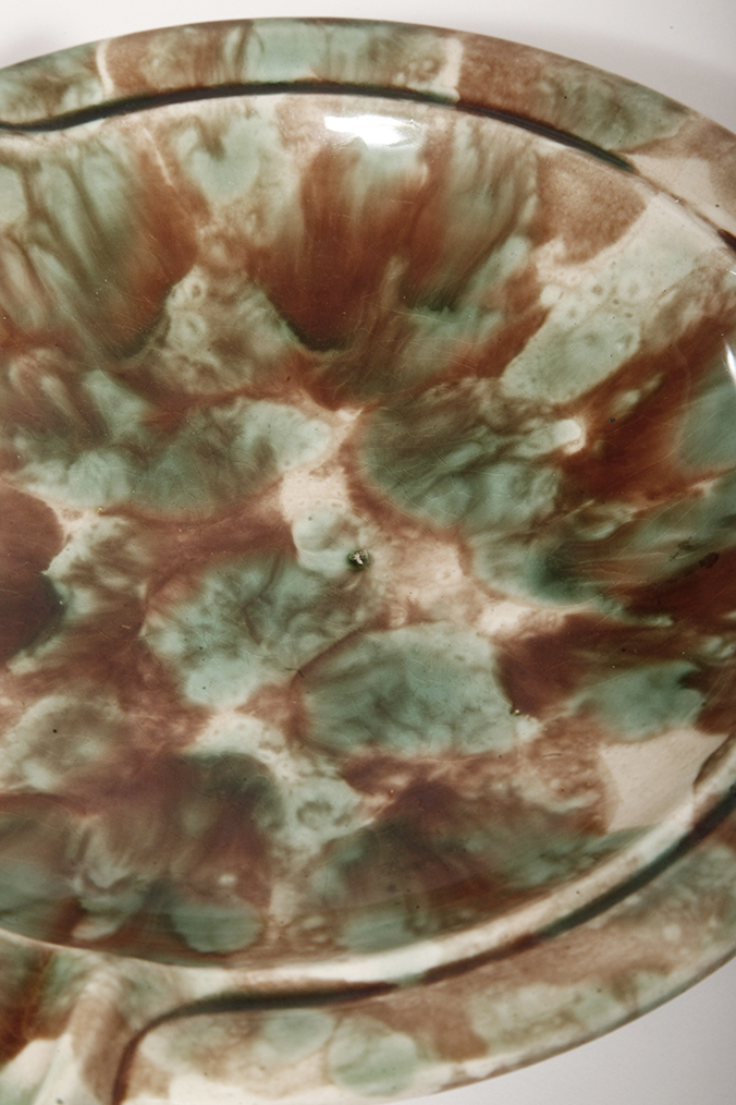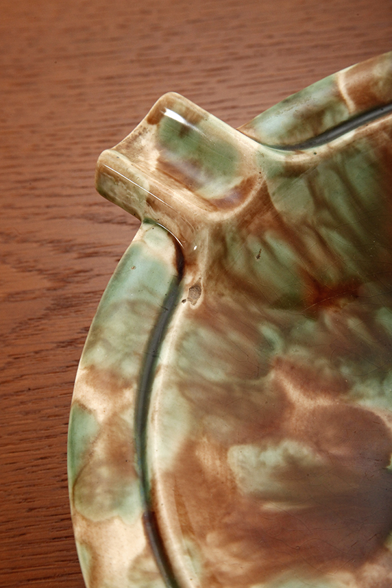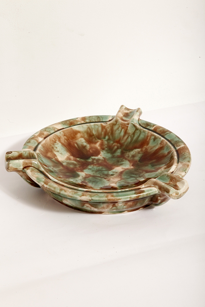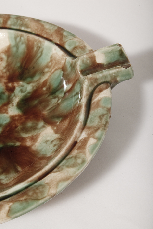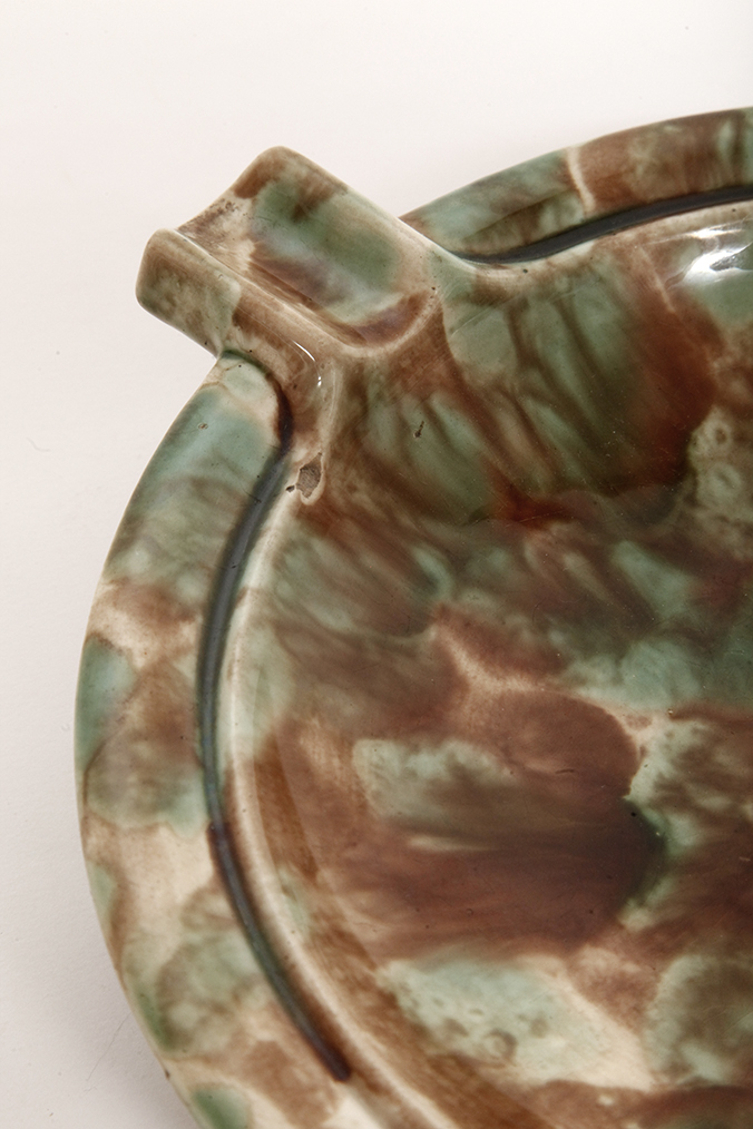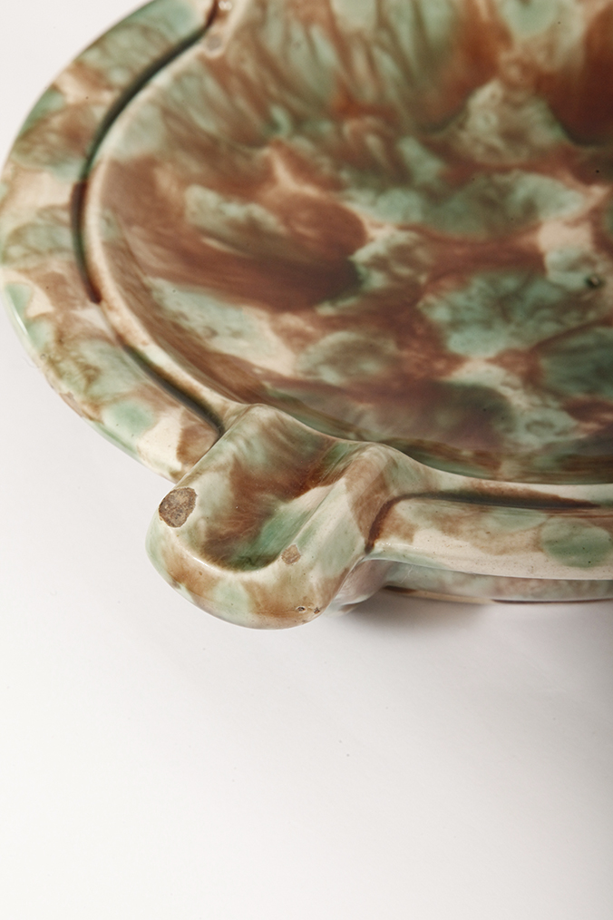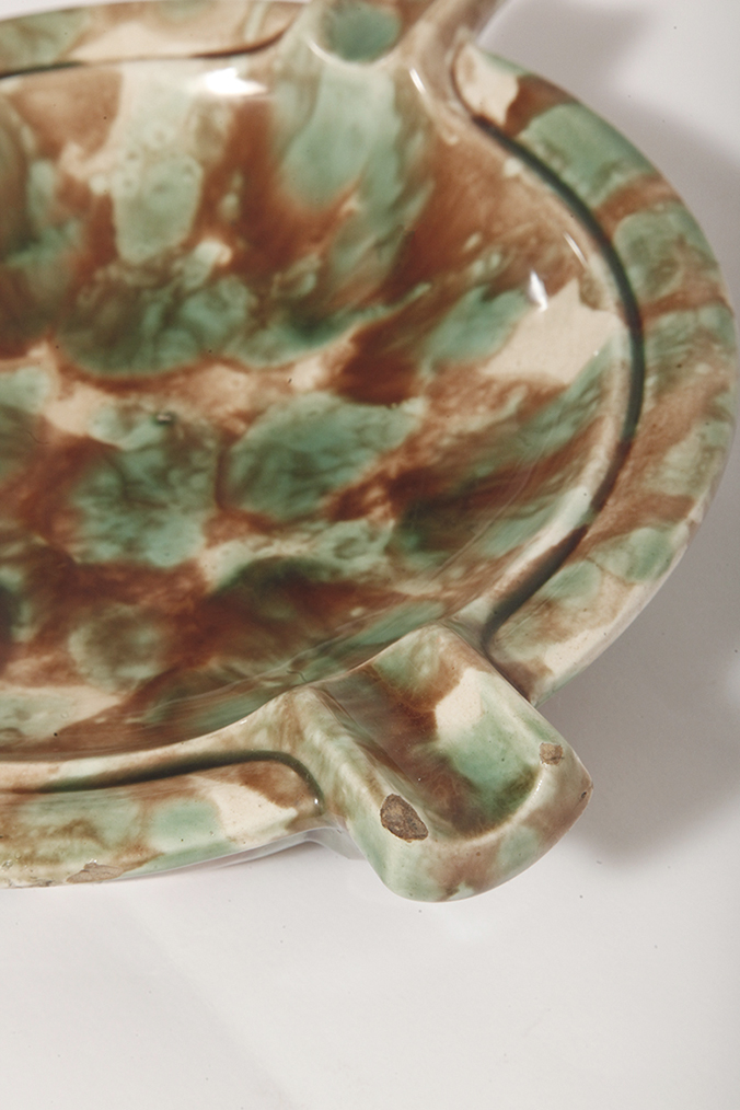 Duża zielono-brązowa fajansowa okrągła popielnica, Polskie Zjednoczone Fabryki Fajansu „Włocławek” we Włocławku, Polska, lata 1945-1955