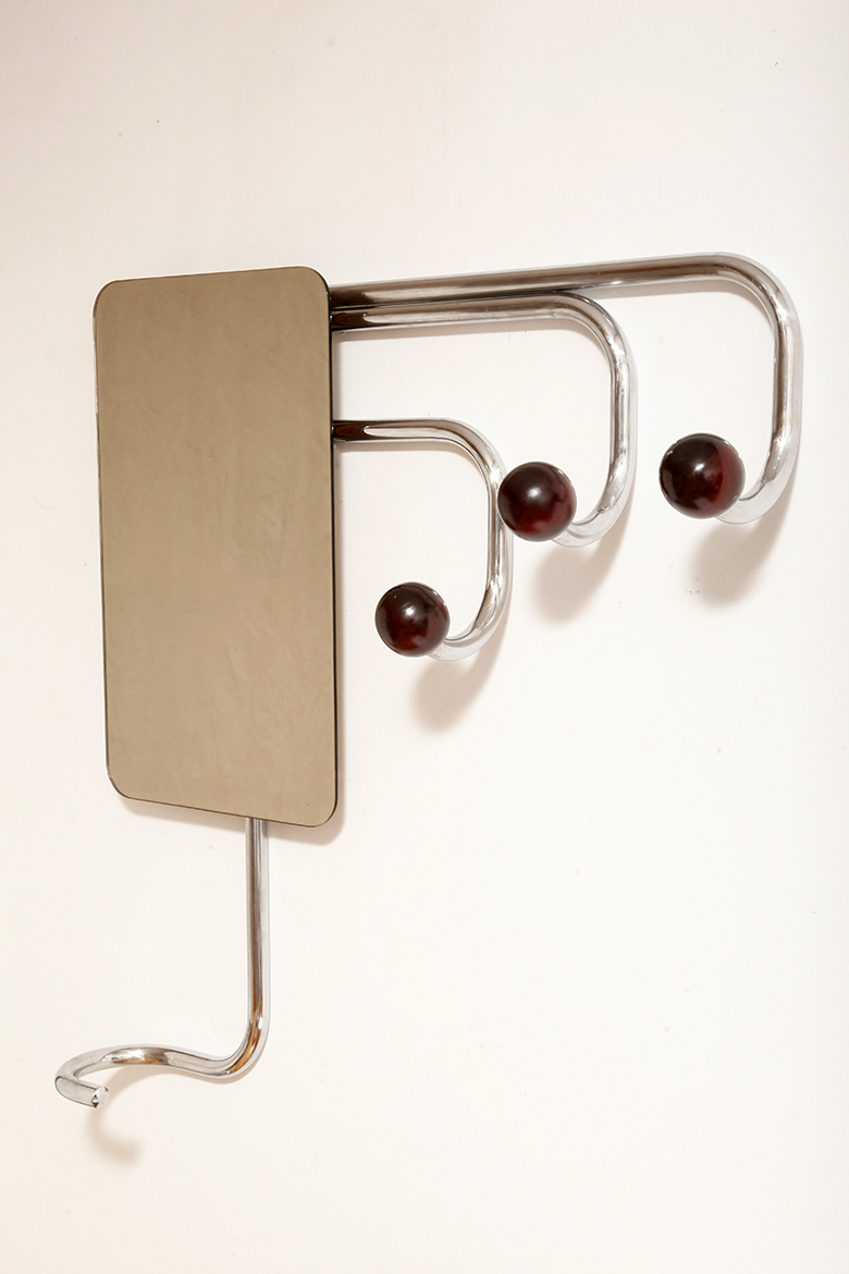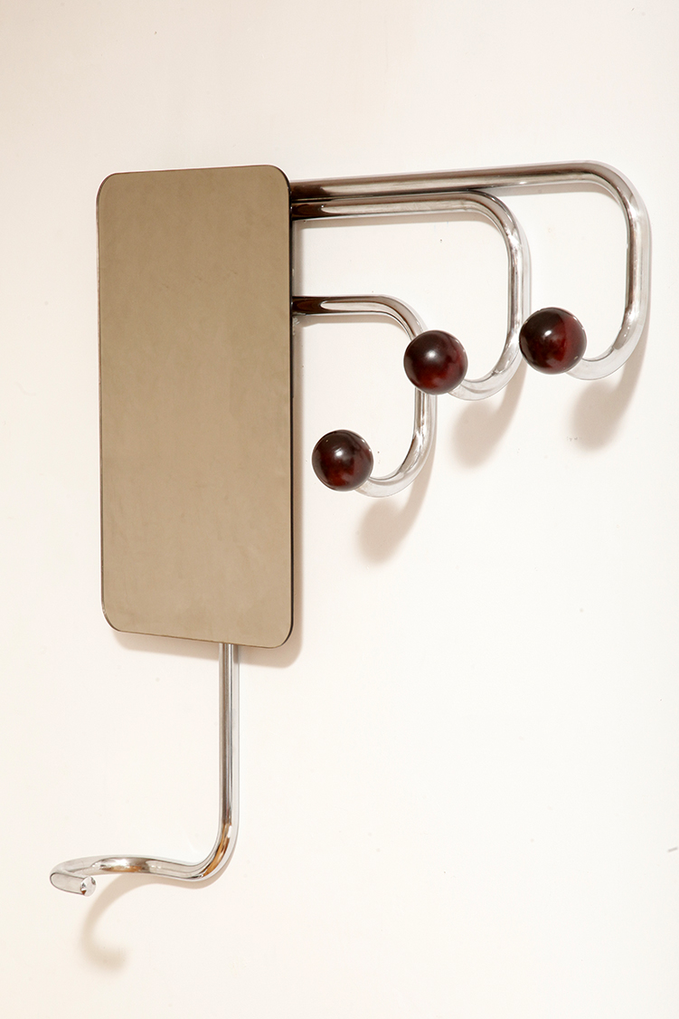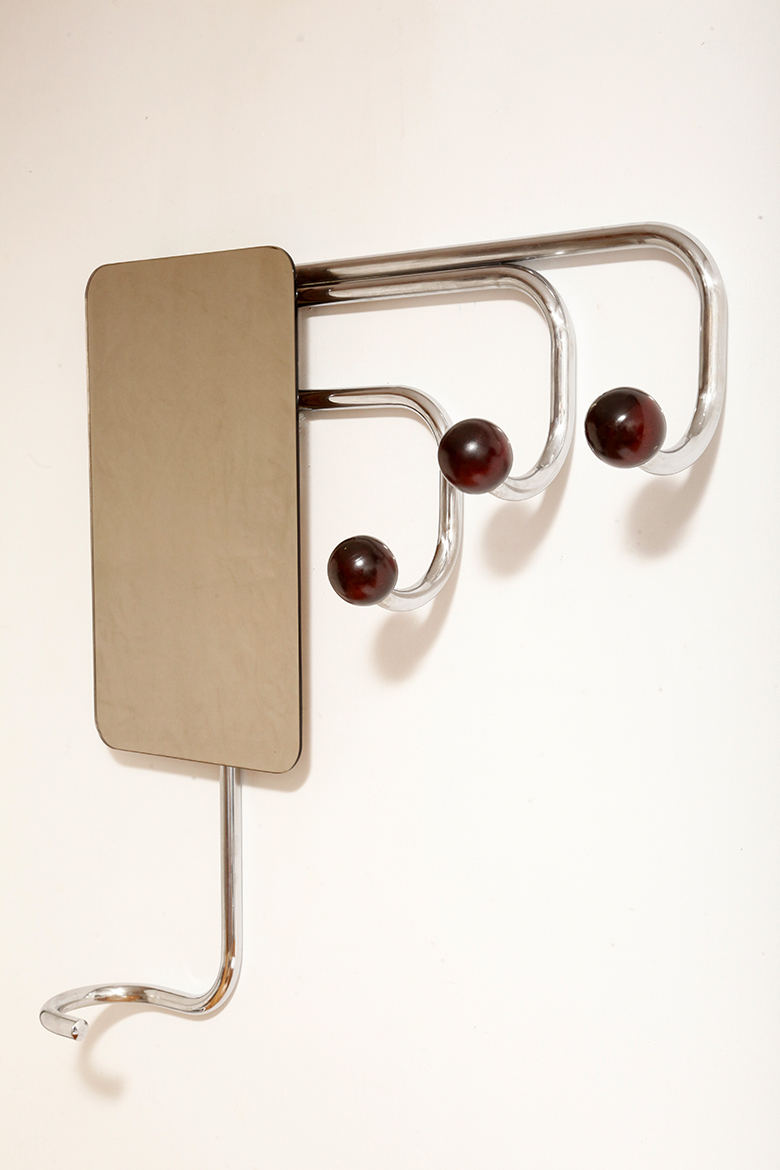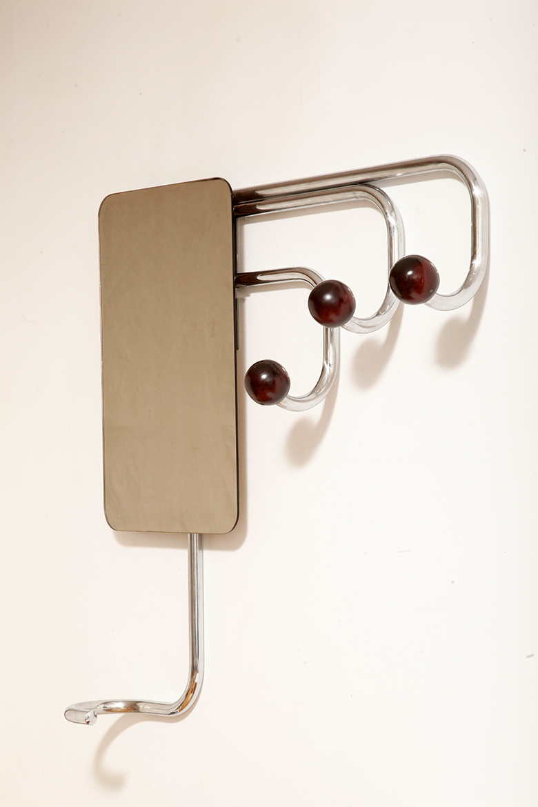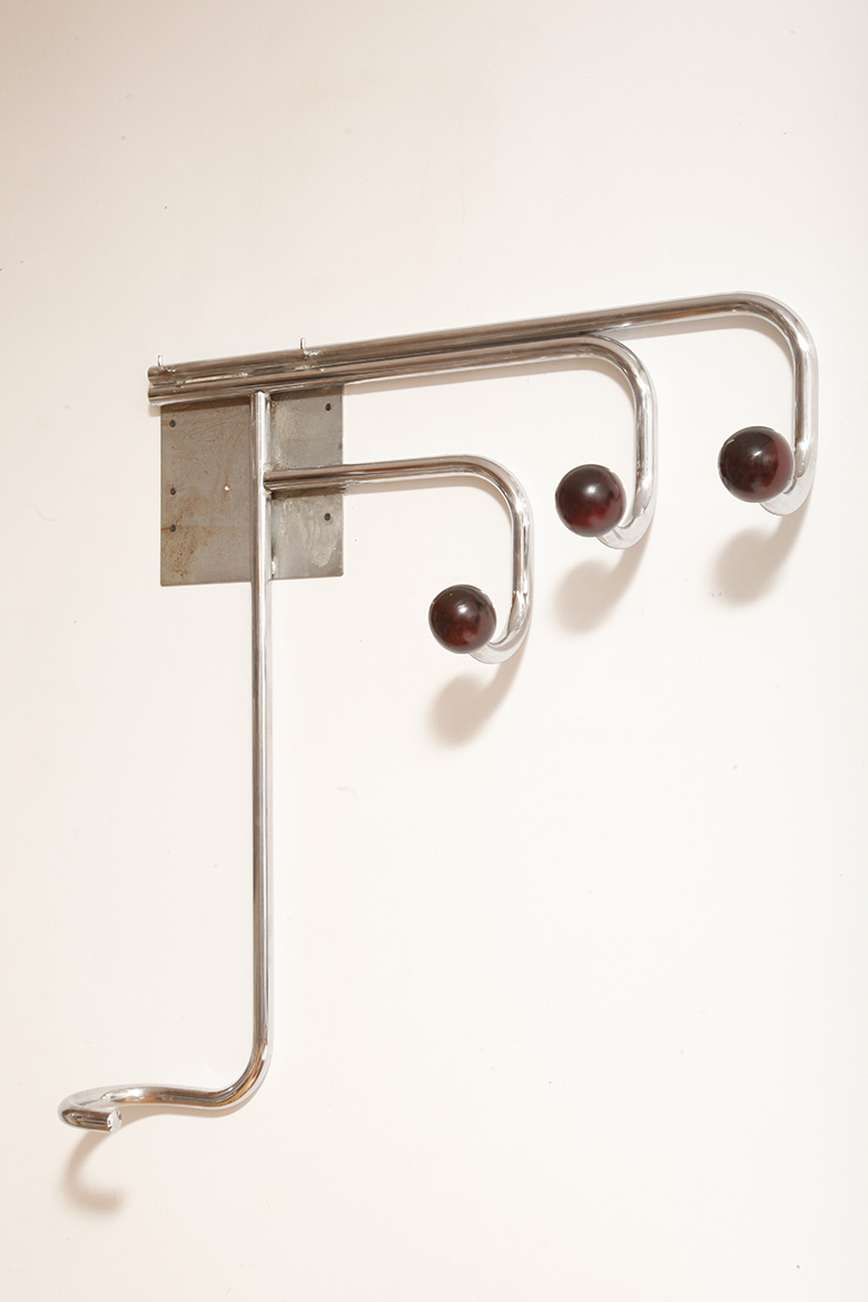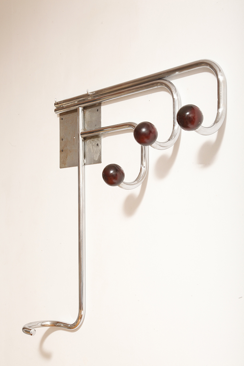 Wieszak z lat 30. XX wieku w stylu Bauhaus przeznaczony do wieszania płaszczy, kapeluszy i innych takich tam wierzchnich okryć zarówno letnich jak i zimowych (mogą być bardzo ciężkie) zredukowany do najistotniejszych elementów