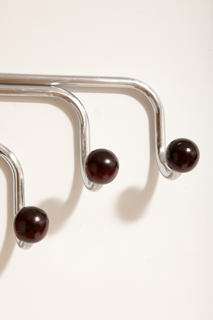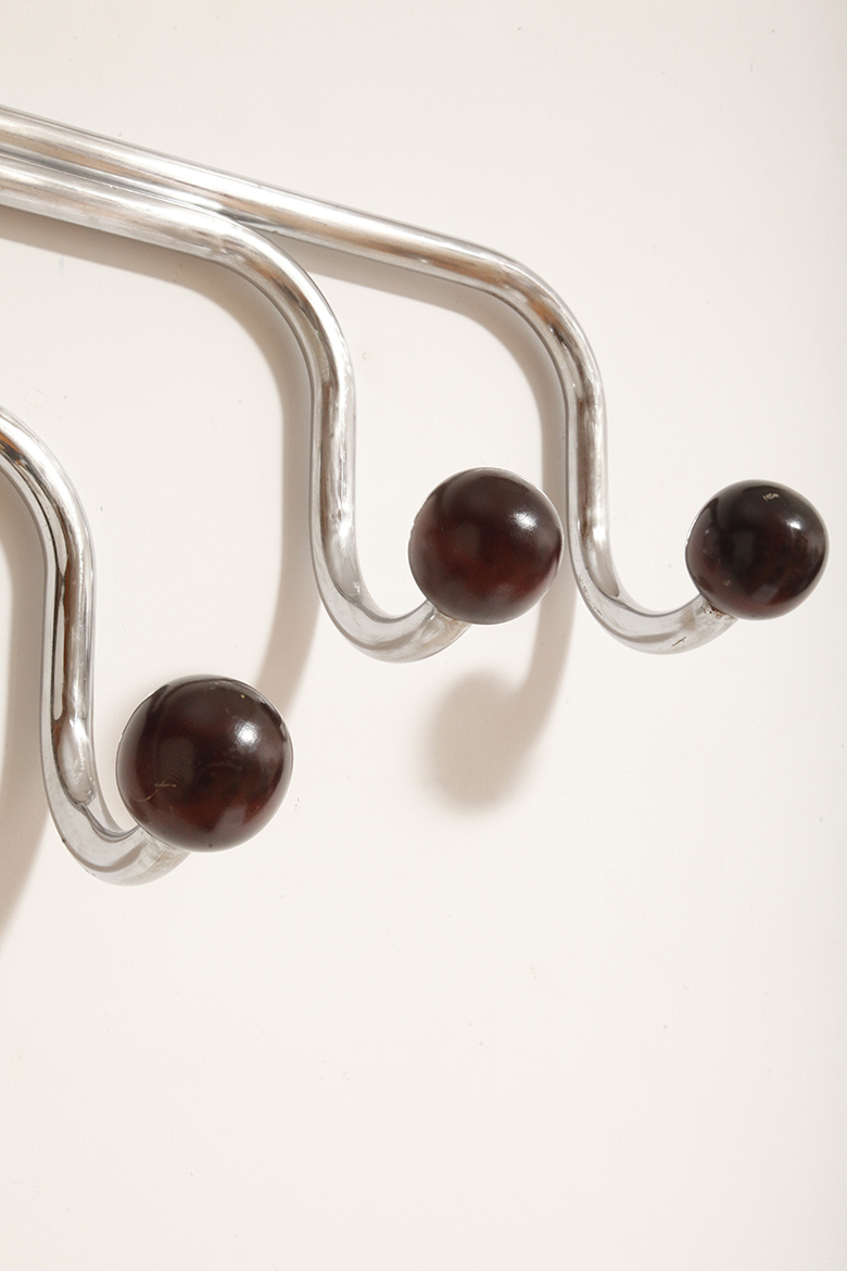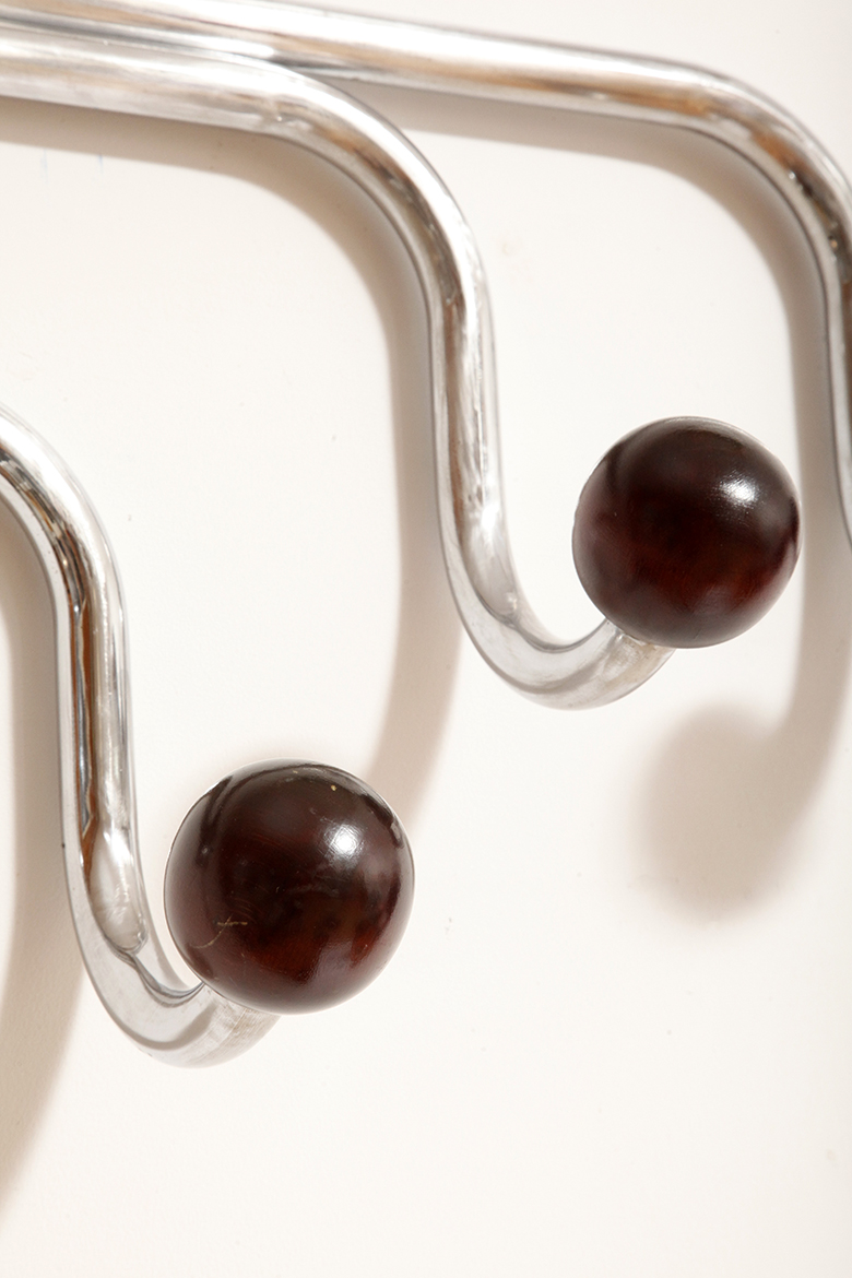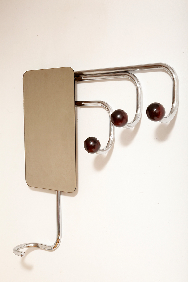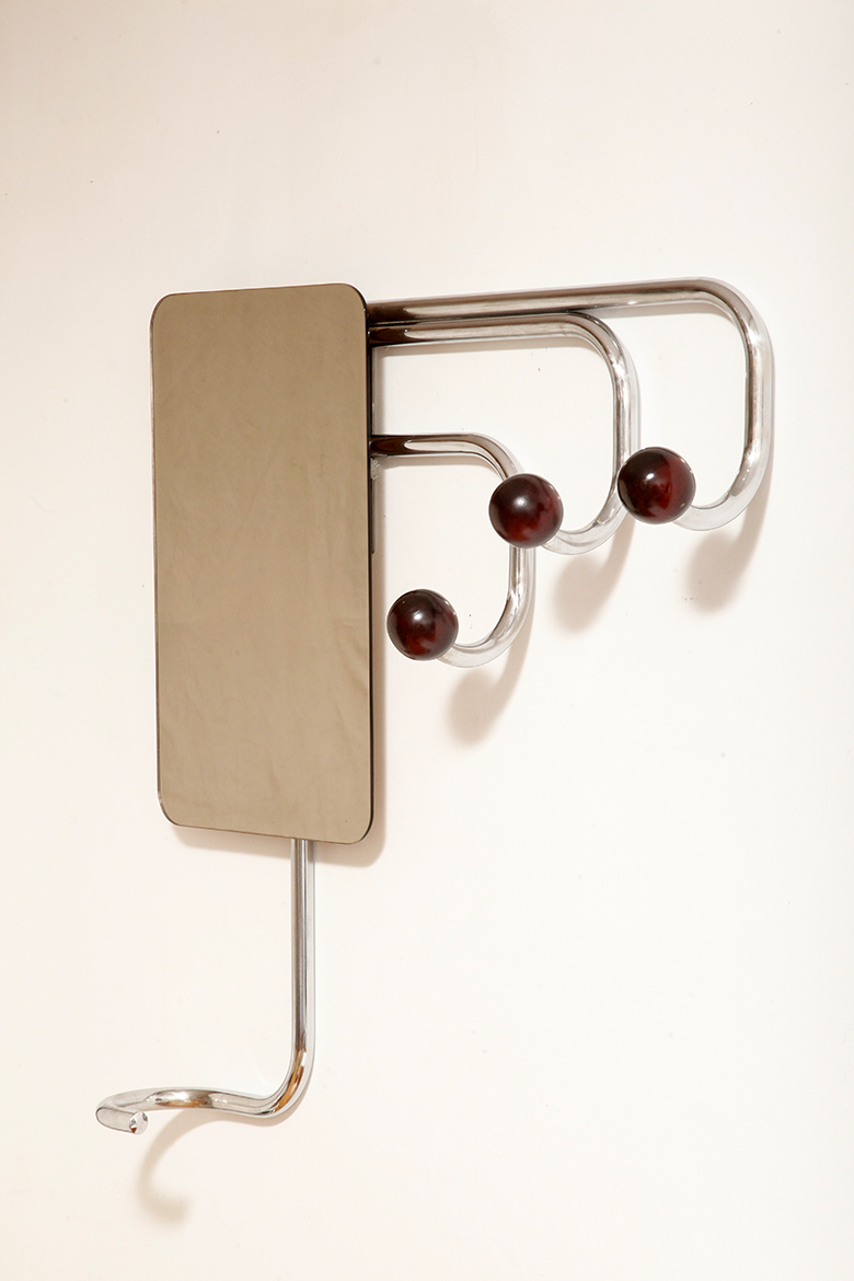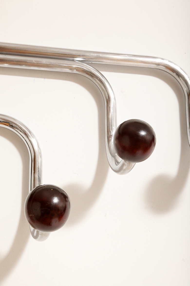 Wieszak z lat 30. XX wieku w stylu Bauhaus przeznaczony do wieszania płaszczy, kapeluszy i innych takich tam wierzchnich okryć zarówno letnich jak i zimowych (mogą być bardzo ciężkie) zredukowany do najistotniejszych elementów