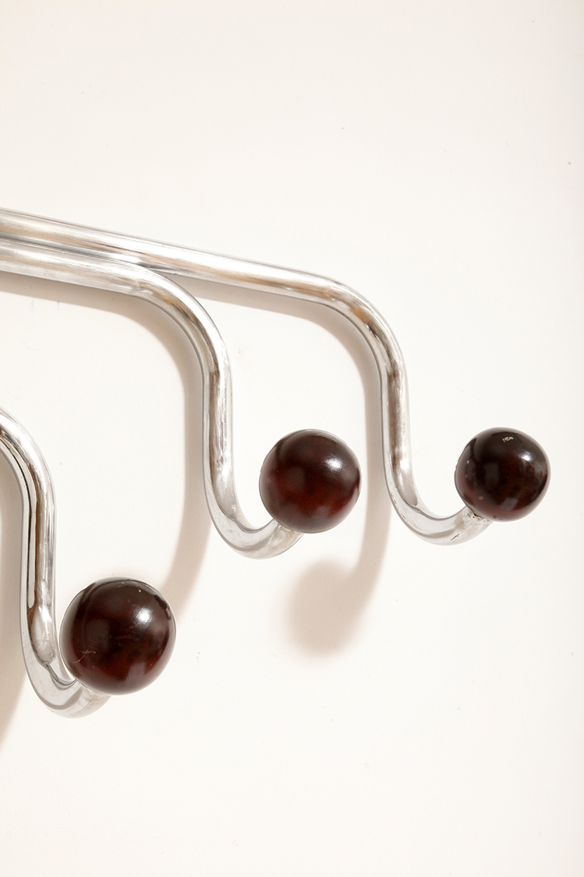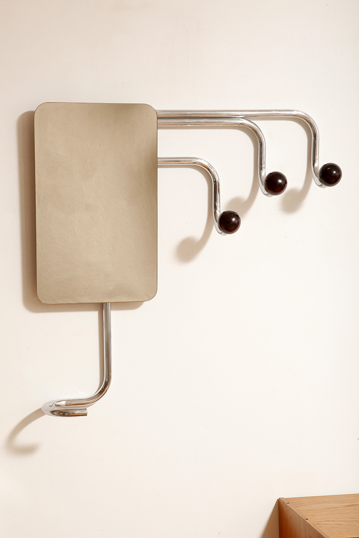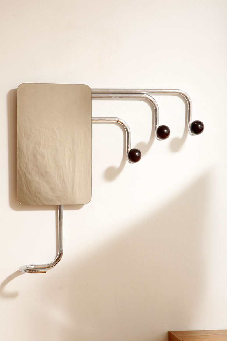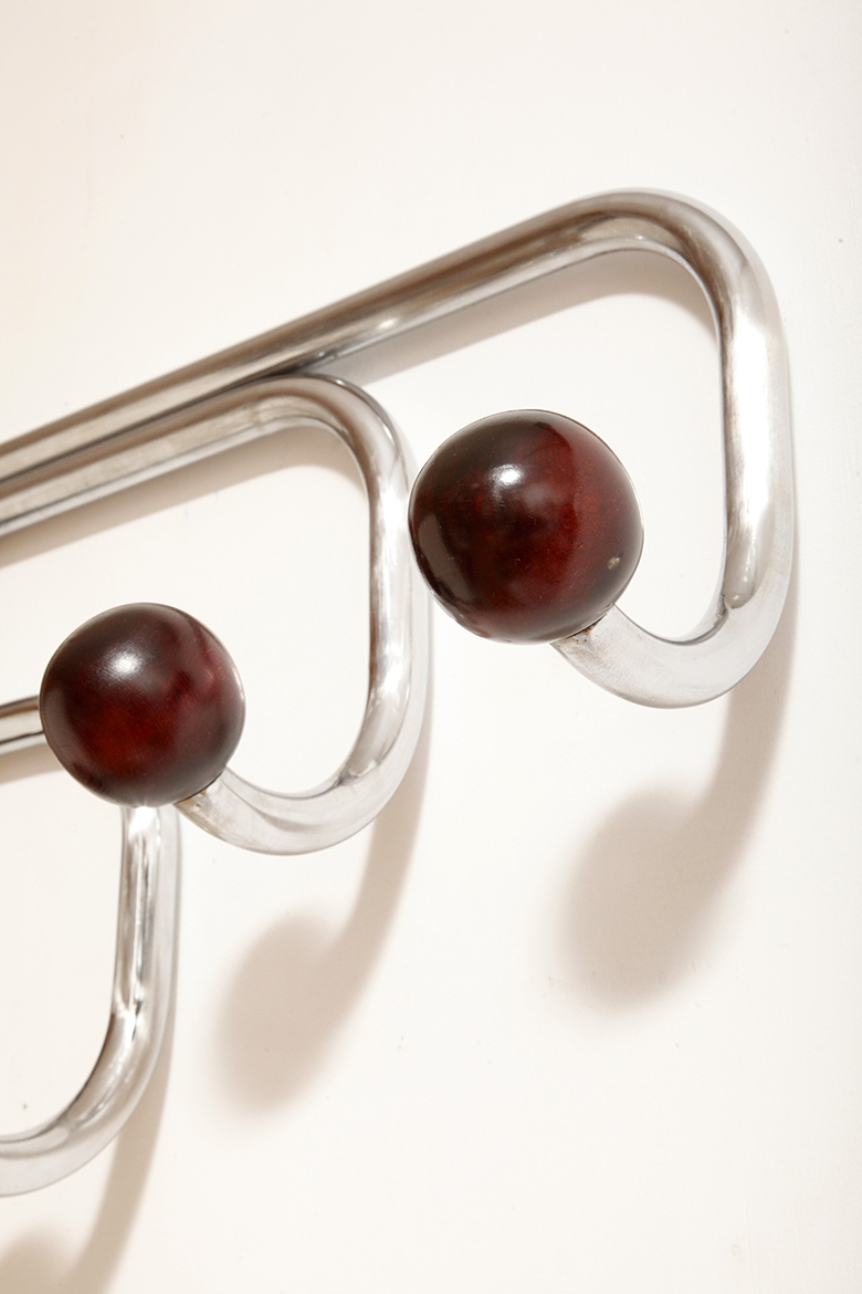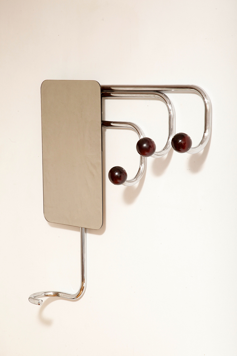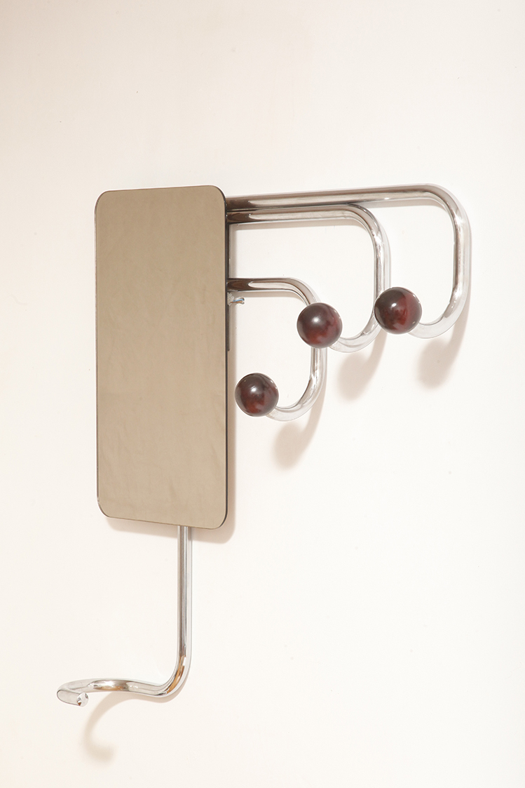 Wieszak z lat 30. XX wieku w stylu Bauhaus przeznaczony do wieszania płaszczy, kapeluszy i innych takich tam wierzchnich okryć zarówno letnich jak i zimowych (mogą być bardzo ciężkie) zredukowany do najistotniejszych elementów