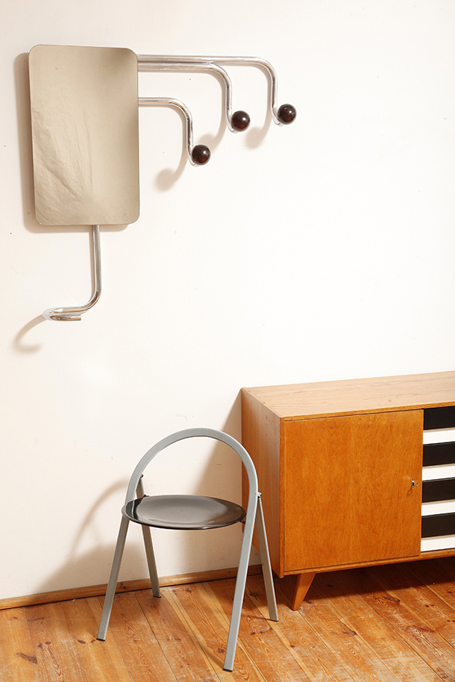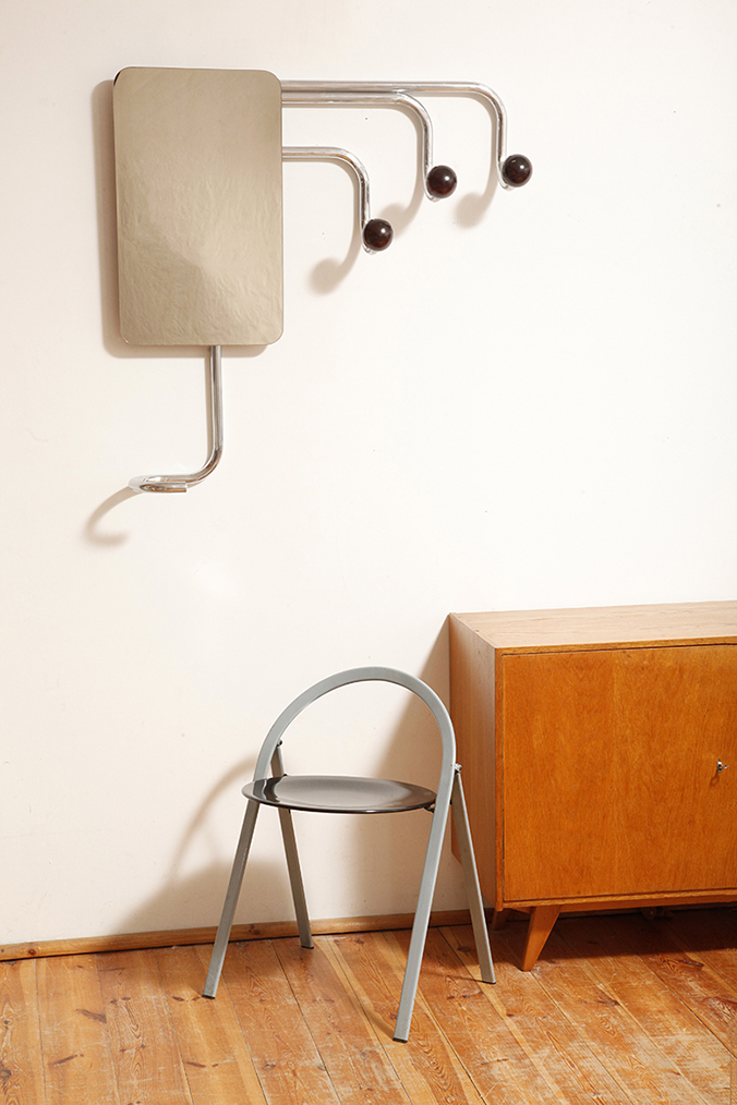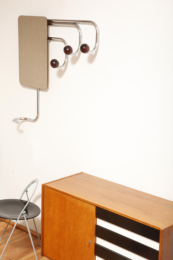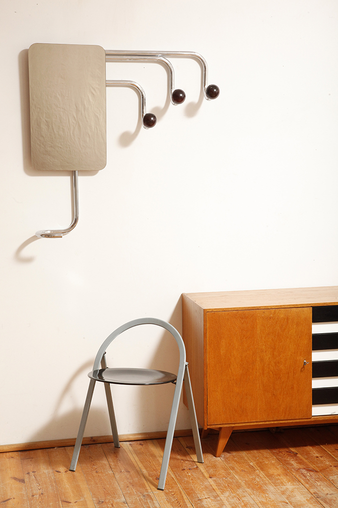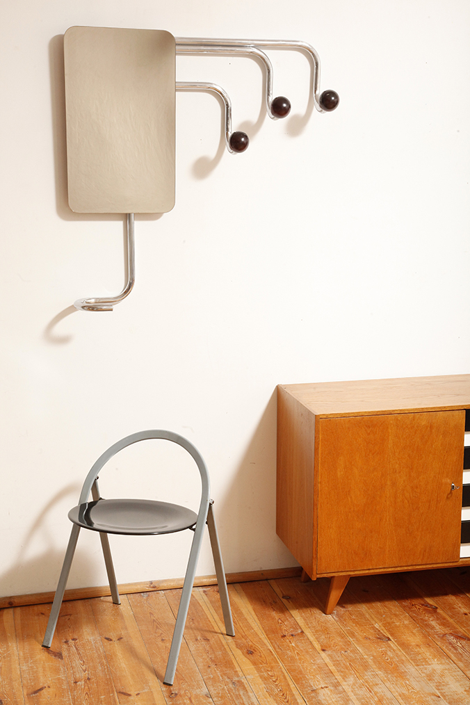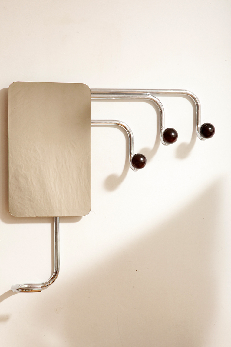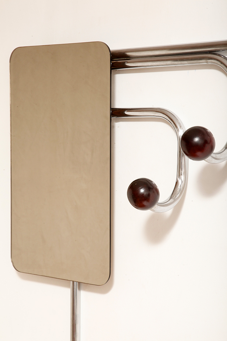 Wieszak z lat 30. XX wieku w stylu Bauhaus przeznaczony do wieszania płaszczy, kapeluszy i innych takich tam wierzchnich okryć zarówno letnich jak i zimowych (mogą być bardzo ciężkie) zredukowany do najistotniejszych elementów