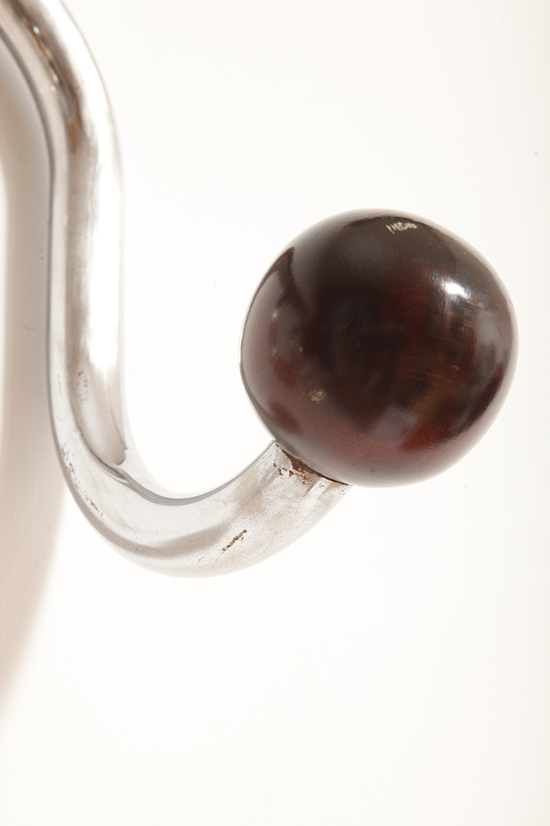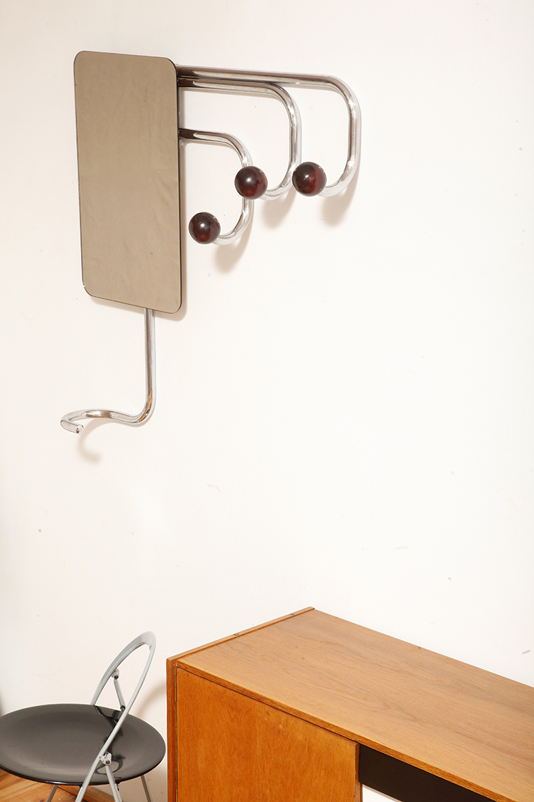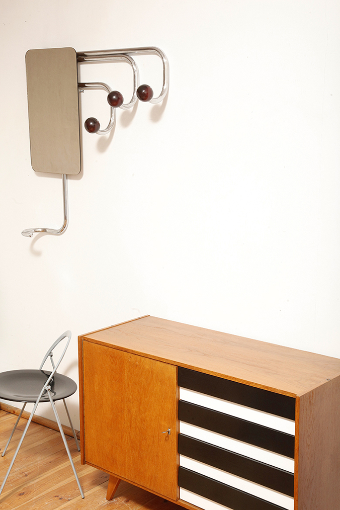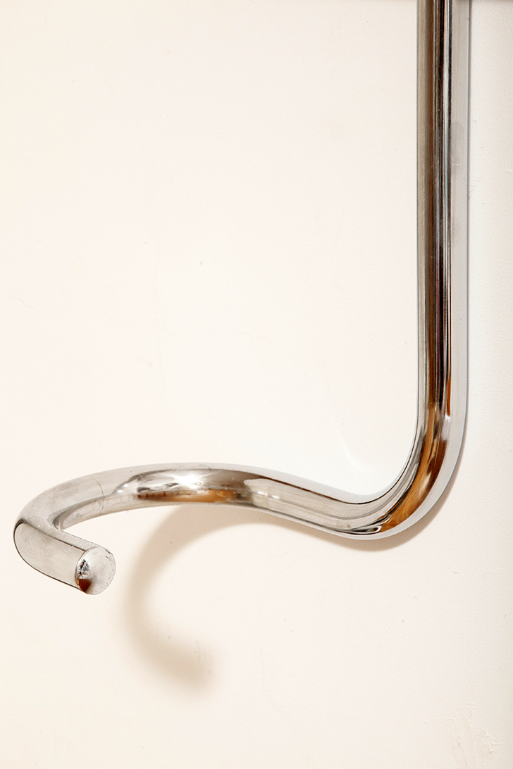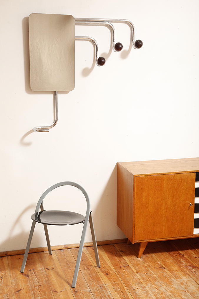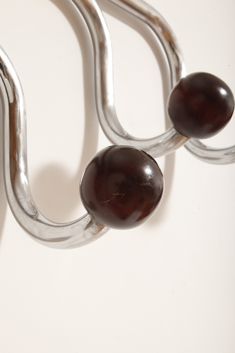 Wieszak z lat 30. XX wieku w stylu Bauhaus przeznaczony do wieszania płaszczy, kapeluszy i innych takich tam wierzchnich okryć zarówno letnich jak i zimowych (mogą być bardzo ciężkie) zredukowany do najistotniejszych elementów