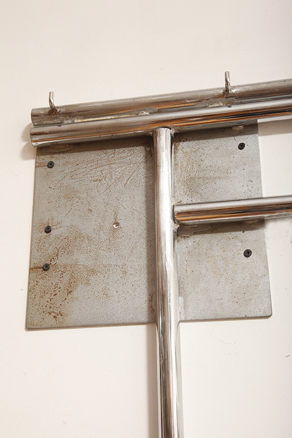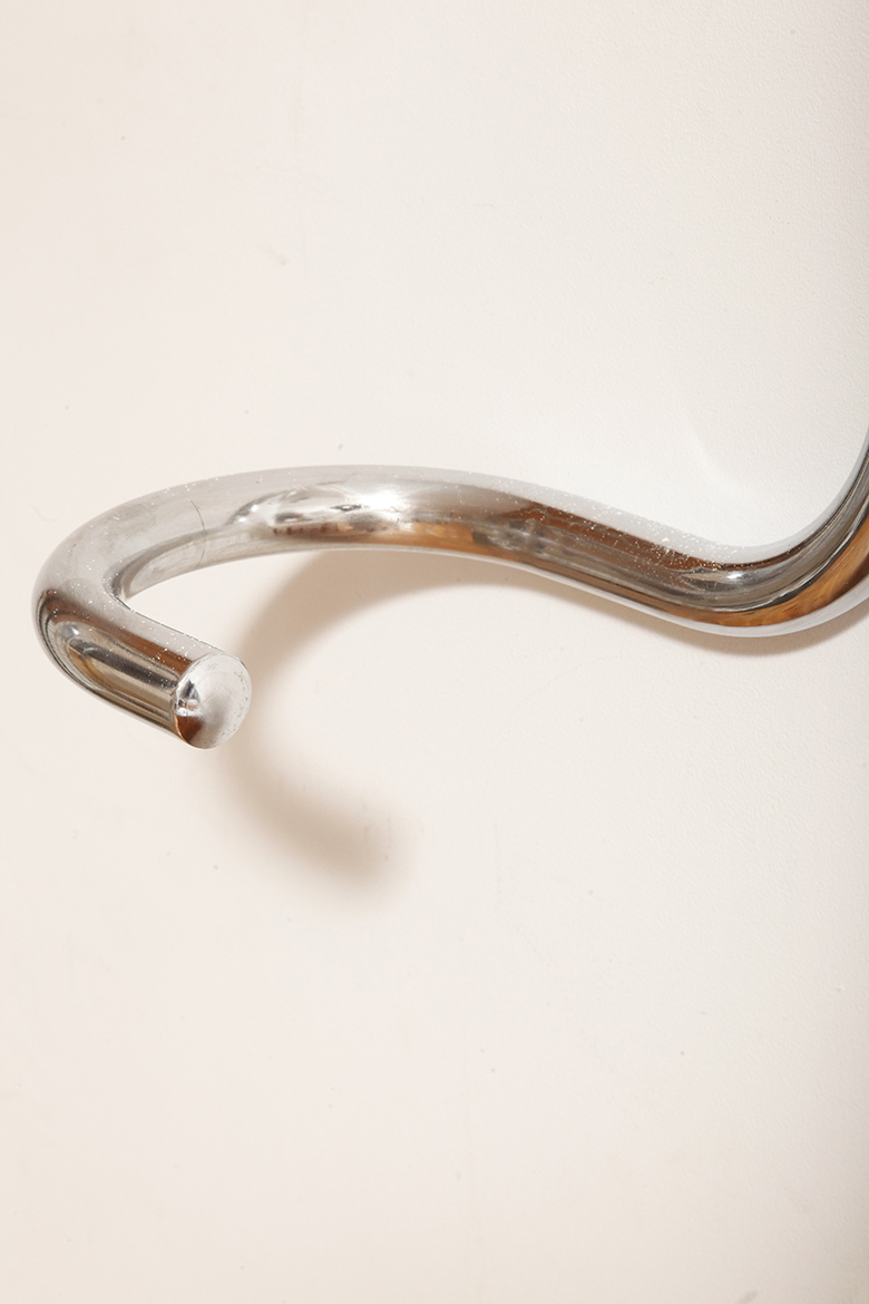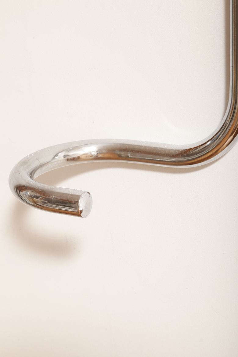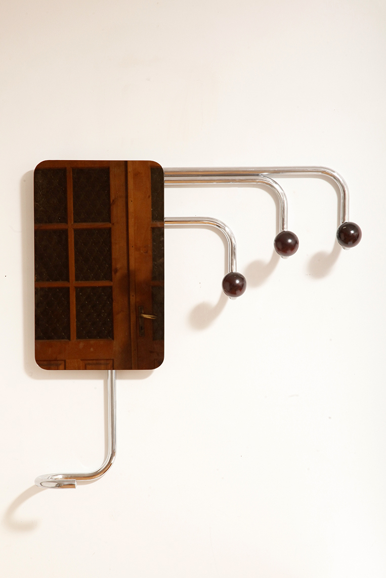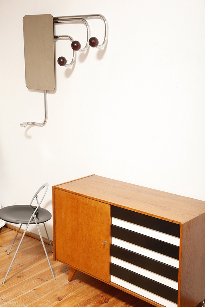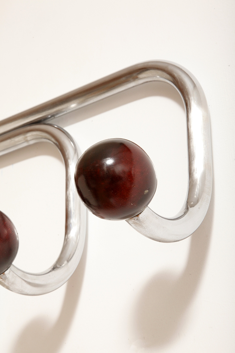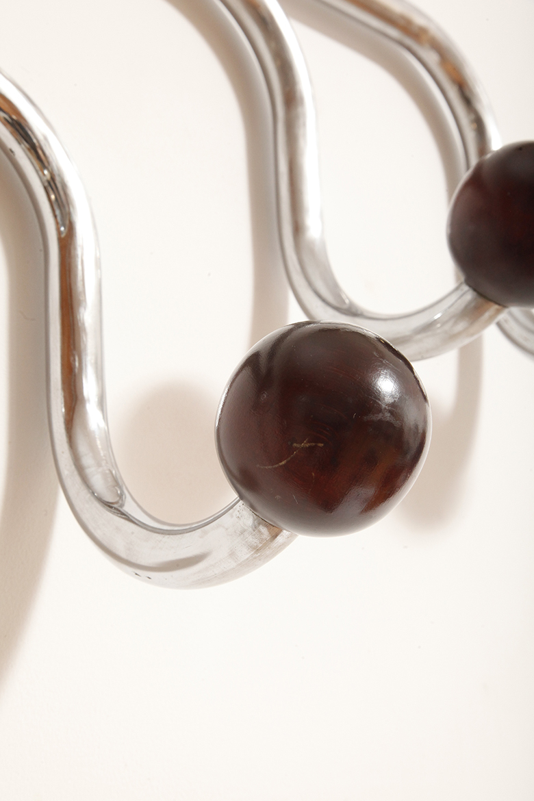 Wieszak z lat 30. XX wieku w stylu Bauhaus przeznaczony do wieszania płaszczy, kapeluszy i innych takich tam wierzchnich okryć zarówno letnich jak i zimowych (mogą być bardzo ciężkie) zredukowany do najistotniejszych elementów