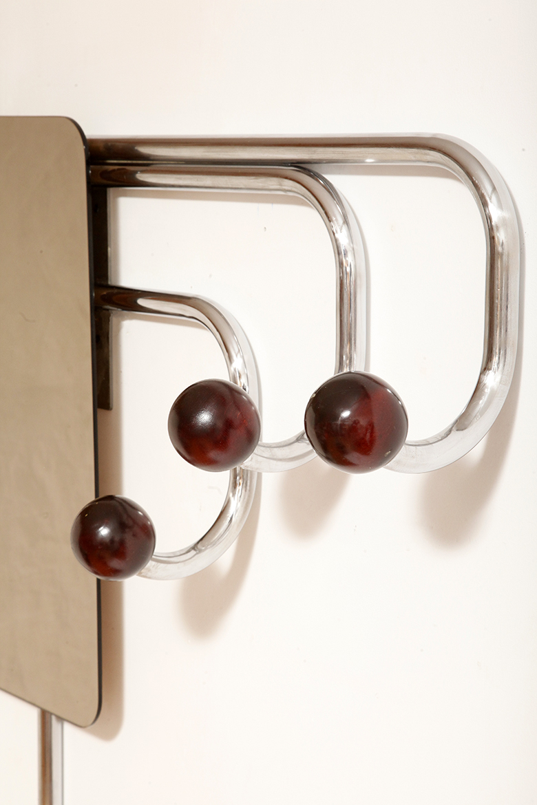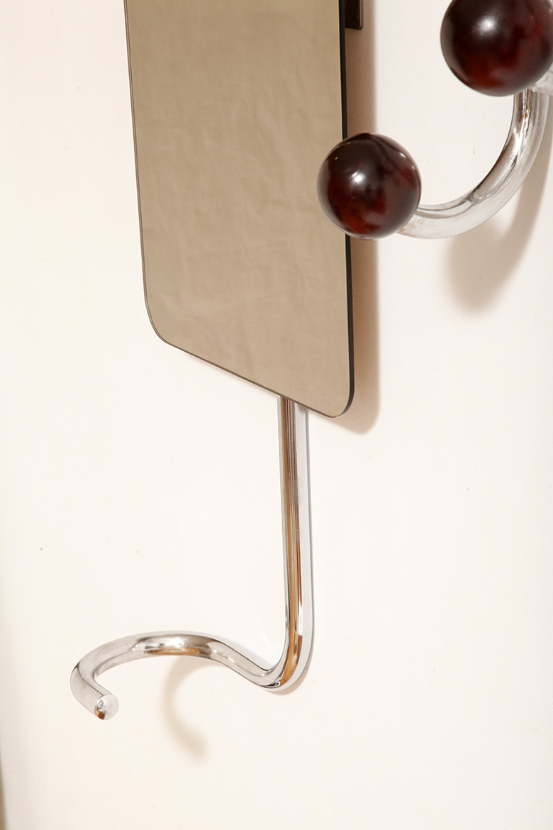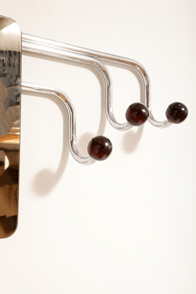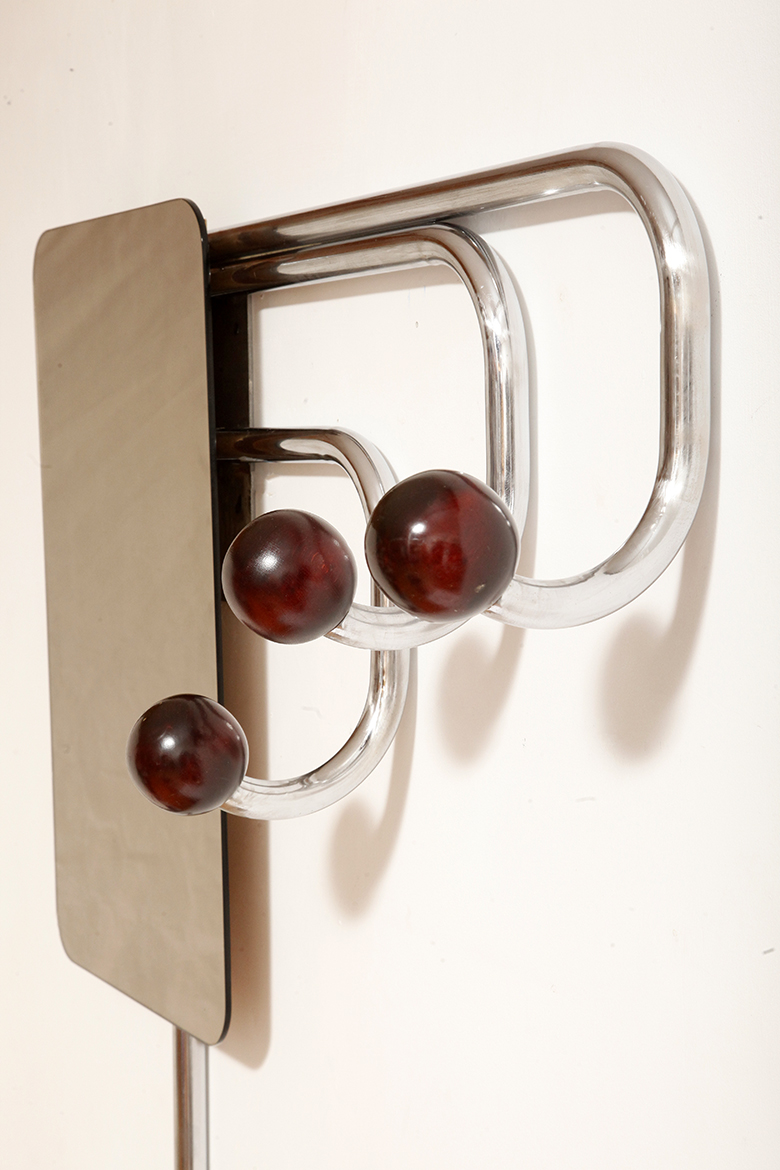 Duży metalowy wieszak/garderoba ścienna na chromowanej rurowej masywnej konstrukcji z trzema hakami zakończonymi bukowymi ręcznie toczonymi kulami, dymionym pionowym lustrem i uchwytem na parasole, Bauhaus, Niemcy, lata 30. XX wieku