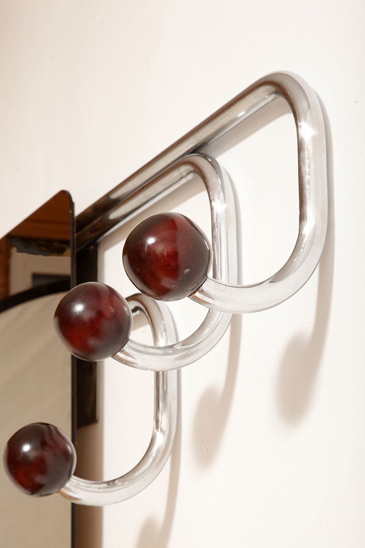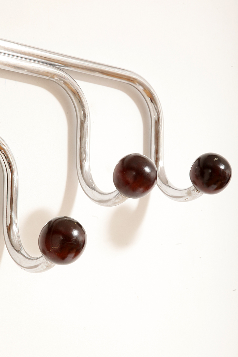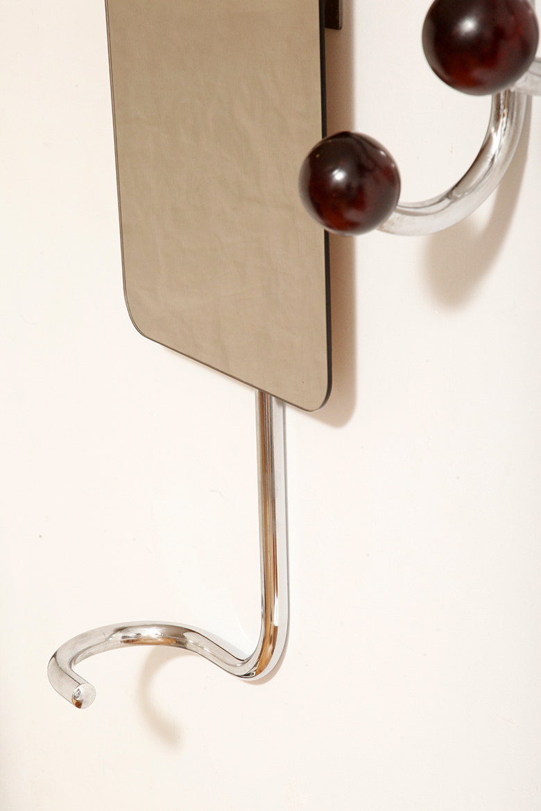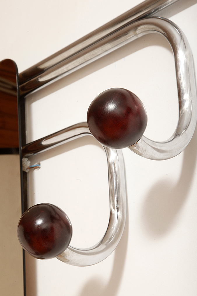 Duży metalowy wieszak/garderoba ścienna na chromowanej rurowej masywnej konstrukcji z trzema hakami zakończonymi bukowymi ręcznie toczonymi kulami, dymionym pionowym lustrem i uchwytem na parasole, Bauhaus, Niemcy, lata 30. XX wieku