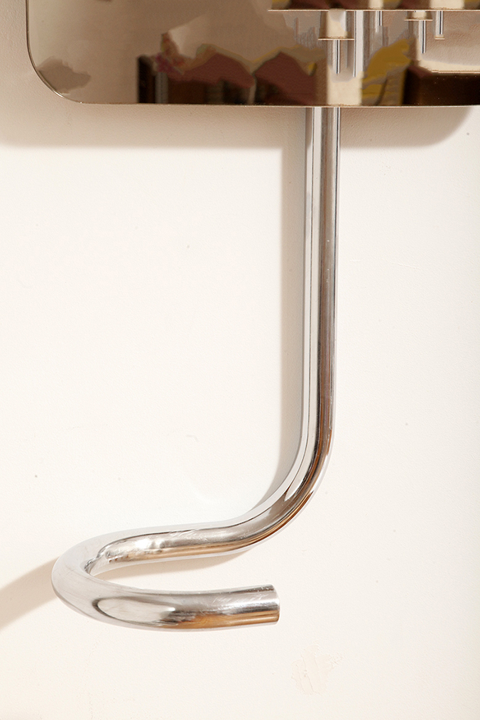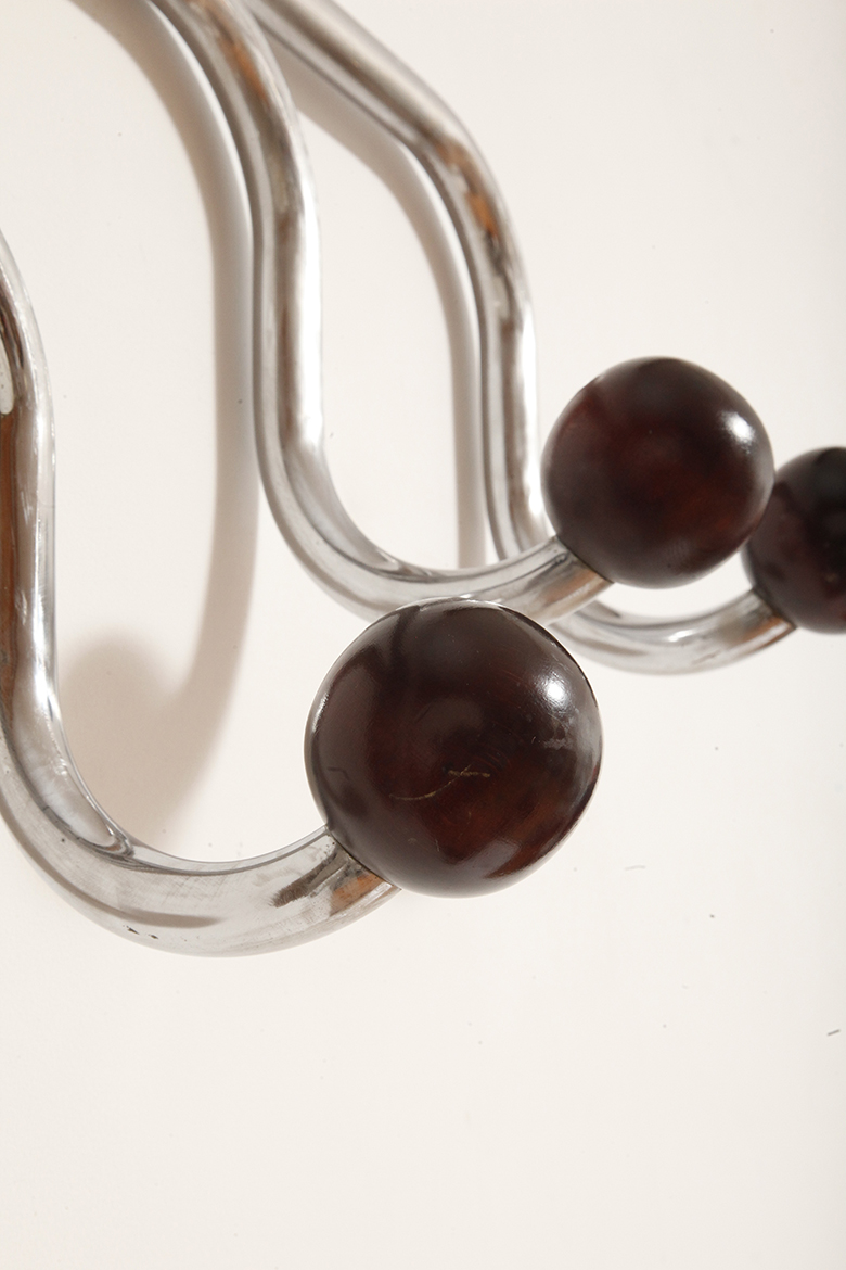 Ta pomysłowa, minimalistyczna, stalowa chromowana konstrukcja rurowa obejmuje 3 wieszaki na ubrania z toczonymi kulami bejcowanymi na ciemny brąz drewna bukowego, dymione lustro także wpadające w lekko brązowy odcień i zintegrowany z całością uchwyt na parasole.