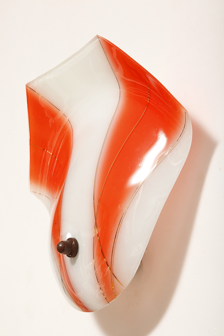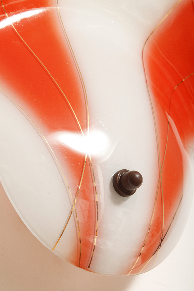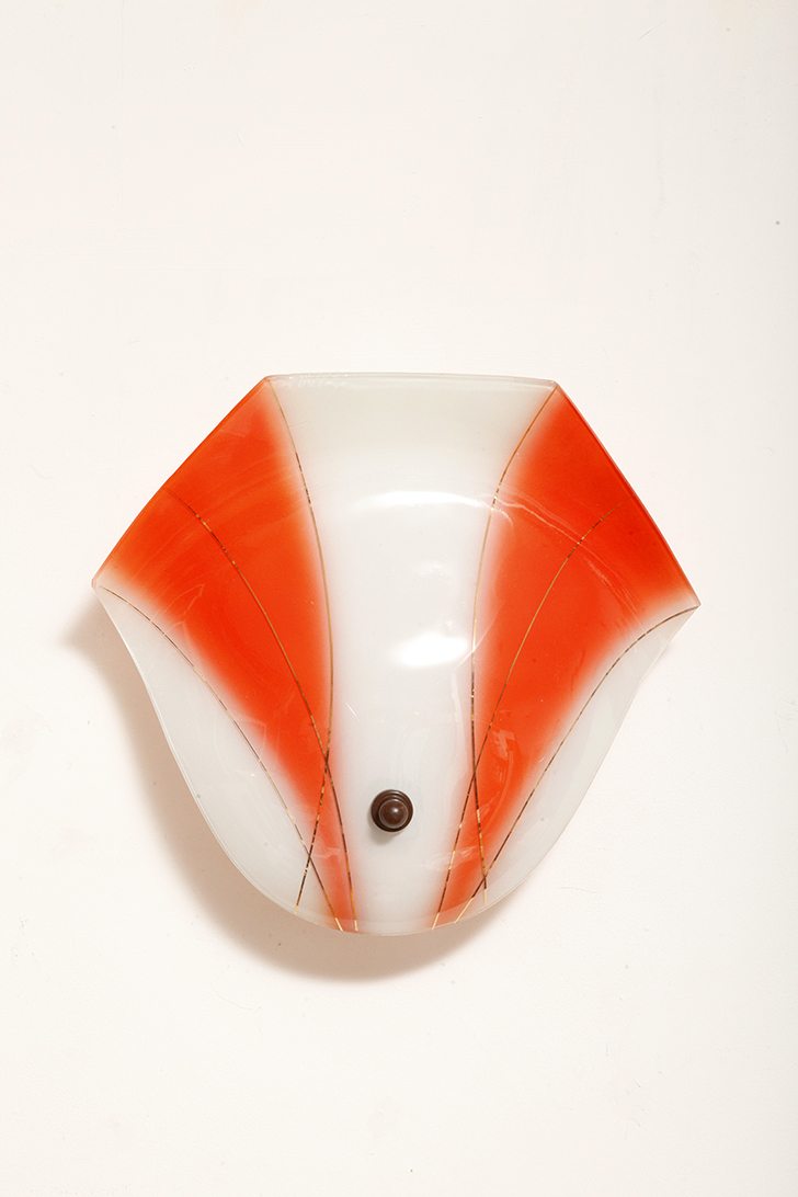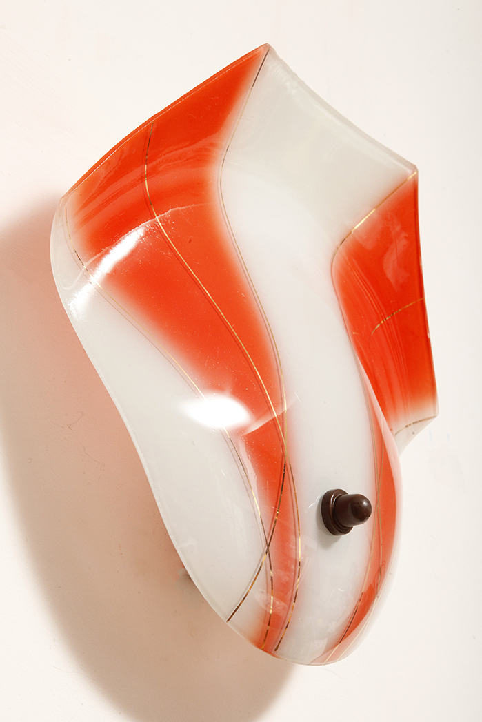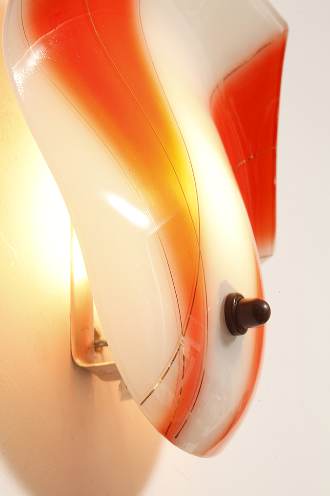 Duża mlecznobiało-czerwona jednopunktowa szklana lampa ścienna/kinkiet ze złoceniami w kształcie rozłożystego liścia, Polska, lata 60.