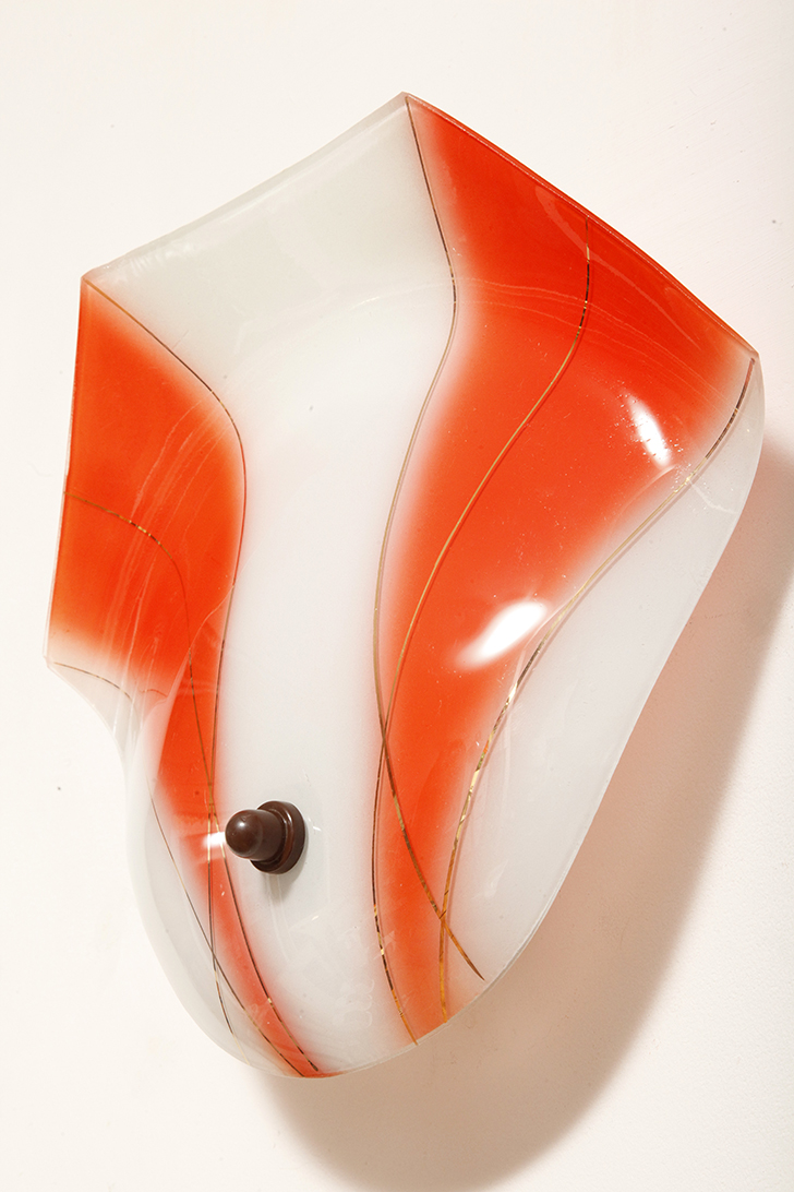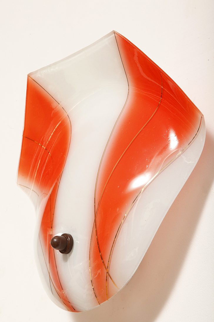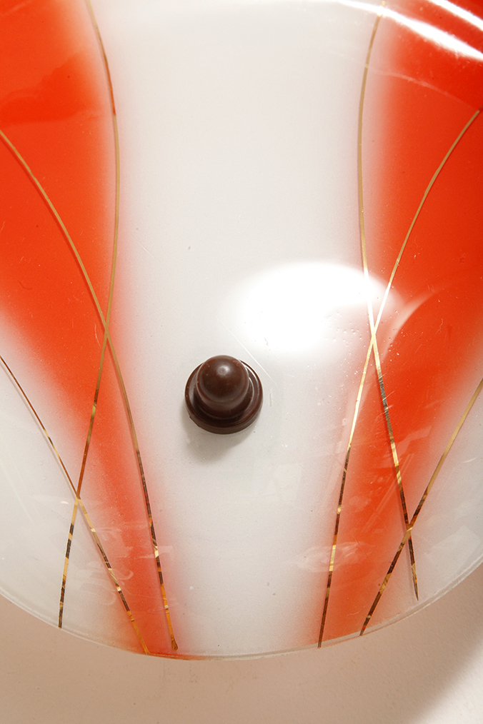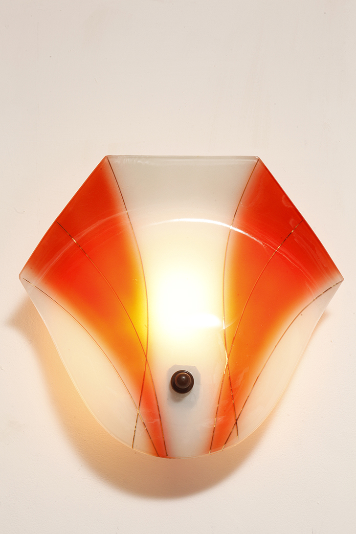 Duża mlecznobiało-czerwona jednopunktowa szklana lampa ścienna/kinkiet ze złoceniami w kształcie rozłożystego liścia, Polska, lata 60.