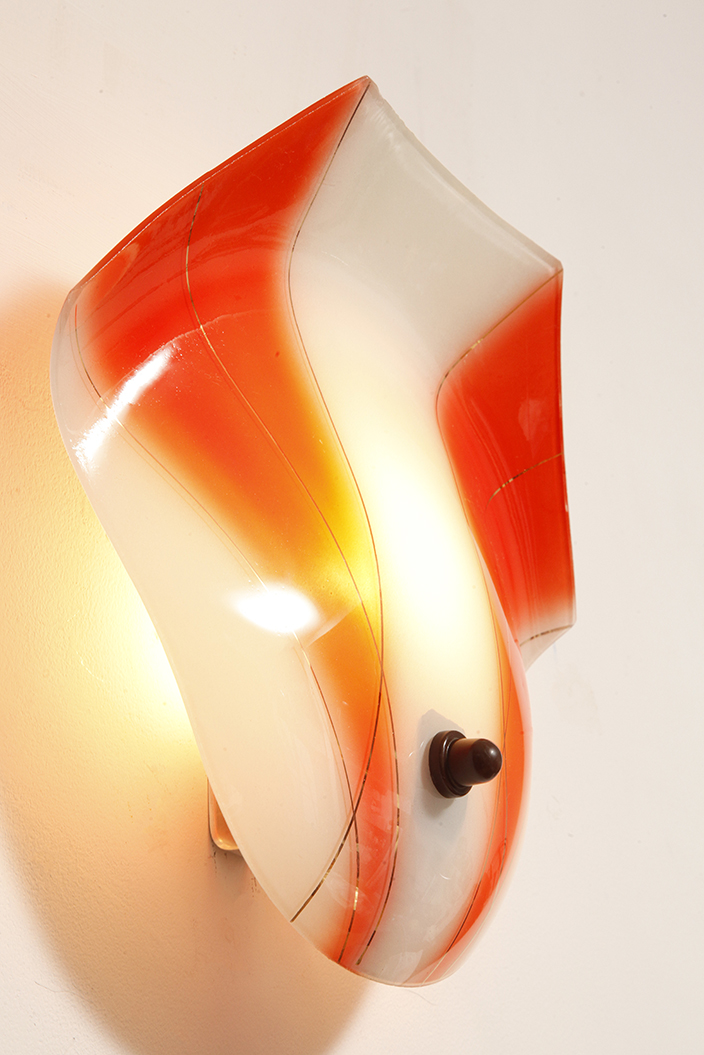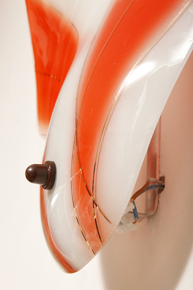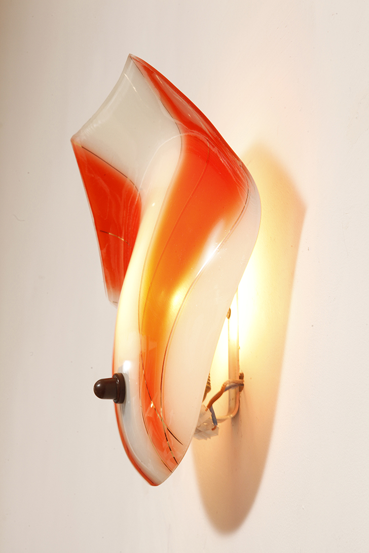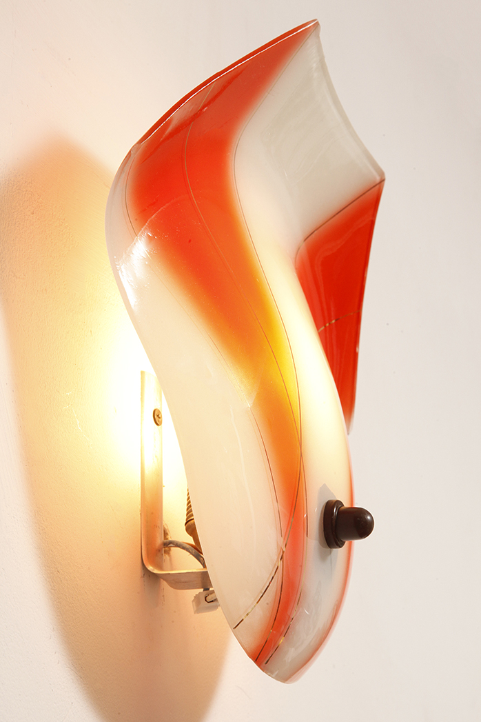 Bez ubytków, odprysków, zatrać. Czerwień świeża jakby kinkiet dopiero co był wyjęty z pudełka, zaraz po zakupie.
