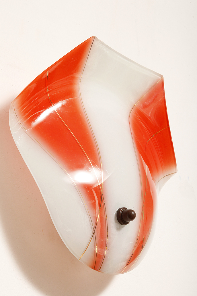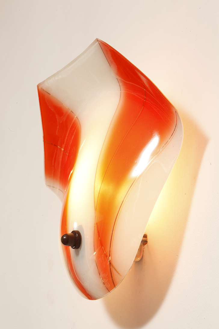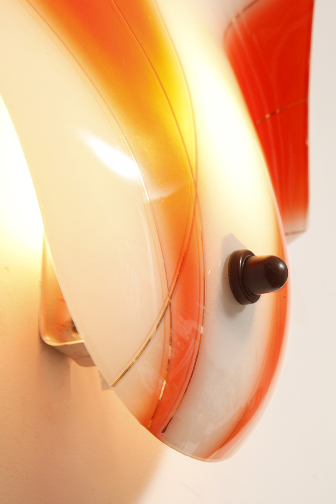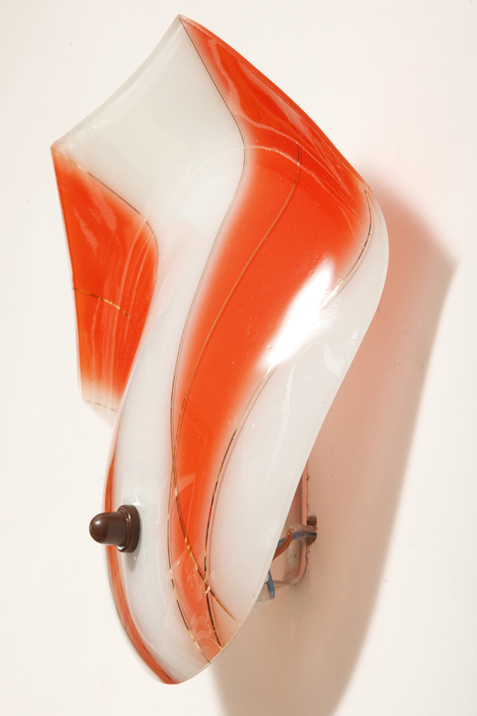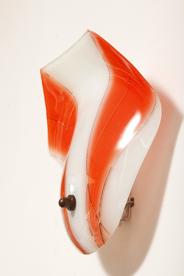 Bez ubytków, odprysków, zatrać. Czerwień świeża jakby kinkiet dopiero co był wyjęty z pudełka, zaraz po zakupie.